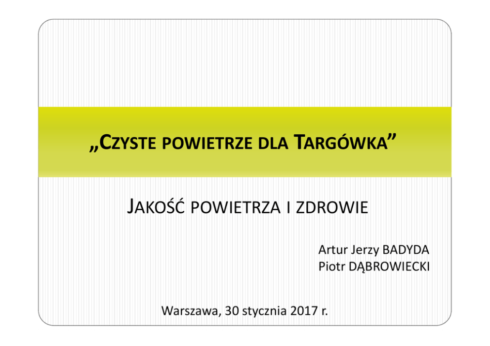 „CZYSTE POWIETRZE DLA TARGÓWKA” JAKOŚĆ POWIETRZA I ZDROWIE Artur Jerzy BADYDA Piotr DĄBROWIECKI Warszawa, 30 stycznia 2017 r. „CZYSTE POWIETRZE DLA TARGÓWKA” CZYM ODDYCHAMY? JAKOŚĆ POWIETRZA W POLSCE I W WARSZAWIE Artur Jerzy BADYDA Warszawa, 30 stycznia 2017 r. Wprowadzenie 3 DLACZEGO ZAJMUJEMY SIĘ ZANIECZYSZCZENIAMI POWIETRZA? o Stężenia zanieczyszczeń, jakie notuje się w powietrzu atmosferycznym w Polsce stanowią poważny problem Wizerunkowy Polska znajduje się w czołówkach krajów z najwyższymi stężeniami zanieczyszczeń powietrza na tle innych państw Unii Europejskiej Społeczny W Polsce notuje się jeden z najwyższych w UE wskaźników przedwczesnej umieralności z powodu zanieczyszczenia powietrza pyłem zawieszonym Administracyjno-prawny W Polsce brakuje sprawnych narzędzi administracyjnych i regulacji prawnych, które w efektywny sposób wyeliminowałyby problem wysokich stężeń zanieczyszczeń w powietrzu 4 ZANIECZYSZCZENIA POWIETRZA JAKO CZYNNIK RYZYKA o Zarówno w skali globalnej, jak i w Polsce, zanieczyszczenia powietrza (wewnętrznego i zewnętrznego) znajdują się w grupie 10 najważniejszych czynników ryzyka decydujących o przedwczesnych zgonach i życiu w warunkach niepełnosprawności 5 ZANIECZYSZCZENIA POWIETRZA JAKO CZYNNIK RYZYKA o Zarówno w skali globalnej, jak i w Polsce, zanieczyszczenia powietrza (wewnętrznego i zewnętrznego) znajdują się w grupie 10 najważniejszych czynników ryzyka decydujących o przedwczesnych zgonach i życiu w warunkach niepełnosprawności 6 ZANIECZYSZCZENIA POWIETRZA JAKO CZYNNIK RYZYKA o Zarówno w skali globalnej, jak i w Polsce, zanieczyszczenia powietrza (wewnętrznego i zewnętrznego) znajdują się w grupie 10 najważniejszych czynników ryzyka decydujących o przedwczesnych zgonach i życiu w warunkach niepełnosprawności 7 ZANIECZYSZCZENIA POWIETRZA JAKO CZYNNIK RYZYKA Kraj PM2,5 NO2 O3 Polska 48 270 1 610 1 150 EU-28 436 000 68 000 16 000 Europa 467 000 71 000 17 000 „Air quality in Europe – 2016 report”. EEA report, No 28/2016. ISSN: 1977-8449, doi: 10.2800/413142. European Environment Agency, Copenhagen 2016 8 Źródła emisji zanieczyszczeń do powietrza 9 PRESJA CZŁOWIEKA NA JAKOŚĆ POWIETRZA Główne źródło emisji SOx (57,5% w UE; 52,8% w PL) Główne źródło emisji Hg (39,7% w UE; 56,1% w PL) Istotne źródło emisji NOx (20,2% w UE; 33,5% w PL) 10 PRESJA CZŁOWIEKA NA JAKOŚĆ POWIETRZA Główne źródło emisji NMLZO (49,4% w UE; 43,1% w PL) Istotne źródło emisji Hg (20,4% w UE; 5,9% w PL) Istotne źródło emisji pyłów PM10 (16,9% w UE; 8,3% w PL) PM2,5 (10,3% w UE; 6,4% w PL) 11 PRESJA CZŁOWIEKA NA JAKOŚĆ POWIETRZA Główne źródło emisji NOx (39,4% w UE; 30,4% w PL) Istotne źródło emisji CO (21,3% w UE; 20,8 w PL) Istotne źródło emisji pyłów PM10 (11,5% w UE; 9,0% w PL) PM2,5 (13,1% w UE; 13,4% w PL) 12 PRESJA CZŁOWIEKA NA JAKOŚĆ POWIETRZA Główne źródło emisji pyłów PM10 (40,1% w UE; 52,1% w PL) PM2,5 (56,4% w UE; 55,8% w PL) Główne źródło emisji WWA (54,1% w UE; 86,0% !!! w PL) W tym BaP (70,6% w UE; 76,8% w PL) Główne źródło emisji CO (45,4% w UE; 64,9% w PL) Główne źródło emisji PCDD/PCDF (58,7% w PL) 13 ZWIĄZKI I SUBSTANCJE POWSTAJĄCE PRZY SPALANIU ODPADÓW ZIELONYCH 14 o Antracen o Benzofluoranten o Fenantren o Benzo[a]piren o Metyloantraceny o Benzo[e]piren o Fluoranten o Perylen o Piren o Indeno[1,2,3-cd]piren o Methylopiren o Benzo[g,h,j]perylen o Benzo[c]fenantren o Dibenzo[a,i]piren o Chryzen o Dibenzo[a,h]piren o Benzo[a]antracen o Koronen o Methylochryzen ZWIĄZKI I SUBSTANCJE POWSTAJĄCE PRZY SPALANIU ZUŻYTYCH OPON o o o o o o o o o o o o o o o o o o Aldehyd benzoesowy Benzen Benzodiazyny Benzofuran Benzotiofen Butadien Dihydroinden Ksyleny Dimetyloheksadien Dimetylopropylobenzen Propylobenzen metylowy Dimetylodihydroinden Etenylobenzen Etenylocycloheksen Etenylodimetylobenzen Etenylometylobenzen Etenylodimetylo cykloheksen Etenylometylobenzen 15 o o o o o o o o o o o o o o o o o o Etylobenzen Etylometylobenzen Etynylobenzen Etynylometylobenzen Izocyjanobenzen Limonen Toluen Metyloinden Metylotiofen Metyloetenylobenzen Dimetyloetenyolbenzen Dimetyloetylobenzen Metylopropylobenzen Etylenoinden Metyloetylobenzen Propylobenzen Styren Tetrametylobenzen o o o o o o o o o o o o o o o o o o Tiofen Trimetylobenzen 1-metylonaftalen 1,10-bifenylometyl 2-metylonaftalen Benzoizotiazol Benzo[b]tiofen Bifenyl Cyjanobenzen Dimetylobenzen Dimetylonaftalen Etylodimetylobenzen Heksahydroazepina Inden Izocyjanonaftalen Metylobenzaldehyd Fenol Propenylonaftalen o o o o o o o o o o o o o o o o o o Propenylometylobenzen Trimetylonaftalen Naftalen Acenaftylen Acenaftenowa Fluoren Fenantren Antracen Fluoranten Piren Benzo[a]antracen Chryzen Benzo[b]fluoranten Benzo[k]fluoranten Benzo[a]piren Dibenzo[a,h]antracen Benzo[g,h,j]perylen Indeno[1,2,3-cd]piren ZWIĄZKI I SUBSTANCJE POWSTAJĄCE PRZY SPALANIU ODPADÓW KOMUNALNYCH o o o o o o o o o o o o o o o o 16 1,3-butadien 2-butanon Benzen Chlorometan Etylobenzen m,p-ksylen Chlorek metylenu O-ksylen Styren Toluen 2,4,6-trichlorofenol 2,4-dichlorofenol 2,4-dimetylofenol 2,6-dichlorofenol 2-chlorofenol 2-metylonaftalen o o o o o o o o o o o o o o o o 2-krezol 3-krezol 4-krezol Acetofenon Alkohol benzylowy Bis(2-etyloheksylo)ftalan Di-n-butyloftalan Dibenzofuran Izoforon Pentachloronitrobenzen Fenol 1,3-dichlorobenzen 1,4-dichlorobenzen 1,2-dichlorobenzen 1,3,5-trichlorobenzen 1,2,4-trichlorobenzen o o o o o o o o o o o o o o o o 1,2,3-trichlorobenzen o 1,2,3,5-tetrachlorobenzen o 1,2,4,5-tetrachlorobenzen o 1,2,3,4-tetrachlorobenzen o 1,2,3,4,5-pentachlorobenzeno Heksachlorobenzen o Acenaften o Acenaftylen o Antracen o Benzo[a]antracen o Benzo[a]piren o Benzo[b]fluoranten o Benzo[g,h,i]perylen o Benzo[k]fluoranten o Chryzen o Dibenzo[a,h]antracen o Fluoranten Fluor Indeno[1,2,3-cd]piren Naftalen Fenantren Piren Aldehyd octowy Aceton Akryloaldehyd Benzoaldehyd Aldehyd masłowy Aldehyd kr