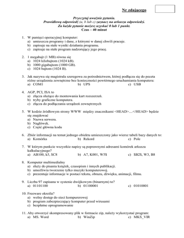 Nr zdającego Przeczytaj uważnie pytania. Prawidłową odpowiedź (a, b lub c) zaznacz na arkuszu odpowiedzi. Za każde pytanie możesz uzyskać 0 lub 1 punkt. Czas – 40 minut 1. W pamięci operacyjnej komputer: a) umieszcza programy i dane, z którymi w danej chwili pracuje. b) zapisuje na stałe wyniki działania programu. c) zapisuje na stałe program nadzorujący jego pracę. 2. 1 megabajt (1 MB) równa się a) 1024 kilobajtom (1024 kB). b) 1000 gigabajtom (1000 GB). c) 1024 bajtom (1024 B). 3. Jak nazywa się magistrala szeregowa za pośrednictwem, której podłącza się do peceta różne urządzenia zewnętrzne bez konieczności powtórnego uruchamiania komputera: a) COM1 b) UPS c) USB 4. AGP, PCI, ISA to a) złącza służące do montowania kart rozszerzeń. b) tryby graficzne komputera. c) złącza do podłączania urządzeń zewnętrznych 5. W kodzie źródłowym strony WWW między znacznikami <HEAD>....</HEAD> będzie się znajdować a) Nazwa serwera. b) Nagłówek. c) Część główna kodu 6. Zbiór informacji na temat jednego obiektu umieszczony jako wiersz tabeli bazy danych to: a) Komórka b) Rekord c) Pole 7. W którym punkcie wszystkie napisy są poprawnymi adresami komórek arkusza kalkulacyjnego? a) AB100, k5, $C8 b) A7, K001, W5$ c) $B2$, W3, B8 8. Komputer multimedialny a) służy do pisania książek, czasopism i innych publikacji. b) umożliwia tworzenie tylko muzyki komputerowej. c) prezentuje informacje w postaci tekstu, obrazu, dźwięku, animacji, filmu. 9. Liczba 97 zapisana w systenie dwójkowym (binarnym) to? a) 01101100 b) 01100001 c) 01010001 10. Freeware określa? a) wolny dostęp do sieci kompurerowej b) program zabezpieczający komputer przed wirusami c) bezpłatne oprogramowanie 11. Aby otworzyć skompresowany plik w formacie zip, należy wykorzystać program: a) MS. Word b) WinZip c) MKS_VIR 12. Które z określeń wskazuje na sieć rozległą? a) LAN b) WAN c) MAN 13. Twardą spacje uzyskasz po naciśnięciu? a) spacja + Ctrl b) spacja+ Shift c) spacja + Shift + Ctrl 14. Słowo "kompatybilny" oznacza? a) konieczny b) zgodny c) poprawny 15. Który z podanych formatów graficznych oferuje grafikę skalowaną: a) .bmp b) .cdr c) .gif 16. Piksel to a) jedna litera wyświetlana na ekranie monitora. b) jednostka pojemności pamięci komputera. c) punkt świetlny na ekranie monitora, najmniejszy element każdego obrazu. 17. Porządkowanie plików na dysku to: a) defragmentacja, b) konwersja, c) kompresja 18. Do obsługi poczty elektronicznej służy program: a) Internet Explorer b) Outlook Express c) Excel 19. Adres IP zazwyczaj zapisuje się w postaci: a) 16 liczb b) 3 liczb oddzielonymi kropkami c) 4 liczb oddzielonymi kropkami 20. Co rozumiesz pod pojęciem sektora dyskietki? a) miejsce, gdzie na części zewnętrznej dyskietki można nakleić etykietkę b) sektor to obszar o stałej wielkości 512 bajtów c) okienko w górnej części dyskietki powodujące zwolnienie lub jej zablokowanie Wojnicz 2010-03-09