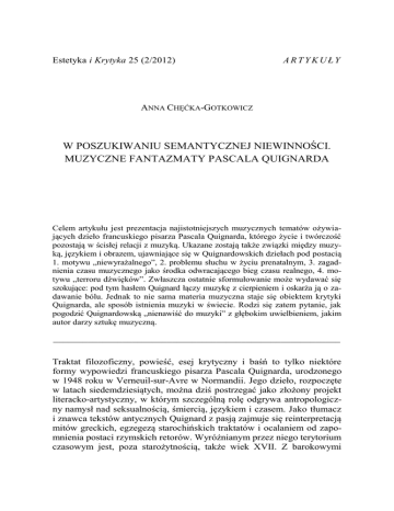 Estetyka i Krytyka 25 (2/2012) ARTYKUŁY ANNA CHĘĆKA-GOTKOWICZ W POSZUKIWANIU SEMANTYCZNEJ NIEWINNOŚCI. MUZYCZNE FANTAZMATY PASCALA QUIGNARDA Celem artykułu jest prezentacja najistotniejszych muzycznych tematów ożywiających dzieło francuskiego pisarza Pascala Quignarda, którego życie i twórczość pozostają w ścisłej relacji z muzyką. Ukazane zostają także związki między muzyką, językiem i obrazem, ujawniające się w Quignardowskich dziełach pod postacią 1. motywu „niewyrażalnego”, 2. problemu słuchu w życiu prenatalnym, 3. zagadnienia czasu muzycznego jako środka odwracającego bieg czasu realnego, 4. motywu „terroru dźwięków”. Zwłaszcza ostatnie sformułowanie może wydawać się szokujące: pod tym hasłem Quignard łączy muzykę z cierpieniem i oskarża ją o zadawanie bólu. Jednak to nie sama materia muzyczna staje się obiektem krytyki Quignarda, ale sposób istnienia muzyki w świecie. Rodzi się zatem pytanie, jak pogodzić Quignardowską „nienawiść do muzyki” z głębokim uwielbieniem, jakim autor darzy sztukę muzyczną. __________________________________________________________ Traktat filozoficzny, powieść, esej krytyczny i baśń to tylko niektóre formy wypowiedzi francuskiego pisarza Pascala Quignarda, urodzonego w 1948 roku w Verneuil-sur-Avre w Normandii. Jego dzieło, rozpoczęte w latach siedemdziesiątych, można dziś postrzegać jako złożony projekt literacko-artystyczny, w którym szczególną rolę odgrywa antropologiczny namysł nad seksualnością, śmiercią, językiem i czasem. Jako tłumacz i znawca tekstów antycznych Quignard z pasją zajmuje się reinterpretacją mitów greckich, egzegezą starochińskich traktatów i ocalaniem od zapomnienia postaci rzymskich retorów. Wyróżnianym przez niego terytorium czasowym jest, poza starożytnością, także wiek XVII. Z barokowymi 32 Anna Chęćka-Gotkowicz _______________________________________________________________________________________________________________________________________________________________________________________________________________ artystami czuje się na tyle duchowo spokrewniony, że sam wielokrotnie wyrażał pragnienie „bycia czytanym w 1640 roku”. To wyznanie wiele wyjaśnia współczesnym czytelnikom, którym Quignardowski styl może się wydać udziwniony i manieryczny. Genezy fragmentaryczności jego narracji należałoby poszukiwać w fascynacji eseistyką tworzącego w XVII wieku moralisty Jeana de la Bruyère’a. To temu autorowi Quignard poświęcił rozprawę noszącą wymowny tytuł O technicznym zakłopotaniu względem fragmentów1. Na Quignardowskie myślenie obrazami, które łączy go z takimi imagologami XX wieku jak Georges Bataille czy Pierre Klossowski, niewątpliwy wpływ miało barokowe malarstwo Georges’a de la Tours i Lubina Baugina. Te inspiracje widać nie tylko w Nocy seksualnej, gdzie autor buduje opowieść wokół obrazów, ale także we Wszystkich porankach świata. Nie tylko książka, ale także powstały w asyście Quignarda film Alaina Corneau przesycone są kolorystyką i światłocieniami barokowych obrazów. To, że autor często wywodzi swoje opowieści z malowideł, stwarza pokusę myślenia o nim jak o ikonofilu2. Lecz poza tym, co widzialne, fascynuje go także to, co słyszalne. Motywy muzyczne są stale obecne zarówno w jego książkach (zaznaczmy, że dzieło Quignarda liczy dziś ponad pięćdziesiąt tytułów – z czego na język polski przełożono dotąd siedem3), jak i w życiu. Wystarczy przypomnieć, że to on w 1992 roku powołał do istnienia Festiwal Oper i Teatru Barokowego w Wersalu. Jest także muzykiem praktykiem: gra na organach i wiolonczeli. Szczególnym sentymentem darzy violę da gamba, instrument, który stał się bohaterem jego dwóch muzycznych książek, Lekcji muzyki i Wszystkich poranków świata. Muzyczność tekstów Quignarda objawia się nie tylko w materii fabularnej, lecz także w melodyce i rytmice jego 1 P. Quignard Une gêne technique à l’égard des fragments: essai sur Jean de la Bruyère Paris 2005. 2 Z takim postrzeganiem Quignardowskiej pochwały obrazów nie zgadza się Tomasz Swoboda, autor książki Historie oka. Bataille, Leiris, Artaud, Blanchot. Przywołując znaną polskiemu czytelnikowi Noc seksualną, zauważa, że „wszystkie obrazy wybrane przez Quignarda do tej książki świadczą […] o niemożności widzenia i pokazywania”; podkreśla, że autor Nocy seksualnej nie wierzy w mimetyczną siłę obrazu. Zgadzam się ze Swobodą, gdy twierdzi, że główną troską Quignarda jest „wyrażenie niewidzialnego przez widzialne”, czyli dotarcie do tego, co w obrazie ukryte, do tego, o czym obraz milczy. Można dodać, że Quignard podobnie postrzega rolę muzyki i literatury, które mają odbiorcę przybliżyć do tego, co „niewyrażalne”. Por. T. Swoboda Historie oka. Bataille, Leiris, Artaud, Blanchot Gdańsk 2010 s. 267. 3 Są to następujące tytuły: Wszystkie poranki świata K. Szeżyńska-Maćkowiak (tł.) Warszawa 1997, Albucjusz T. Komendant (tł.) Warszawa 2002, Seks i trwoga K. Rutkowski (tł.) Warszawa 2002, Błędne cienie T. Komendant (tł.) Warszawa 2004, Życie sekretne K. Rutkowski (tł.) Poznań 2006, Taras w Rzymie K. Rutkowski (tł.) Poznań 2006, Noc seksualna K. Rutkowski (tł.) Gdańsk 2008. W poszukiwaniu semantycznej niewinności... 33 _______________________________________________________________________________________________________________________________________________________________________________________________________________ prozy, a jej głębsza analiza pozwala dostrzec ślady technik kompozytorskich także w formie prowadzenia narracji. Moim zadaniem w tym szkicu będzie rekonstrukcja tych dźwiękowych fantazmatów, które w twórczości autora Wszystkich poranków świata brzmią szczególnie wyraźnie. Zajmę się wątkami, które autor przywołuje w swoich książkach wie