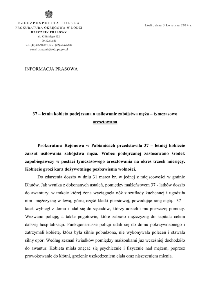 RZECZPOSPOLITA POLSKA PROKURATURA OKRĘGOWA W ŁODZI Łódź, dnia 3 kwietnia 2014 r. RZE CZNIK PRASOWY ul. Kilińskiego 152 90-322 Łódź tel.: (42) 67-68-771, fax.: (42) 67-68-607 e-mail : [email protected] INFORMACJA PRASOWA 37 – letnia kobieta podejrzana o usiłowanie zabójstwa męża – tymczasowo aresztowana Prokuratura Rejonowa w Pabianicach przedstawiła 37 – letniej kobiecie zarzut usiłowania zabójstwa męża. Wobec podejrzanej zastosowano środek zapobiegawczy w postaci tymczasowego aresztowania na okres trzech miesięcy. Kobiecie grozi kara dożywotniego pozbawienia wolności. Do zdarzenia doszło w dniu 31 marca br. w jednej z miejscowości w gminie Dłutów. Jak wynika z dokonanych ustaleń, pomiędzy małżeństwem 37 - latków doszło do awantury, w trakcie której żona wyciągnęła nóż z szuflady kuchennej i ugodziła nim mężczyznę w lewą, górną część klatki piersiowej, powodując ranę ciętą. 37 – latek wybiegł z domu i udał się do sąsiadów, którzy udzielili mu pierwszej pomocy. Wezwano policję, a także pogotowie, które zabrało mężczyznę do szpitala celem dalszej hospitalizacji. Funkcjonariusze policji udali się do domu pokrzywdzonego i zatrzymali kobietę, która była silnie pobudzona, nie wykonywała poleceń i stawała silny opór. Według zeznań świadków pomiędzy małżonkami już wcześniej dochodziło do awantur. Kobieta miała znęcać się psychicznie i fizycznie nad mężem, poprzez prowokowanie do kłótni, grożenie uszkodzeniem ciała oraz niszczeniem mienia. 2 Na wniosek prokuratora zastosowano środek zapobiegawczy w postaci tymczasowego aresztowania na okres trzech miesięcy. Sąd uznał, że istnieją uzasadnione obawy, iż podejrzana może dopuścić się kolejnego zamachu na życie i zdrowie męża. Przeprowadzone zostanie badanie sądowo – psychiatryczne, mające na celu ocenę poczytalności. Rzecznik Prasowy Prokuratury Okręgowej w Łodzi Krzysztof Kopania
