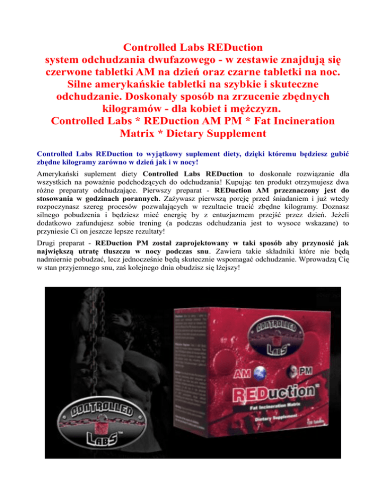 Controlled Labs REDuction system odchudzania dwufazowego - w zestawie znajdują się czerwone tabletki AM na dzień oraz czarne tabletki na noc. Silne amerykańskie tabletki na szybkie i skuteczne odchudzanie. Doskonały sposób na zrzucenie zbędnych kilogramów - dla kobiet i mężczyzn. Controlled Labs * REDuction AM PM * Fat Incineration Matrix * Dietary Supplement Controlled Labs REDuction to wyjątkowy suplement diety, dzięki któremu będziesz gubić zbędne kilogramy zarówno w dzień jak i w nocy! Amerykański suplement diety Controlled Labs REDuction to doskonałe rozwiązanie dla wszystkich na poważnie podchodzących do odchudzania! Kupując ten produkt otrzymujesz dwa różne preparaty odchudzające. Pierwszy preparat - REDuction AM przeznaczony jest do stosowania w godzinach porannych. Zażywasz pierwszą porcję przed śniadaniem i już wtedy rozpoczynasz szereg procesów pozwalających w rezultacie tracić zbędne kilogramy. Doznasz silnego pobudzenia i będziesz mieć energię by z entuzjazmem przejść przez dzień. Jeżeli dodatkowo zafundujesz sobie trening (a podczas odchudzania jest to wysoce wskazane) to przyniesie Ci on jeszcze lepsze rezultaty! Drugi preparat - REDuction PM został zaprojektowany w taki sposób aby przynosić jak największą utratę tłuszczu w nocy podczas snu. Zawiera takie składniki które nie będą nadmiernie pobudzać, lecz jednocześnie będą skutecznie wspomagać odchudzanie. Wprowadzą Cię w stan przyjemnego snu, zaś kolejnego dnia obudzisz się lżejszy! • • • • • Sposób działania odżywki na redukcję tkanki tłuszczowej CL REDuction: Nasila utlenianie tkanki tłuszczowej. Zmniejsza apetyt. Podnosi poziom energii i wytrzymałość organizmu. Nasila termogenezę. Przyspiesza regenerację organizmu. Dlaczego Controlled Labs Reduction jest lepszy niż inne termogeniki i tabletki na odchudzanie? Najczęściej preparaty wspomagające łaknienie przeznaczone są do stosowania w dzień. Odradza się natomiast zażywania ich w godzinach wieczornych. Tabletki na odchudzanie Controlled Labs REDuction to preparat złożony do stosowania zarówno w dzień jak i w nocy! Silne i skuteczne tabletki na odchudzanie to doskonała odżywka do stosowania w trakcie redukcji zbędnego fatu. Należy jednak pamiętać, aby termogeniki, w tym Reduction od Controlled Labs stosować w cyklu 4-8 tygodni, po czym należy zrobić 2-tygodniową przerwę. Dawkowanie oraz sposób użycia odżywki na rzeźbę oraz w trakcie redukcji: Przez pierwsze 2-3 dni stosuj 1 czerwoną tabletkę przed śniadaniem i 1 czarną tabletki przed snem. Jeżeli będziesz mieć problemy z ciśnieniem lub zawroty głowy skonsultuj dalsze stosowanie preparatu z lekarzem. Jeżeli w okresie 2-3 dni od rozpoczęcia stosowanie nie wystąpią żadne niekorzystne objawy wówczas należy stosować 2 czerwone tabletki przed śniadaniem i 2 czarne tabletki przed snem. Opis i charakterystyka termogenika z USA REDuction: • 1 porcja = 2 czerwone tabletki AM + 2 czarne tabletki PM odżywki • Ilość porcji w opakowaniu: 30 • Zawartość opakowania: 60 czerwonych tabletek AM + 60 czarnych tabletek PM suplementu żywności Skład produktu REDuction: Zawartość REDuction AM: w jednej porcji (2 tabletki) Red Sweat Thermo Complex Raspberry Ketones (Rubus Idaeus), Big Red™ (Cayenne Fruit Extract), Citrus Auratium Extract (60% Synephrine Alkaloids), Bioperine® (Piper Nigrum) 380 mg STIMuSLIM™ PEA (Phenylethylamine Hcl), Gamma-Aminobutyric Acid (GABA), Taraxacum Officinale Extract (From Root), Natural Caffeine (200mg), Isobutyryl-Thiamine Disulfide, Cocoa Bean (Extracted For 99% Theobromine), Citrus Auratium Extract (95% Hordenine) 1700mg Inne składniki: Maltodextrin, Magnesium Stearate, And Artificial Colors. Zawartość REDuction PM: w jednej porcji (2 tabletki) HungeReduction Complex™ Cordia Salicifolia Extract, Raspberry Ketones (Rubus Idaeus), Ginger Root (Extracted For 20% Gingerols And Shogaols), Big Red™ (Cayenne Fruit Extract), Olive Leaf (Olea Europaea Extracted For Oleuropein) 925mg SLEEP N' SLIM Complex™ Gamma-Aminobutyric Acid (GABA), Taraxacum Officinale Extract (From Root), Valeriana Officinalis Root Extract, L-Theanine, Griffonia Seed Extract. 1300mg Inne składniki: Maltodextrin, Magnesium Stearate, And Artificial Colors. www.kulturystyka.sklep.pl
