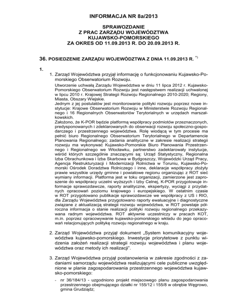 INFORMACJA NR 8a/2013 SPRAWOZDANIE Z PRAC ZARZĄDU WOJEWÓDZTWA KUJAWSKO-POMORSKIEGO ZA OKRES OD 11.09.2013 R. DO 20.09.2013 R. 36. POSIEDZENIE ZARZĄDU WOJEWÓDZTWA Z DNIA 11.09.2013 R. *) 1. 1. Zarząd Województwa przyjął informację o funkcjonowaniu Kujawsko-Pomorskiego Obserwatorium Rozwoju. Utworzenie uchwałą Zarządu Województwa w dniu 11 lipca 2012 r. KujawskoPomorskiego Obserwatorium Rozwoju jest następstwem realizacji uchwalonej w lipcu 2010 r. Krajowej Strategii Rozwoju Regionalnego 2010-2020; Regiony, Miasta, Obszary Wiejskie. Jednym z jej postulatów jest monitorowanie polityki rozwoju poprzez nowe instytucje: Krajowe Obserwatorium Rozwoju w Ministerstwie Rozwoju Regionalnego i 16 Regionalnych Obserwatoriów Terytorialnych w urzędach marszałkowskich. Założono, że K-POR będzie platformą współpracy podmiotów przeznaczonych, predysponowanych i zdeklarowanych do obserwacji rozwoju społeczno-gospodarczego i przestrzennego województwa. Rolę wiodącą w tym procesie ma pełnić biuro Regionalnego Obserwatorium Terytorialnego w Departamencie Planowania Regionalnego; zadania analityczne w zakresie realizacji strategii rozwoju ma wykonywać Kujawsko-Pomorskie Biuro Planowania Przestrzennego i Regionalnego we Włocławku, partnerstwo zadeklarowały instytucje, wśród których szczególnie znaczącymi są: Urząd Statystyczny, Regionalna Izba Obrachunkowa i Izba Skarbowa w Bydgoszczy, Wojewódzki Urząd Pracy, Agencja Restrukturyzacji i Modernizacji Rolnictwa w Toruniu, Kujawsko-Pomorski Ośrodek Doradztwa Rolniczego i inne, deklaracje współpracy złożyły prawie wszystkie urzędy gminne i powiatowe regionu organizując z ROT sieć wymiany informacji. Platforma jest w toku organizacji, zamierzone jest zaproszenie do współpracy uczelni wyższych i Izby Celnej, K-POR przygotowuje informacje sprawozdawcze, raporty analityczne, ekspertyzy, wyciągi z przydatnych opracowań poziomu krajowego i europejskiego. W ostatnim czasie w ROT przygotowano publikacje sprawozdawcze we współpracy z US i RIO, dla Zarządu Województwa przygotowano raporty ewaluacyjne i diagnostyczne związane z aktualizacją strategii rozwoju województwa, w ROT powstaje półroczna informacja o stanie realizacji polityki rozwoju regionalnego przekazywana radnym województwa. ROT aktywnie uczestniczy w pracach KOT, m.in. poprzez opracowywanie kujawsko-pomorskiego wkładu do jego opracowań relacjonujących politykę rozwoju regionalnego w kraju. 2. Zarząd Województwa przyjął dokument „System komunikacyjny województwa kujawsko-pomorskiego. Inwestycje priorytetowe z punktu widzenia założeń realizacji strategii rozwoju województwa i planu województwa oraz metody ich realizacji”. 3. Zarząd Województwa przyjął postanowienia w zakresie zgodności z zadaniami samorządu województwa realizującymi cele publiczne uwzględnione w planie zagospodarowania przestrzennego województwa kujawsko-pomorskiego: - nr 36/184/13 - uzgodniono projekt miejscowego planu zagospodarowania przestrzennego obejmującego działki nr 155/12 i 155/8 w obrębie Węgrowo, gmina Grudziądz; 2 - nr 36/185/13 - uzgodniono projekt miejscowego planu zagospodarowania przestrzennego „Kobylarnia VI” obejmującego obszar części wsi Kobylarnia, gmina Nowa Wieś Wielka; - nr 36/186/13 - uzgodniono projekt miejscowego planu zagospodarowania przestrzennego dla działek położonych w północnej i w północno-zachodniej części miejscowości Czarne Błoto, gmina Zławieś Wielka. 4. Zarząd Województwa przyjął postanowienia w zakresie zgodności z ustaleniami Planu zagospodarowania przestrzennego województwa kujawsko-pomorskiego: - nr 36/187/13 - uzgodniono projekt zmiany Studium uwarunkowań i kierunków zagospodarowania przestrzennego gminy Łubianka; - nr 36/188/13 - odmówiono uzgodnienia projektu Studium uwarunkowań i kierunków zagospodarowania przestrzennego gminy Lniano. 5. Zarząd Województwa przyjął postanowienia w zakresie energetyki: - nr 36/189/13 - zaopiniowano negatywnie udzielenie promesy koncesji na wytwarzanie energii elektrycznej przez przedsiębiorcę ELEKTROWIATR s.c. przy użyciu elektrowni wiatrowej o mocy zainstalowanej 1 MW w m. Plemięta, gm. Gruta; - nr 36/190/13 - zaopiniowano pozytywnie projekt planu rozwoju w zakresie obecnego i przyszłego zapotrzebowania na paliwa gazowe na lata 20142018 przedsiębiorstwa PGNiG SPV4 Sp. z o.o. 2. Przyjęcie projektu uchwały i stanowiska Sejmiku Województwa - Druk nr 134/13 - projekt uchwały zmieniającej uchwałę w sprawie udzielenia w roku 2013 w drugim terminie dotacji na prace konserwatorskie, restauratorskie lub roboty budowlane przy zabytkach wpisanych do rejestru zabytków położonych na obszarze Województwa Kujawsko-Pomorskiego; - projekt stanowiska Sejmiku w sprawie Wstępnej listy przedsięwzięć do projektu mandatu negocjacyjnego Kontraktu Terytorialnego województwa kujawsko-pomorskiego. 3. Uchwały Zarządu Województwa 1. Nr 36/1338/13 - wyrażono zgodę Zarządowi Dróg Wojewódzkich w Bydgoszczy na wystąpienie o uzyskanie zezwolenia na usunięcie drzew w Brodnicy, ul. Sienkiewicza. 2. Nr 36/1339/13 - wyznaczono Urząd Marszałkowski Województwa Kujawsko-Pomorskiego do przeprowadzenia postępowania o udzielenie zamówienia publicznego na zakup usług telekomunikacyjnych w zakresie telefonii mobilnej oraz mobilnego dostępu do internetu dla wojewódzkich jednostek organizacyjnych. 3. Nr 36/1340/13 - wszczęto postępowanie o udzielenie zamówienia publicznego na zakup usług telekomunikacyjnych w zakresie telefonii mobilnej oraz mobilnego dostępu do Internetu. 3 4. Nr 36/1341/13 - wyrażono zgodę Specjalnemu Ośrodkowi Szkolno-Wychowawczemu im. J. Korczaka, ul. Żwirki i Wigury 15 i 21 w Toruniu, na wystąpienie o uzyskanie zezwolenia na usunięcie drzew. 5. Nr 36/1342/13 - zmieniono załącznik do uchwały Nr 9/238/13 Zarządu Województwa Kujawsko-Pomorskiego z dnia 27 lutego 2013 r. w sprawie zatwierdzenia harmonogram