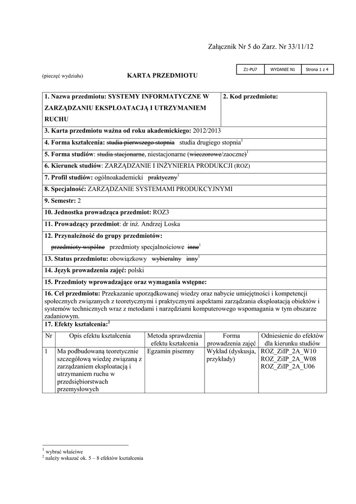 Załącznik Nr 5 do Zarz. Nr 33/11/12 Z1-PU7 (pieczęć wydziału) WYDANIE N1 Strona 1 z 4 KARTA PRZEDMIOTU 1. Nazwa przedmiotu: SYSTEMY INFORMATYCZNE W 2. Kod przedmiotu: ZARZĄDZANIU EKSPLOATACJĄ I UTRZYMANIEM RUCHU 3. Karta przedmiotu ważna od roku akademickiego: 2012/2013 4. Forma kształcenia: studia pierwszego stopnia studia drugiego stopnia1 5. Forma studiów: studia stacjonarne, niestacjonarne (wieczorowe/zaoczne)1 6. Kierunek studiów: ZARZĄDZANIE I INŻYNIERIA PRODUKCJI (ROZ) 7. Profil studiów: ogólnoakademicki praktyczny1 8. Specjalność: ZARZĄDZANIE SYSTEMAMI PRODUKCYJNYMI 9. Semestr: 2 10. Jednostka prowadząca przedmiot: ROZ3 11. Prowadzący przedmiot: dr inż. Andrzej Loska 12. Przynależność do grupy przedmiotów: przedmioty wspólne przedmioty specjalnościowe inne1 13. Status przedmiotu: obowiązkowy wybieralny inny1 14. Język prowadzenia zajęć: polski 15. Przedmioty wprowadzające oraz wymagania wstępne: 16. Cel przedmiotu: Przekazanie uporządkowanej wiedzy oraz nabycie umiejętności i kompetencji społecznych związanych z teoretycznymi i praktycznymi aspektami zarządzania eksploatacją obiektów i systemów technicznych wraz z metodami i narzędziami komputerowego wspomagania w tym obszarze zadaniowym. 17. Efekty kształcenia:2 Nr 1 1 2 Opis efektu kształcenia Metoda sprawdzenia Forma Odniesienie do efektów efektu kształcenia prowadzenia zajęć dla kierunku studiów Ma podbudowaną teoretycznie Egzamin pisemny Wykład (dyskusja, ROZ_ZiIP_2A_W10 szczegółową wiedzę związaną z przykłady) ROZ_ZiIP_2A_W08 zarządzaniem eksploatacją i ROZ_ZiIP_2A_U06 utrzymaniem ruchu w przedsiębiorstwach przemysłowych wybrać właściwe należy wskazać ok. 5 – 8 efektów kształcenia 2 3 5 6 7 Zna podstawowe metody, techniki i narzędzia stosowane do wspomagania rozwiązywania zadań eksploatacyjnych w odniesieniu do obiektów i systemów produkcyjnych Potrafi — przy formułowaniu i rozwiązywaniu zadań z obszaru zarządzania eksploatacją systemów technicznych — integrować wiedzę z zakresu informatyki, mechaniki i budowy maszyn, inżynierii materiałowej, inżynierii środowiska, inżynierii bezpieczeństwa, logistyki oraz zarządzania a także zastosować podejście systemowe, uwzględniające także aspekty pozatechniczne Potrafi posługiwać się technikami informacyjnokomunikacyjnymi i informatycznymi, w szczególności systemami klasy CMMs/EAM w odniesieniu do zarządzania eksploatacją i utrzymaniem ruchu systemów technicznych Rozumie potrzebę ciągłego doskonalenia i uczenia się z uwzględnieniem wiedzy i umiejętności interdyscyplinarnych w kontekście rzetelności inżynierskiej i szybkiego rozwoju nowoczesnych metod i narzędzi Potrafi współdziałać i pracować w grupie, podczas rozwiązywania postawionych problemów eksploatacyjnych, przyjmując w niej różne role Egzamin pisemny Wykład (dyskusja, ROZ_ZiIP_2A_W13 przykłady) ROZ_ZiIP_2A_W11 ROZ_ZiIP_2A_U06 Kolokwium z wykorzystaniem systemu klasy CMMs/EAM Laboratorium ROZ_ZiIP_2A_U31 ROZ_ZiIP_2A_U15 ROZ_ZiIP_2A_U21 Kolokwium z wykorzystaniem systemu klasy CMMs/EAM Laboratorium ROZ_ZiIP_2A_U12 ROZ_ZiIP_2A_U05 ROZ_ZiIP_2A_U07 ROZ_ZiIP_2A_U30 Udział w zajęciach zarówno wykładowych, jak i laboratoryjnych Wykład, Laboratorium ROZ_ZiIP_2A_K01 ROZ_ZiIP_2A_K02 ROZ_ZiIP_2A_U10 Udział w zajęciach laboratoryjnych Ocena aktywności ROZ_ZiIP_2A_K04 podczas zajęć 18. Formy zajęć dydaktycznych i ich wymiar (liczba godzin) W. (20) Ćw. L. (10) P. Sem. 19. Treści kształcenia: (W./Ćw./L./P./Sem.) 1. Utrzymanie Ruchu a zarządzanie Przedsiębiorstwem. Organizacyjna rola zarządzania. System otwarty. Rola (miejsce) utrzymania ruchu w systemie organizacji przedsiębiorstwa. Podsystem utrzymania ruchu. Zarządzanie utrzymaniem ruchu z wykorzystaniem kosztów cykl życia obiektów technicznych. Kapitałowe zarządzanie utrzymaniem ruchu. 2. Analiza sposobu funkcjonowania działu utrzymania ruchu w oparciu o Ogólny Model Zarządzania i strategię Business Centered Maintenance. Bazowe strategie eksploatacyjne. Analiza struktur w zarządzaniu utrzymaniem ruchu. Działania służb utrzymania ruchu. Podstawy strategii BCM. Przykład zastosowania strategii BCM. Audyt działu utrzymania ruchu przykładowej Fabryki Produktów Spożywczych. 3. 4. Wprowadzenie do komputerowego wspomagania zarządzania utrzymaniem ruchu. Klasyfikacja i charakterystyka narzędzi wspomagających w zarządzaniu utrzymaniem ruchu. Ogólna charakterystyka systemów klasy CMMs. Struktura informatyczna. Własności użytkowe systemów klasy CMMs. Sposób i zakres wspomagania realizacji zadań eksploatacyjnych. Wspomaganie zarządzania obiektami technicznymi. Wspomaganie planowania i realizacji prac obsługowo-naprawczych. Wspomaganie zarządzania personelem obsługowo-naprawczym. Wspomaganie zarządzania magazynami części zamiennych i materiałów eksploatacyjnych. Wspomaganie zarządzania bezpieczeństwem realizowanych prac obsługowo-naprawczych. 5. Analiza kosztów w systemach klasy CMMs. Raportowanie i dokumentowanie prac obsługowo-naprawczych. Wdrażanie systemów klasy CMMs. Działania przygotowawcze. Sposób pozyskiwania i gromadzenia informacji. Działania wdrożeniowe. Korzyści i problemy wynikające z wdrażania systemów klasy CMMs. Przykłady. 1. (W./Ćw./L./P./Sem.) Ewidencja obiektów i zasobów eksploatacyjnych – zdefiniowanie danych podstawowych. Tworzenie struktur fizycznych i logicznych. Rejestrowanie danych o cechach obiektów eksploatacji. Ewidencja zasobów materiałowych i ludzkich. 2. Zgłaszanie awarii – obsługa zdarzeń awaryjnych jako procesowe podejście do przepływu informacji. Zgłaszanie zdarzeń niezamierzonych. Realizacja zadań wynikających z występowania zdarzeń niezamierzonych. Scenariusze zdarzeń niezamierzonych. 3. Planowanie i realizacja zadań planowych. Planowanie ogólne. Zarządzanie gospodarką magazynową. Planowanie szczegółowe (z uwzględnieniem procedury za