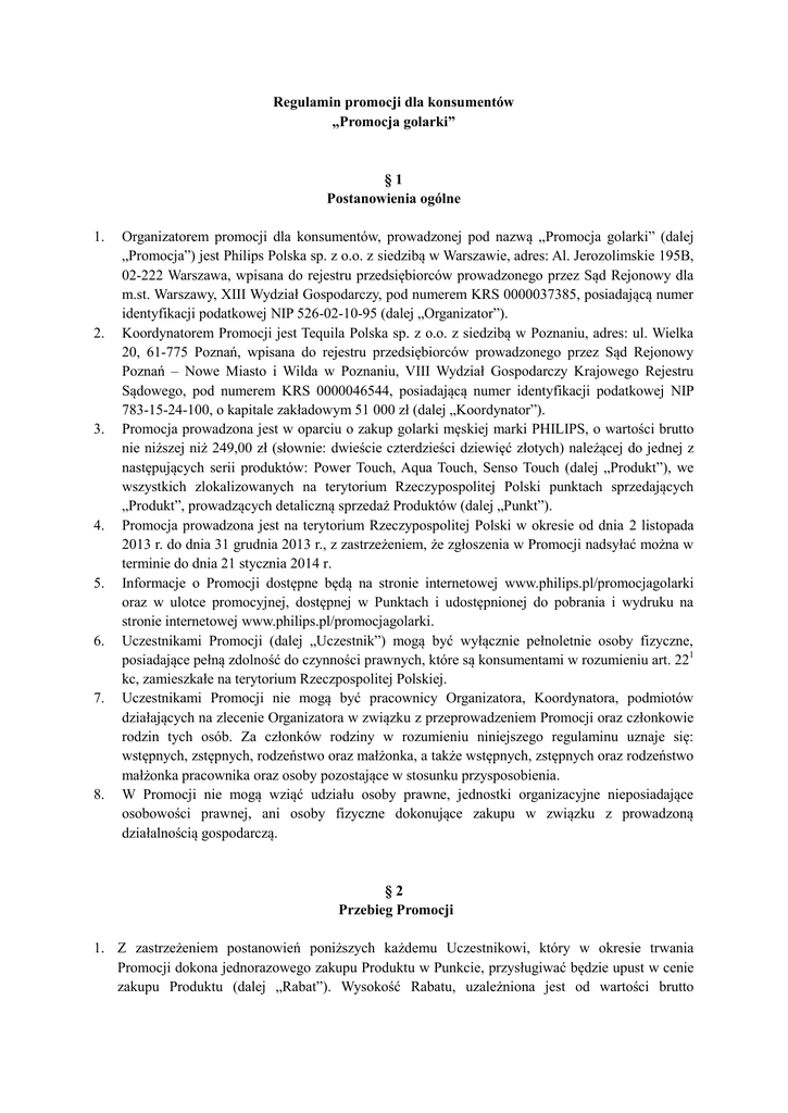 Regulamin promocji dla konsumentów „Promocja golarki” §1 Postanowienia ogólne 1. 2. 3. 4. 5. 6. 7. 8. Organizatorem promocji dla konsumentów, prowadzonej pod nazwą „Promocja golarki” (dalej „Promocja”) jest Philips Polska sp. z o.o. z siedzibą w Warszawie, adres: Al. Jerozolimskie 195B, 02-222 Warszawa, wpisana do rejestru przedsiębiorców prowadzonego przez Sąd Rejonowy dla m.st. Warszawy, XIII Wydział Gospodarczy, pod numerem KRS 0000037385, posiadającą numer identyfikacji podatkowej NIP 526-02-10-95 (dalej „Organizator”). Koordynatorem Promocji jest Tequila Polska sp. z o.o. z siedzibą w Poznaniu, adres: ul. Wielka 20, 61-775 Poznań, wpisana do rejestru przedsiębiorców prowadzonego przez Sąd Rejonowy Poznań – Nowe Miasto i Wilda w Poznaniu, VIII Wydział Gospodarczy Krajowego Rejestru Sądowego, pod numerem KRS 0000046544, posiadającą numer identyfikacji podatkowej NIP 783-15-24-100, o kapitale zakładowym 51 000 zł (dalej „Koordynator”). Promocja prowadzona jest w oparciu o zakup golarki męskiej marki PHILIPS, o wartości brutto nie niższej niż 249,00 zł (słownie: dwieście czterdzieści dziewięć złotych) należącej do jednej z następujących serii produktów: Power Touch, Aqua Touch, Senso Touch (dalej „Produkt”), we wszystkich zlokalizowanych na terytorium Rzeczypospolitej Polski punktach sprzedających „Produkt”, prowadzących detaliczną sprzedaż Produktów (dalej „Punkt”). Promocja prowadzona jest na terytorium Rzeczypospolitej Polski w okresie od dnia 2 listopada 2013 r. do dnia 31 grudnia 2013 r., z zastrzeżeniem, że zgłoszenia w Promocji nadsyłać można w terminie do dnia 21 stycznia 2014 r. Informacje o Promocji dostępne będą na stronie internetowej www.philips.pl/promocjagolarki oraz w ulotce promocyjnej, dostępnej w Punktach i udostępnionej do pobrania i wydruku na stronie internetowej www.philips.pl/promocjagolarki. Uczestnikami Promocji (dalej „Uczestnik”) mogą być wyłącznie pełnoletnie osoby fizyczne, posiadające pełną zdolność do czynności prawnych, które są konsumentami w rozumieniu art. 221 kc, zamieszkałe na terytorium Rzeczpospolitej Polskiej. Uczestnikami Promocji nie mogą być pracownicy Organizatora, Koordynatora, podmiotów działających na zlecenie Organizatora w związku z przeprowadzeniem Promocji oraz członkowie rodzin tych osób. Za członków rodziny w rozumieniu niniejszego regulaminu uznaje się: wstępnych, zstępnych, rodzeństwo oraz małżonka, a także wstępnych, zstępnych oraz rodzeństwo małżonka pracownika oraz osoby pozostające w stosunku przysposobienia. W Promocji nie mogą wziąć udziału osoby prawne, jednostki organizacyjne nieposiadające osobowości prawnej, ani osoby fizyczne dokonujące zakupu w związku z prowadzoną działalnością gospodarczą. §2 Przebieg Promocji 1. Z zastrzeżeniem postanowień poniższych każdemu Uczestnikowi, który w okresie trwania Promocji dokona jednorazowego zakupu Produktu w Punkcie, przysługiwać będzie upust w cenie zakupu Produktu (dalej „Rabat”). Wysokość Rabatu, uzależniona jest od wartości brutto 2. 3. 4. 5. 6. 7. 8. zakupionego Produktu. W przypadku, dokonania przez Uczestnika w okresie trwania Promocji jednorazowego zakupu Produktu o wartości brutto: 1) od 249,00 zł do 398,99 zł, Uczestnikowi przysługiwać będzie Rabat w wysokości 50 zł (słownie: pięćdziesiąt złotych), 2) od 399,00 zł do 498,99 zł, Uczestnikowi przysługiwać będzie Rabat w wysokości 50 zł (słownie: pięćdziesiąt złotych), 3) od 499,00 zł do 798,99 zł, Uczestnikowi przysługiwać będzie Rabat w wysokości 100 zł (słownie: sto złotych), 4) powyżej 799,00 zł, Uczestnikowi przysługiwać będzie Rabat w wysokości 200 zł (słownie: dwieście złotych). Celem otrzymania Rabatu Uczestnik powinien spełnić następujące warunki: 1) dokonać w okresie trwania Promocji zakupu Produktu o wartości nie niższej niż 249,00 zł brutto, potwierdzonego jednym dowodem zakupu i zachować oryginał dowodu zakupu (faktura VAT lub paragon) oraz oryginalny kod kreskowy EAN, wycięty z opakowania zakupionego Produktu, 2) w okresie od dnia 2 listopada 2013 r. do 21 stycznia 2014 r. przesłać pocztą na adres: Skrzynka Pocztowa nr 96, 60-959 Poznań 2 z dopiskiem na kopercie „Promocja golarki” kompletne zgłoszenie, zawierające: a) kompletnie i czytelnie wypełniony formularz, zawarty w ulotce promocyjnej wraz z podanymi wskazanymi w formularzu danymi osobowymi Uczestnika oraz numerem rachunku Uczestnika, na który przesłana zostanie równowartość udzielonego Rabatu, b) kopię dowodu zakupu Produktu (faktura VAT lub paragon), potwierdzającą dokonanie zakupu Produktu w okresie trwania Promocji, c) oryginalny kod kreskowy EAN, wycięty z opakowania Produktu, zakupionego w okresie jej trwania i upoważniającego do uzyskania Rabatu w Promocji. Do uzyskania Rabatu w Promocji uprawnia zakup jednego Produktu objętego Promocją o wartości nie niższej niż 249,00 zł brutto, potwierdzonego jednym paragonem. Uczestnik może przesłać dowolną liczbę zgłoszeń w Promocji pod warunkiem każdorazowego spełnienia wszystkich warunków określonych niniejszym regulaminem. Dokumenty przesłane przez Uczestnika w zgłoszeniu nie podlegają zwrotowi. W Promocji brane będą pod uwagę Zgłoszenia spełniające wszystkie warunki określone w niniejszym regulaminie, a w szczególności zgłoszenia kompletne, czytelne, zawierające dane osobowe, niezbędne do udzielenia Rabatu (w szczególności numer rachunku Uczestnika) zawierające oryginalny kod kreskowy, uprawniający do otrzymania Rabatu w Promocji. Rabaty, o których mowa w ust. 1, udzielane będą Uczestnikom w przysługującej wysokości maksymalnie w ciągu 21 dni od dnia wpłynięcia prawidłowego zgłoszenia, nie później jednak niż do dnia 25 lutego 2014 r. przelewem na rachunek bankowy podany przez Uczestnika w formularzu, zawartym w ulotce promo