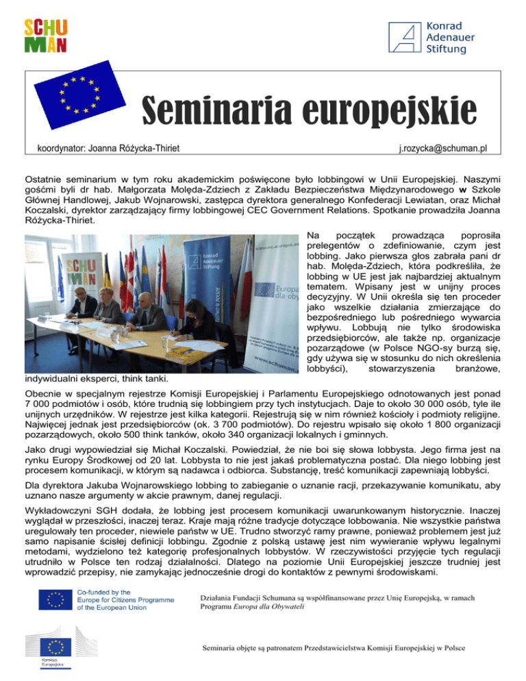 Seminaria europejskie koordynator: Joanna Różycka-Thiriet [email protected] Ostatnie seminarium w tym roku akademickim poświęcone było lobbingowi w Unii Europejskiej. Naszymi gośćmi byli dr hab. Małgorzata Molęda-Zdziech z Zakładu Bezpieczeństwa Międzynarodowego w Szkole Głównej Handlowej, Jakub Wojnarowski, zastępca dyrektora generalnego Konfederacji Lewiatan, oraz Michał Koczalski, dyrektor zarządzający firmy lobbingowej CEC Government Relations. Spotkanie prowadziła Joanna Różycka-Thiriet. Na początek prowadząca poprosiła prelegentów o zdefiniowanie, czym jest lobbing. Jako pierwsza głos zabrała pani dr hab. Molęda-Zdziech, która podkreśliła, że lobbing w UE jest jak najbardziej aktualnym tematem. Wpisany jest w unijny proces decyzyjny. W Unii określa się ten proceder jako wszelkie działania zmierzające do bezpośredniego lub pośredniego wywarcia wpływu. Lobbują nie tylko środowiska przedsiębiorców, ale także np. organizacje pozarządowe (w Polsce NGO-sy burzą się, gdy używa się w stosunku do nich określenia lobbyści), stowarzyszenia branżowe, indywidualni eksperci, think tanki. Obecnie w specjalnym rejestrze Komisji Europejskiej i Parlamentu Europejskiego odnotowanych jest ponad 7 000 podmiotów i osób, które trudnią się lobbingiem przy tych instytucjach. Daje to około 30 000 osób, tyle ile unijnych urzędników. W rejestrze jest kilka kategorii. Rejestrują się w nim również kościoły i podmioty religijne. Najwięcej jednak jest przedsiębiorców (ok. 3 700 podmiotów). Do rejestru wpisało się około 1 800 organizacji pozarządowych, około 500 think tanków, około 340 organizacji lokalnych i gminnych. Jako drugi wypowiedział się Michał Koczalski. Powiedział, że nie boi się słowa lobbysta. Jego firma jest na rynku Europy Środkowej od 20 lat. Lobbysta to nie jest jakaś problematyczna postać. Dla niego lobbing jest procesem komunikacji, w którym są nadawca i odbiorca. Substancję, treść komunikacji zapewniają lobbyści. Dla dyrektora Jakuba Wojnarowskiego lobbing to zabieganie o uznanie racji, przekazywanie komunikatu, aby uznano nasze argumenty w akcie prawnym, danej regulacji. Wykładowczyni SGH dodała, że lobbing jest procesem komunikacji uwarunkowanym historycznie. Inaczej wyglądał w przeszłości, inaczej teraz. Kraje mają różne tradycje dotyczące lobbowania. Nie wszystkie państwa uregulowały ten proceder, niewiele państw w UE. Trudno stworzyć ramy prawne, ponieważ problemem jest już samo napisanie ścisłej definicji lobbingu. Zgodnie z polską ustawę jest nim wywieranie wpływu legalnymi metodami, wydzielono też kategorię profesjonalnych lobbystów. W rzeczywistości przyjęcie tych regulacji utrudniło w Polsce ten rodzaj działalności. Dlatego na poziomie Unii Europejskiej jeszcze trudniej jest wprowadzić przepisy, nie zamykając jednocześnie drogi do kontaktów z pewnymi środowiskami. Działania Fundacji Schumana są współfinansowane przez Unię Europejską, w ramach Programu Europa dla Obywateli Seminaria objęte są patronatem Przedstawicielstwa Komisji Europejskiej w Polsce Prelegentka przypomniała, że Parlament jako pierwszy wprowadził rejestr lobbystów. Komisja natomiast stworzyła początkowo bazę podmiotów, który służyła np. zawiadamianiu ich o różnych inicjatywach. W odpowiedzi na pytanie Joanny Różyckiej-Thiriet, dlaczego nie ma regulacji dotyczących lobbingu przy Radzie UE, wyjaśniła, że instytucja ta składa się z przedstawicieli państw. A jak wspomniała wcześniej, w różnych krajach są różne przepisy, tradycje. Ale toczą się rozmowy, żeby objąć wspólnym rejestrem także lobbystów działających w Radzie UE. Zdaniem dr hab. w Unii patrzy się na lobbing pozytywniej niż w Polsce. Traktuje się go jako okazję uzyskania dodatkowych informacji. W związku z tym np. dopłaca się organizacjom pozarządowym, żeby mogły być obecne w Brukseli i prezentować swoje zdanie. Dzięki rejestrowi instytucje mogą monitorować, jakie podmioty interesują się danym procesem legislacyjnym, czy pewne grupy nie są nadmiernie reprezentowane (np. w debacie o żywności zmodyfikowanej genetycznie), czy w debacie bierze udział tylko branża przemysłowa, czy także konsumenci. Dyrektor Lewiatana potwierdził, że ich organizacja jest zarejestrowana, choć dokonała tej rejestracji późno. Lewiatan ma specyficzną sytuację, gdyż jest organizacją pracodawców. W Polsce podlega ustawie o lobbingu i ustawie o Komisji Trójstronnej (Komisja aktualnie nie działa, ponieważ wycofały się z niej związki zawodowe). Oprócz tego organizacje pracodawców i związki zawodowe mają swoje własne ustawy. Na mocy obowiązującego w Polsce prawa pracodawcy uczestniczą w procesie decyzyjnym. W Unii Europejskiej wpływanie na podejmowane decyzje jest jeszcze bardziej skomplikowane. Od 2001 roku Lewiatan posiada swoje biuro w Brukseli, w którym pracują obecnie 2 osoby. Jego pracownicy np. uczestniczą w spotkaniach, przygotowują analizy, są aktywni w portalach społecznościowych. Po drugie, Konfederacja Lewiatan jest członkiem organizacji branżowej o nazwie BUSINESSEUROPE. Skupia firmy zatrudniające 120 mln osób. Organizacja ta ma dostęp do komisarzy, parlamentarzystów, uczestniczy w unijnej debacie publicznej. Kolejną ścieżką wywierania wpływu jest docierania do Stałego Przedstawicielstwa Polski przy UE, aby poinformować je o interesach firm zrzeszonych w Lewiatanie. I wreszcie, można docierać do członków polskiego rządu tutaj w kraju, żeby podczas unijnych negocjacji mogli się posługiwać argumentami dostarczonymi im przez firmy. Jak podkreślił Michał Koczalski, różnica między jego firmą a Lewiatanem jest taka, że w Polsce wiele drzwi jest dla niego zamkniętych, Aby wejść do Sejmu, lobbysta musi mieć specjalną przepustkę w czerwonym (odstraszającym) kolorze. Zresztą posiadaczy takich czerwonych przepustek jest niewi