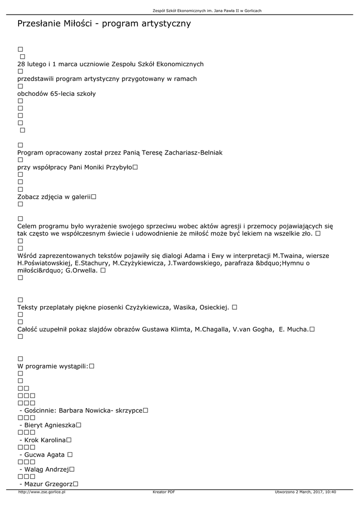 Zespół Szkół Ekonomicznych im. Jana Pawła II w Gorlicach Przesłanie Miłości - program artystyczny 28 lutego i 1 marca uczniowie Zespołu Szkół Ekonomicznych przedstawili program artystyczny przygotowany w ramach obchodów 65-lecia szkoły Program opracowany został przez Panią Teresę Zachariasz-Belniak przy współpracy Pani Moniki Przybyło Zobacz zdjęcia w galerii Celem programu było wyrażenie swojego sprzeciwu wobec aktów agresji i przemocy pojawiających się tak często we współczesnym świecie i udowodnienie że miłość może być lekiem na wszelkie zło. Wśród zaprezentowanych tekstów pojawiły się dialogi Adama i Ewy w interpretacji M.Twaina, wiersze H.Poświatowskiej, E.Stachury, M.Czyżykiewicza, J.Twardowskiego, parafraza „Hymnu o miłości” G.Orwella. Teksty przeplatały piękne piosenki Czyżykiewicza, Wasika, Osieckiej. Całość uzupełnił pokaz slajdów obrazów Gustawa Klimta, M.Chagalla, V.van Gogha, E. Mucha. W programie wystąpili: - Gościnnie: Barbara Nowicka- skrzypce - Bieryt Agnieszka - Krok Karolina - Gucwa Agata - Waląg Andrzej - Mazur Grzegorz http://www.zse.gorlice.pl Kreator PDF Utworzono 2 March, 2017, 10:40 Zespół Szkół Ekonomicznych im. Jana Pawła II w Gorlicach - Duszowicz Bogusław - Brach Wojciech - Nabożny Rafał Pomocą audiowizualna służyli: - Migdar Marcin - Kalinowski Konrad - Przybyłowicz Łukasz - Wałęga Piotr - Zieliński Tomasz Pomysł i opieka merytoryczna: mgr inż. Teresa Zachariasz-Belniak mgr Monika Przybyło http://www.zse.gorlice.pl Kreator PDF Utworzono 2 March, 2017, 10:40