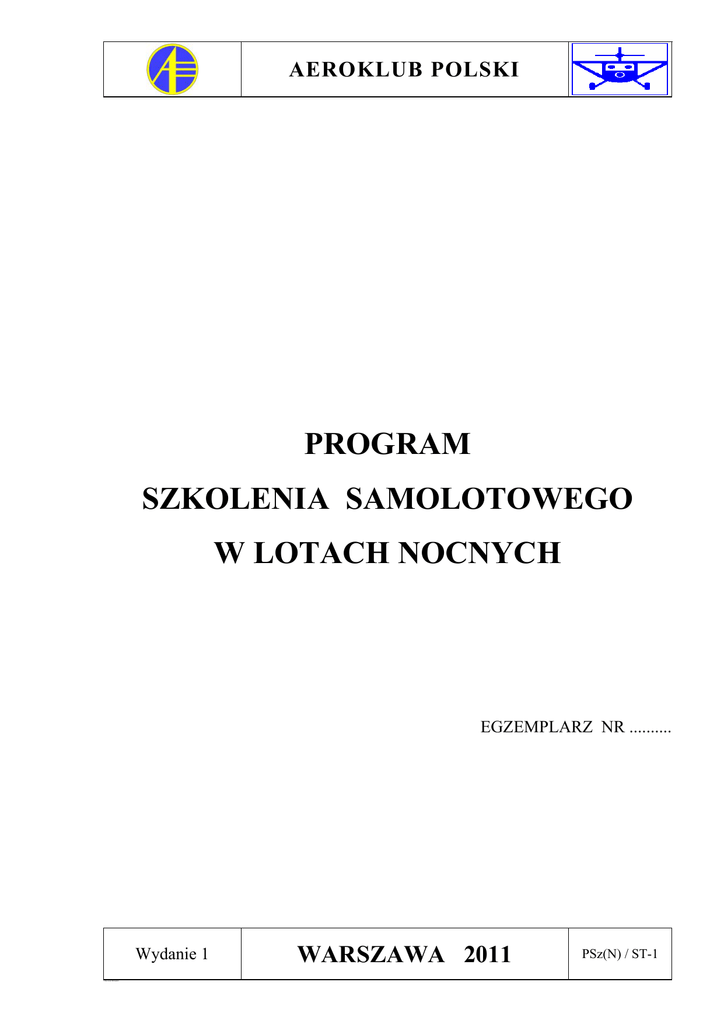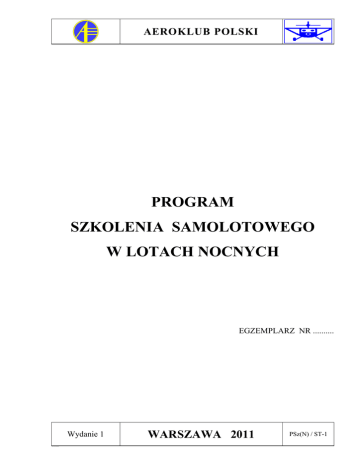 AEROKLUB POLSKI PROGRAM SZKOLENIA SAMOLOTOWEGO W LOTACH NOCNYCH EGZEMPLARZ NR .......... Wydanie 1 © Ryszard Michalski WARSZAWA 2011 PSz(N) / ST-1 ROZDZIAŁ 0 PROGRAM SZKOLENIA SAMOLOTOWEGO W LOTACH NOCNYCH AEROKLUB POLSKI POŚWIADCZENIE ZATWIERDZENIA PROGRAMU Na podstawie § 11 ust. 1 rozporządzenia Ministra Infrastruktury z dnia 3 września 2003 r. w sprawie licencjonowania personelu lotniczego (D.U. Nr 165 poz. 1603) POŚWIADCZENIE WPROWADZENIA PROGRAMU SZKOLENIA DO UŻYTKU SŁUŻBOWEGO Niniejszy PROGRAM SZKOLENIA SAMOLOTOWEGO W LOTACH NOCNYCH został wprowadzony do użytku Zarządzeniem Sekretarza Generalnego Aeroklubu Polskiego. PSz(N) / SZ-2 KARTA ZATWIERDZEŃ Wydanie 1 / 2011 Zmiana Nr 0 © Ryszard Michalski AEROKLUB POLSKI PROGRAM SZKOLENIA SAMOLOTOWEGO W LOTACH NOCNYCH KARTA ZMIAN ZMIANA NR 1 do PROGRAMU SZKOLENIA SAMOLOTOWEGO W LOTACH NOCNYCH AEROKLUBU POLSKIEGO została zatwierdzona przez Prezesa Urzędu Lotnictwa Cywilnego. Pismo .................................................................... z dnia .................................................................... (m.p) ........................................................................ (pieczęć i podpis osoby uprawnionej) ZMIANA NR 2 do PROGRAMU SZKOLENIA SAMOLOTOWEGO W LOTACH NOCNYCH AEROKLUBU POLSKIEGO została zatwierdzona przez Prezesa Urzędu Lotnictwa Cywilnego. Pismo .................................................................... z dnia .................................................................... (m.p) ........................................................................ (pieczęć i podpis osoby uprawnionej) ZMIANA NR 3 do PROGRAMU SZKOLENIA SAMOLOTOWEGO W LOTACH NOCNYCH AEROKLUBU POLSKIEGO została zatwierdzona przez Prezesa Urzędu Lotnictwa Cywilnego. . Pismo .................................................................... z dnia .................................................................... (m.p) ........................................................................ (pieczęć i podpis osoby uprawnionej) ZMIANA NR 4 do PROGRAMU SZKOLENIA SAMOLOTOWEGO W LOTACH NOCNYCH AEROKLUBU POLSKIEGO została zatwierdzona przez Prezesa Urzędu Lotnictwa Cywilnego. Pismo .................................................................... z dnia .................................................................... (m.p) ........................................................................ (pieczęć i podpis osoby uprawnionej) Wydanie 1 / 2010 Zmiana Nr 0 © Ryszard Michalski KARTA ZMIAN PSz(N) / KZ-1 KARTA ZMIAN PROGRAM SZKOLENIA SAMOLOTOWEGO W LOTACH NOCNYCH AEROKLUB POLSKI ZMIANA NR 5 do PROGRAMU SZKOLENIA SAMOLOTOWEGO W LOTACH NOCNYCH AEROKLUBU POLSKIEGO została zatwierdzona przez Prezesa Urzędu Lotnictwa Cywilnego. Pismo .................................................................... z dnia .................................................................... (m.p) ........................................................................ (pieczęć i podpis osoby uprawnionej) ZMIANA NR 6 PROGRAMU SZKOLENIA SAMOLOTOWEGO W LOTACH NOCNYCH AEROKLUBU POLSKIEGO została zatwierdzona przez Prezesa Urzędu Lotnictwa Cywilnego. Pismo .................................................................... z dnia .................................................................... (m.p) ........................................................................ (pieczęć i podpis osoby uprawnionej) ZMIANA NR 7 PROGRAMU SZKOLENIA SAMOLOTOWEGO W LOTACH NOCNYCH AEROKLUBU POLSKIEGO została zatwierdzona przez Prezesa Urzędu Lotnictwa Cywilnego. Pismo .................................................................... z dnia .................................................................... (m.p) ........................................................................ (pieczęć i podpis osoby uprawnionej) ZMIANA NR 8 PROGRAMU SZKOLENIA SAMOLOTOWEGO W LOTACH NOCNYCH AEROKLUBU POLSKIEGO została zatwierdzona przez Prezesa Urzędu Lotnictwa Cywilnego. Pismo .................................................................... z dnia .................................................................... (m.p) ........................................................................ (pieczęć i podpis osoby uprawnionej) PSz(N) / KZ-2 KARTA ZMIAN Wydanie 1 / 2011 Zmiana Nr 0 © Ryszard Michalski AEROKLUB POLSKI PROGRAM SZKOLENIA SAMOLOTOWEGO W LOTACH NOCNYCH ROZDZIAŁ 0 ROZDZIAŁ 0 ADMINISTROWANIE PROGRAMEM 0.1 ZAKRES SZKOLENIA LOTNICZEGO, KTÓREGO PROGRAM DOTYCZY 0.1.1 Program Szkolenia Samolotowego w Lotach Nocnych, określa zakres wymaganego dodatkowego szkolenia teoretycznego i praktycznego dla kandydatów ubiegających się o uzyskanie kwalifikacji pilotażowych w lotach nocnych VFR, potwierdzonych odpowiednim wpisem do licencji. 0.1.2 Zakres stosowania Programu. 1. Program przewidziany jest do stosowania w Organizacji Szkolenia Aeroklubu Polskiego oraz innych Ośrodkach. 2. Wszyscy użytkownicy Programu zobowiązani są w trakcie szkolenia do ścisłego przestrzegania jego wymogów oraz postępowania zgodnego z obowiązującymi przepisami lotniczymi. Znajomość treści Programu jest obowiązkiem wszystkich osób prowadzących szkolenie oraz osób szkolonych zgodnie z jego wymogami. 0.1.3 Użycie nazw i numeracja: 1. Niniejszy Program Szkolenia Samolotowego w Lotach Nocnych jest również dalej nazywany Programem lub w skrócie PSz(N). 2. Organizacja Szkolenia Lotniczego Aeroklubu Polskiego lub Ośrodek nazywany jest w dalszym tekście organizacją / ośrodkiem. 3. Numeracja ZADANIA Programu powiązana jest z literą alfabetu N. 4. Numeracja ĆWICZEŃ powiązana jest z literą alfabetu i cyframi np. ĆW. N/1. ------------------ Wydanie 1 /2011 Zmiana Nr 0 © Ryszard Michalski ADMINISTROWANIE PROGRAMEM PSz(N) / 0-1 ROZDZIAŁ 0 0.2 AEROKLUB POLSKI PROGRAM SZKOLENIA SAMOLOTOWEGO W LOTACH NOCNYCH OŚWIADCZENIE SZEFA SZKOLENIA AEROKLUBU POLSKIEGO 0.2.1 Oświadczenie o zgodności Programu z wszys