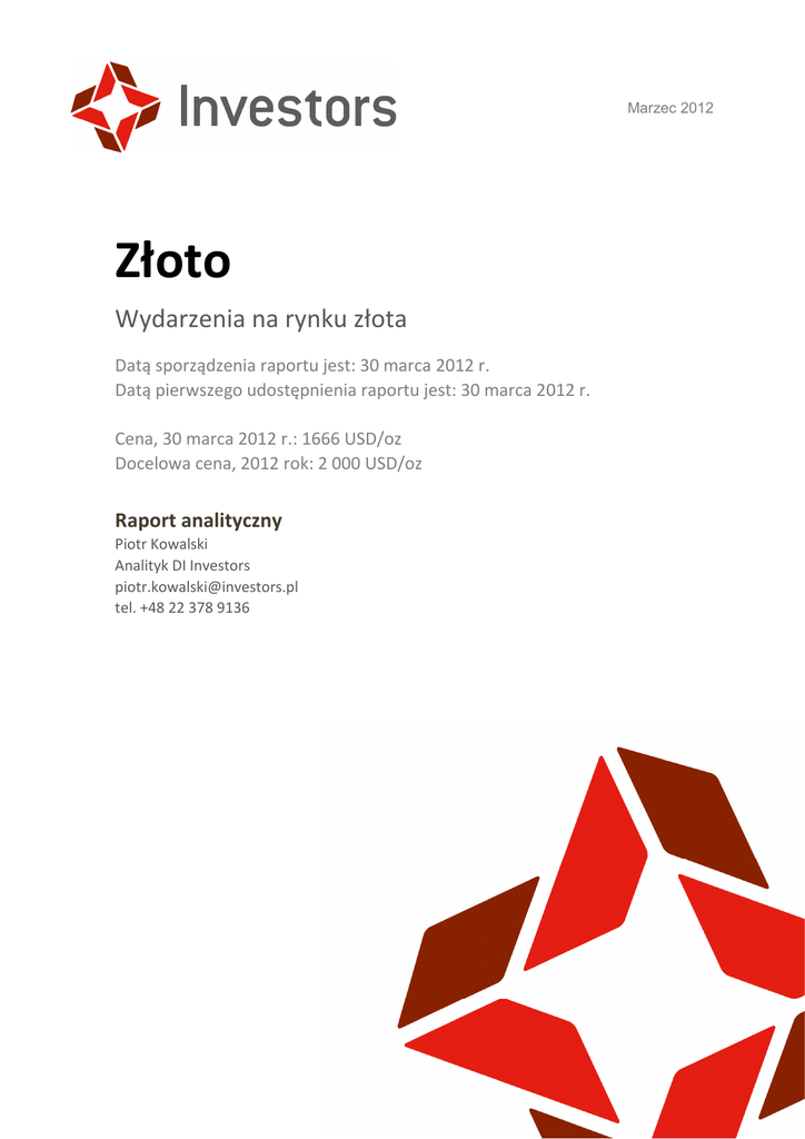Marzec 2012 Złoto Wydarzenia na rynku złota Datą sporządzenia raportu jest: 30 marca 2012 r. Datą pierwszego udostępnienia raportu jest: 30 marca 2012 r. Cena, 30 marca 2012 r.: 1666 USD/oz Docelowa cena, 2012 rok: 2 000 USD/oz Raport analityczny Piotr Kowalski Analityk DI Investors [email protected] tel. +48 22 378 9136 Główne wnioski Podtrzymujemy prognozę wzrostu ceny złota do 2000 dolarów za uncję w 2012 roku. Od 26 września 2011 r., czyli daty publikacji naszego ostatniego raportu, złoto znajduje się w korekcie długoterminowego trendu wzrostowego. Korekta ta, tak jak to miało miejsce w latach ubiegłych, jest procesem bardzo pozytywnym dla zachowania stabilności dotychczasowego długoterminowego trendu wzrostowego. Z przecenami podobnej wielkości mieliśmy do czynienia w przeszłości dwukrotnie. Za pierwszym razem wycena złota spadła o 25%, a za drugim o 33%. Aktualnie trwająca korekta obniżyła wycenę o 20%, co pokazuje dobrą kondycję strony popytowej. Potwierdza ją też szybkość obrony poziomów zagregowanych przy wartościach 1520 - 1580 dolarów za uncje. Przerwa w trendzie wzrostowym, w trakcie której nie dochodzi do znaczącego zniesienia wcześniejszych wzrostów dowodzi, że trend wzrostowy będzie kontynuowany. W związku z tym, w przyszłości należy oczekiwać spokojnego budowania bazy pod dalsze wzrosty. Dlatego podtrzymujemy poziom 2000 dolarów za uncję, jako naszą cenę docelową na 2012 rok. Raport o rynku złota, marzec 2012 Ważne wydarzenia Za istotne wydarzenia dla rynku złota w ostatnim okresie uznajemy następujące wydarzenia: Kontynuację proinflacyjnej polityki banków centralnych. Banki centralne Japonii oraz Anglii zwiększyły dotychczasowe programy luzowania ilościowego o odpowiednio 128 i 79 mld dolarów. FED zakomunikował, że będzie utrzymywał stopy procentowe na rekordowo niskim poziomie do 2014 roku. Ponadto Ben Bernanke, szef amerykańskiego banku centralnego, stwierdził, że gospodarka amerykańska powinna rosnąć szybciej, gdyż obecne tempo wzrostu nie zapewni odpowiednio szybkiej poprawy na rynku pracy. Zostało to odczytane przez rynek, jako zasygnalizowanie przez prezesa Rezerwy Federalnej Radzie Gubernatorów konieczności wprowadzenia kolejnego programu stymulującego gospodarkę. Kontynuowana będzie operacja twist zamiany krótkoterminowych papierów na długoterminowe, a środki z zapadających obligacji hipotecznych reinwestowane będą na rynku kredytowym. Wśród instytucji zabiegających o poprawę płynności na rynkach finansowych na prowadzenie wyszedł Europejski Bank Centralny (EBC). W dwóch rundach operacji LTRO (polegających na udostępnieniu bankom komercyjnym kredytów oprocentowanych na poziomie 1 proc. w skali roku) EBC wpompował w rynek więcej niż FED po upadku Lehman Brothers. Tym samym prezes EBC, Mario Draghi dał dowód kontynuacji włoskiej tradycji debazowania wartości swojej waluty, tak jak to miało miejsce z włoską lirą, której wartość od 1973 roku spadła w ciągu 28 lat względem dolara o 75%. W 2011 roku banki centralne kupiły 440 ton złota. Jest to o 360% więcej niż rok wcześniej. Oznacza to, że banki centralne drugi rok z rzędu były kupcem netto na rynku złota. Jeżeli tendencja utrzyma się to instytucje te będą dużym wsparciem strony popytowej również w tym roku. Centralny Bank Indii opublikował notatki robocze, z których wynika chęć dalszego zwiększania rezerw złota przez tę instytucję. Jednym z motywów miałby być fakt, że zwiększaniu w ostatnich latach rezerw walutowych nie towarzyszył wzrost zapasów kruszcu. Ostatni raz Centralny Bank Indii zwiększył rezerwy złota w 2009 roku kupując od IMF 200 ton. Prezydent Boliwii zatwierdził ustawę umożliwiającą bankowi centralnemu zakup złota z krajowych kopalni po cenach rynkowych. W czwartym kwartale 2011 r. chińscy importerzy kupili kilka razy więcej złota niż w tym samym okresie roku poprzedniego. Import kruszcu do Państwa Środka w pierwszych dziesięciu miesiącach ubiegłego roku stanowił aż trzykrotność importowanego złota przez cały wcześniejszy rok. Raport o rynku złota, marzec 2012 Spis treści Główne wnioski .................................................................................................. 2 WaŜne wydarzenia ............................................................................................. 3 Spis treści........................................................................................................... 4 Korekta jako krótki przystanek w trendzie wzrostowym ..................................... 5 „Wskaźnik Z” potwierdza stabilność trendu wzrostowego .................................. 6 Sentyment na rynku złota ................................................................................... 7 Ceny docelowe w raportach banków inwestycyjnych ......................................... 8 Waluacja spółek wydobywczych ........................................................................ 9 Relacja ceny złota do wartości akcji ................................................................. 10 Podsumowanie................................................................................................. 11 Raport o rynku złota, marzec 2012 Korekta, jako krótki przystanek w długoterminowym trendzie wzrostowym Pierwsza, w 2006 roku, spowodowała spadek ceny złota o 25%, a druga (z 2008 roku) obniżyła notowania o 33%. Obecna rozpoczęła się w sierpniu 2011 roku. Okazała się ona jednak dużo płytsza od poprzednich, ponieważ zniosła kwotowania kruszcu o zaledwie 20%. Tego typu korekty są procesami pozytywnymi i pożądanymi dla zachowania stabilności długoterminowego trendu wzrostowego. Biorąc pod uwagę aktualną cenę złota, sposób obrony poziomów wsparcia wynikających z analizy technicznej oraz dystans do długoterminowej średniej kroczącej można stwierdzić, że kondycja strony popyt