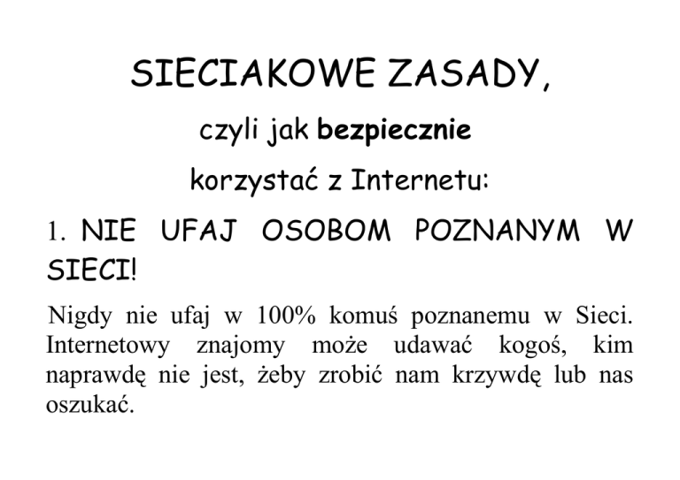 SIECIAKOWE ZASADY, czyli jak bezpiecznie korzystać z Internetu: 1. NIE UFAJ OSOBOM POZNANYM W SIECI! Nigdy nie ufaj w 100% komuś poznanemu w Sieci. Internetowy znajomy może udawać kogoś, kim naprawdę nie jest, żeby zrobić nam krzywdę lub nas oszukać. Nie spotykaj się z nikim zbyt pochopnie w prawdziwym świecie. Jeśli planujesz spotkanie zawsze poinformuj o tym rodziców! 2.NIGDY DANYCH! NIE PODAWAJ SWOICH W Internecie posługuj się tylko nickiem, czyli pseudonimem. Nie podawaj swoich danych, takich jak imię lub nazwisko, numer telefonu, adres, czy numer szkoły, bo możesz rozmawiać z kimś kto będzie chciał je wykorzystać w zły sposób. 3. POWIEDZ, JEŚLI COŚ JEST NIE TAK! Mów, jeśli coś jest nie tak. W sytuacji, kiedy ktoś lub coś Cię w Internecie zaniepokoi lub wystraszy koniecznie opowiedz o tym rodzicom lub innej zaufanej osobie dorosłej! 4. ZABEZPIECZ SWÓJ KOMPUTER! Jeśli Twój komputer jest podłączony do Internetu musisz mieć zainstalowany odpowiedni program antywirusowy. Dzięki temu Twój komputer i dane będą bezpieczne.