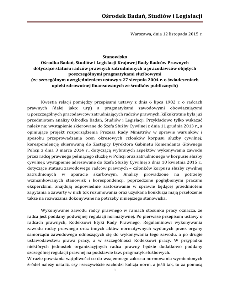 Ośrodek Badań, Studiów i Legislacji Warszawa, dnia 12 listopada 2015 r. Stanowisko Ośrodka Badań, Studiów i Legislacji Krajowej Rady Radców Prawnych dotyczące statusu radców prawnych zatrudnionych u pracodawców objętych poszczególnymi pragmatykami służbowymi (ze szczególnym uwzględnieniem ustawy z 27 sierpnia 2004 r. o świadczeniach opieki zdrowotnej finansowanych ze środków publicznych) Kwestia relacji pomiędzy przepisami ustawy z dnia 6 lipca 1982 r. o radcach prawnych (dalej jako: urp) a pragmatykami zawodowymi obowiązującymi u poszczególnych pracodawców zatrudniających radców prawnych, kilkukrotnie była już przedmiotem analizy Ośrodka Badań, Studiów i Legislacji. Przykładowo tylko wskazać należy na: wystąpienie skierowane do Szefa Służby Cywilnej z dnia 11 grudnia 2013 r., a opiniujące projekt rozporządzenia Prezesa Rady Ministrów w sprawie warunków i sposobu przeprowadzania ocen okresowych członków korpusu służby cywilnej; korespondencję skierowaną do Zastępcy Dyrektora Gabinetu Komendanta Głównego Policji z dnia 3 marca 2014 r., dotyczącą wybranych aspektów wykonywania zawodu przez radcę prawnego pełniącego służbę w Policji oraz zatrudnionego w korpusie służby cywilnej; wystąpienie adresowane do Szefa Służby Cywilnej z dnia 10 kwietnia 2015 r., dotyczące statusu zawodowego radców prawnych – członków korpusu służby cywilnej zatrudnionych w aparacie skarbowym. Analizy prowadzone na potrzeby wzmiankowanych stanowisk i korespondencji, poprzedzone pogłębionymi pracami eksperckimi, znajdują odpowiednie zastosowanie w sprawie będącej przedmiotem zapytania a zawarty w nich tok rozumowania oraz uzyskana konkluzja mają przełożenie także na rozważania dokonywane na potrzeby niniejszego stanowiska. Wykonywanie zawodu radcy prawnego w ramach stosunku pracy oznacza, że radca jest poddany podwójnej regulacji normatywnej. Po pierwsze przepisom ustawy o radcach prawnych, Kodeksowi Etyki Rady Prawnego, Regulaminowi wykonywania zawodu radcy prawnego oraz innych aktów normatywnych wydanych przez organy samorządu zawodowego odnoszących się do wykonywania tego zawodu, a po drugie ustawodawstwu prawa pracy, a w szczególności Kodeksowi pracy. W przypadku niektórych jednostek organizacyjnych radca prawny będzie dodatkowo poddany szczególnej regulacji prawnej na podstawie tzw. pragmatyk służbowych. W razie powstania wątpliwości co do wzajemnego zakresu normowania wymienionych źródeł należy ustalić, czy rzeczywiście zachodzi kolizja norm, a jeśli tak, to za pomocą 1 Ośrodek Badań, Studiów i Legislacji jakich reguł derogacyjnych powinna być wyeliminowana, a zatem która z norm winna mieć pierwszeństwo stosowania. Zarówno urp jak i ustawa z dnia 27 sierpnia 2004 r. o świadczeniach opieki zdrowotnej finansowanych ze środków publicznych (dalej jako: uśoz) są aktami powszechnie obowiązującymi tej samej rangi. Nie można więc wykluczyć stosowania żadnej z zawartych w nich norm z uwagi na hierarchię konstytucyjnego porządku źródeł prawa o którym mowa w art. 87 Konstytucji Rzeczypospolitej Polskiej. Mając nadto na uwadze co do zasady odmienny przedmiot regulacji urp oraz uśoz – podobnie jak i innych pragmatyk służbowych – niezwykle trudne wydaje się przypisanie którejkolwiek z kolidujących norm charakteru lex specialis. Jednocześnie systemowe spojrzenie na porządek prawny oraz domniemanie o racjonalności ustawodawcy nie pozwala na wyjście z założenia o prymacie ustawy późniejszej, zwłaszcza w sferze tak szczegółowej i specyficznej jaką są pragmatyki zawodowe. Dotychczasowe rozważania przeprowadzane w Ośrodku Badań, Studiów i Legislacji Krajowej Rady Radców Prawnych, opierające się na analizie wypowiedzi doktryny (por. r.pr. Jan Łoziński, r.pr. Zenon Klatka, Status prawny radcy prawnego jako pracownika, MOPR rok 2005 numer 3) i orzecznictwa sądów powszechnych, pozwoliły wyprowadzić wniosek, iż urp oraz ustawy regulujące różnorakie stosunki służbowe powinny być stosowane równorzędnie, bez uprzedniego, generalnego założenia o kierunku wzajemnego wykluczania się kolidujących norm. Nie oznacza to jednak, że do takiej eliminacji nie może czy też nie powinno dochodzić w praktyce - każdy przypadek wymaga indywidualnego, wnikliwego rozpatrzenia z uwzględnieniem wielu aspektów związanych z przedmiotem poszczególnych regulacji. Przy braku możliwości skonstruowania klauzuli generalnej ułatwiającej eliminację sprzecznych norm, zasadne wydaje się postawienie tezy o dwóch przenikających się sferach będących przedmiotem regulacji w przepisach dotyczących wykonywana zawodu radcy prawnego w stosunku pracy (stosunku służbowym). Istnienie samorządu radców prawnych, a co za tym idzie istota zawodu radcy prawnego jako zawodu zaufania publicznego, ma swoje źródło w Ustawie Zasadniczej (Art. 17 ust. 1 Konstytucji Rzeczypospolitej Polskiej stanowi, że w drodze ustawy można tworzyć samorządy zawodowe, reprezentujące osoby wykonujące zawody zaufania publicznego i sprawujące pieczę nad należytym wykonywaniem tych zawodów w granicach interesu publicznego i dla jego ochrony). Pierwsza ze wspomnianych sfer obejmowałaby zatem aspekty związane z gwarancjami wykonywania zawodu radcy prawnego polegającego na świadczeniu pomocy prawnej, jako zawodu zaufania publicznego. W jej ramach mieściłyby się uprawnienia i obowiązki definiujące zawód radcy prawnego i sposób jego wykonywania. Poza nią znalazłyby się regulacje nierzutujące na status radcy prawnego jako zawodu zaufania publicznego, a więc przepisy o charakterze organizacyjnym, technicznym, etc. W tym pierwszym przypadku należałoby uznawać pierwszeństwo urp, 2 Ośrodek Badań, Studiów i Legislacji natomiast w drugim kluczowe znaczenie będzie miała chociażby ustawa z dnia 26 czerwca 1974 r. Kodeks pracy (dalej jako: kp), będące przedmiotem analizy pragmatyki słu