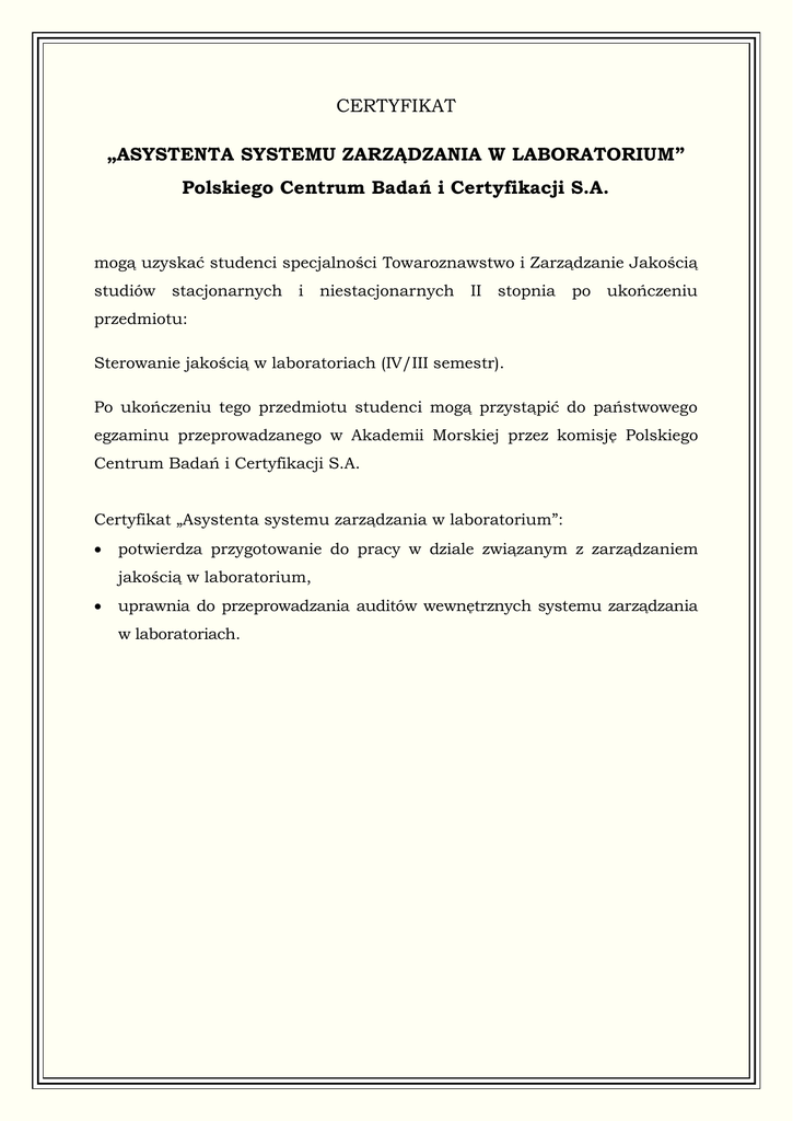 CERTYFIKAT „ASYSTENTA SYSTEMU ZARZĄDZANIA W LABORATORIUM” Polskiego Centrum Badań i Certyfikacji S.A. mogą uzyskać studenci specjalności Towaroznawstwo i Zarządzanie Jakością studiów stacjonarnych i niestacjonarnych II stopnia po ukończeniu przedmiotu: Sterowanie jakością w laboratoriach (IV/III semestr). Po ukończeniu tego przedmiotu studenci mogą przystąpić do państwowego egzaminu przeprowadzanego w Akademii Morskiej przez komisję Polskiego Centrum Badań i Certyfikacji S.A. Certyfikat „Asystenta systemu zarządzania w laboratorium”: potwierdza przygotowanie do pracy w dziale związanym z zarządzaniem jakością w laboratorium, uprawnia do przeprowadzania auditów wewnętrznych systemu zarządzania w laboratoriach.
