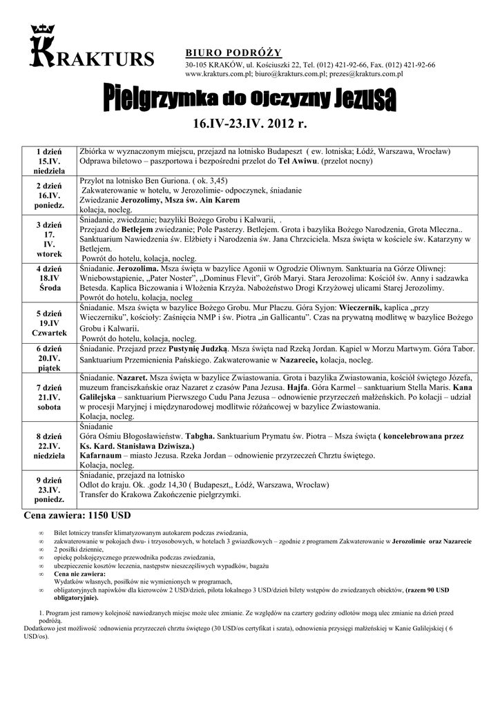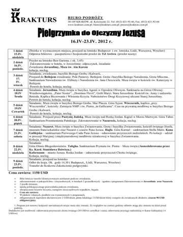 RAKTURS BIURO PODRÓŻY 30-105 KRAKÓW, ul. Kościuszki 22, Tel. (012) 421-92-66, Fax. (012) 421-92-66 www.krakturs.com.pl; [email protected]; [email protected] 16.IV-23.IV. 2012 r. 1 dzień 15.IV. niedziela 2 dzień 16.IV. poniedz. 3 dzień 17. IV. wtorek 4 dzień 18.IV Środa 5 dzień 19.IV Czwartek 6 dzień 20.IV. piątek 7 dzień 21.IV. sobota 8 dzień 22.IV. niedziela 9 dzień 23.IV. poniedz. Zbiórka w wyznaczonym miejscu, przejazd na lotnisko Budapeszt ( ew. lotniska; Łódź, Warszawa, Wrocław) Odprawa biletowo – paszportowa i bezpośredni przelot do Tel Awiwu. (przelot nocny) Przylot na lotnisko Ben Guriona. ( ok. 3,45) Zakwaterowanie w hotelu, w Jerozolimie- odpoczynek, śniadanie Zwiedzanie Jerozolimy, Msza św. Ain Karem kolacja, nocleg. Śniadanie, zwiedzanie; bazyliki Bożego Grobu i Kalwarii, . Przejazd do Betlejem zwiedzanie; Pole Pasterzy. Betlejem. Grota i bazylika Bożego Narodzenia, Grota Mleczna.. Sanktuarium Nawiedzenia św. Elżbiety i Narodzenia św. Jana Chrzciciela. Msza święta w kościele św. Katarzyny w Betlejem. Powrót do hotelu, kolacja, nocleg. Śniadanie. Jerozolima. Msza święta w bazylice Agonii w Ogrodzie Oliwnym. Sanktuaria na Górze Oliwnej: Wniebowstąpienie, „Pater Noster”, „Dominus Flevit”, Grób Maryi. Stara Jerozolima: Kościół św. Anny i sadzawka Betesda. Kaplica Biczowania i Włożenia Krzyża. Nabożeństwo Drogi Krzyżowej ulicami Starej Jerozolimy. Powrót do hotelu, kolacja, nocleg Śniadanie. Msza święta w bazylice Bożego Grobu. Mur Płaczu. Góra Syjon: Wieczernik, kaplica „przy Wieczerniku”, kościoły: Zaśnięcia NMP i św. Piotra „in Gallicantu”. Czas na prywatną modlitwę w bazylice Bożego Grobu i Kalwarii. Powrót do hotelu, kolacja, nocleg. Śniadanie. Przejazd przez Pustynię Judzką. Msza święta nad Rzeką Jordan. Kąpiel w Morzu Martwym. Góra Tabor. Sanktuarium Przemienienia Pańskiego. Zakwaterowanie w Nazarecie, kolacja, nocleg. Śniadanie. Nazaret. Msza święta w bazylice Zwiastowania. Grota i bazylika Zwiastowania, kościół świętego Józefa, muzeum franciszkańskie oraz Nazaret z czasów Pana Jezusa. Hajfa. Góra Karmel – sanktuarium Stella Maris. Kana Galilejska – sanktuarium Pierwszego Cudu Pana Jezusa – odnowienie przyrzeczeń małżeńskich. Po kolacji – udział w procesji Maryjnej i międzynarodowej modlitwie różańcowej w bazylice Zwiastowania. Kolacja, nocleg. Śniadanie Góra Ośmiu Błogosławieństw. Tabgha. Sanktuarium Prymatu św. Piotra – Msza święta ( koncelebrowana przez Ks. Kard. Stanisława Dziwisza.) Kafarnaum – miasto Jezusa. Rzeka Jordan – odnowienie przyrzeczeń Chrztu świętego. Kolacja, nocleg. Śniadanie, przejazd na lotnisko Odlot do kraju. Ok. .godz 14,30 ( Budapeszt,, Łódź, Warszawa, Wrocław) Transfer do Krakowa Zakończenie pielgrzymki. Cena zawiera: 1150 USD • • • • • • • Bilet lotniczy transfer klimatyzowanym autokarem podczas zwiedzania, zakwaterowanie w pokojach dwu- i trzyosobowych, w hotelach 3 gwiazdkowych – zgodnie z programem Zakwaterowanie w Jerozolimie oraz Nazarecie 2 posiłki dziennie, opiekę polskojęzycznego przewodnika podczas zwiedzania, ubezpieczenie kosztów leczenia, następstw nieszczęśliwych wypadków, bagażu Cena nie zawiera: Wydatków własnych, posiłków nie wymienionych w programach, obligatoryjnych napiwków dla kierowców 2 USD/dzień, pilota lokalnego 3 USD/dzień bilety wstępów do zwiedzanych obiektów, (razem 90 USD obligatoryjnie). 1. Program jest ramowy kolejność nawiedzanych miejsc może ulec zmianie. Ze względów na czartery godziny odlotów mogą ulec zmianie na dzień przed podróżą. Dodatkowo jest możliwość :odnowienia przyrzeczeń chrztu świętego (30 USD/os certyfikat i szata), odnowienia przysięgi małżeńskiej w Kanie Galilejskiej ( 6 USD/os).