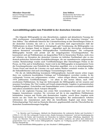 Mirosław Ossowski Jens Stüben Instytut Filologii Germańskiej Uniwersytet Gdański Gdańsk Bundesinstitut für Kultur und Geschichte der Deutschen im östlichen Europa Oldenburg Auswahlbibliographie zum Polenbild in der deutschen Literatur Die folgende Bibliographie ist eine überarbeitete, ergänzte und aktualisierte Fassung der 1994 erschienenen „Auswahlbibliographie zum Polenbild in der deutschen Literatur“ von Jens Stüben.1 Das anhaltende Interesse der Literaturforschung an den Darstellungen Polens in der deutschen Literatur, das sich u. a. in der inzwischen stark angewachsenen Zahl der Publikationen zu dieser Problematik widerspiegelt, gab Veranlassung, die Bibliographie von 1994 auf den heutigen Stand zu bringen – ungeachtet auch der inzwischen erschienenen anderen thematisch verwandten bibliographischen Veröffentlichungen.2 Die vorliegende Bibliographie bezieht sich primär auf die imagologischen Forschungsarbeiten. Sie konzentriert sich auf Publikationen zur dargestellten Welt in literarischen Werken, nicht etwa auf Arbeiten zur Rezeption der deutschen Literatur im östlichen Nachbarland oder zu den deutsch-polnischen literarischen Kontaktbeziehungen, die nur ausnahmsweise aufgenommen wurden. Berücksichtigt wurden auch Veröffentlichungen über Darstellungen Polens in der Presse, im Film und in Schulbüchern. Somit wird in der Bibliographie in komprimierter Form die Forschungsliteratur zum Polenbild der Deutschen angeführt, wie es in deutschsprachigen Texten fixiert und durch die Literatur wie auch andere Medien vermittelt worden ist. Außer der Sekundärliteratur sind auch einschlägige Textsammlungen erfasst. Für die als Jahrbuchbeitrag konzipierte bibliographische Auswahl musste schon wegen ihres von vornherein beschränkten Umfangs auf Vollständigkeit verzichtet werden. In die vorliegende Version neu aufgenommen wurden – neben einigen älteren, insbesondere seit 1970 publizierten Veröffentlichungen – vor allem in den letzten Jahren, nach 1994, erschienene Publikationen. So liegt der Schwerpunkt der Bibliographie auf der neueren und neuesten Forschung. Die Titel wurden auf Grund entsprechender Angaben in germanistischen Fachbibliographien, Zeitschriften und Sammelbänden sowie Literaturverzeichnissen ermittelt und nahezu ausnahmslos durch Autopsie überprüft. Die in der ergänzten Fassung zum ersten Mal verzeichneten Titel sind zum Teil mit knappen Annotationen versehen. Sie verweisen auf die in den angeführten Publikationen behandelten Autoren und Werke oder thematischen Aspekte, soweit diese Angaben nicht bereits aus den Titeln der Veröffentlichungen hervorgehen. Bei umfassenderen Arbeiten informieren die Annotationen auch über die betreffenden Kapitel und deren Seiten. Polnischsprachige Titel sind ins Deutsche übersetzt; gegebenenfalls sind die Überschriften der deutschen Zusammenfassungen beigefügt. 1 In: Berichte und Forschungen. Jahrbuch des Bundesinstituts für ostdeutsche Kultur und Geschichte 2 (1994), S. 123-188. Die vorliegende Version in den „Studia Germanica Gedanensia“ wird mit Genehmigung des Bundesinstituts für Kultur und Geschichte der Deutschen im östlichen Europa, Oldenburg, abgedruckt. Sie wurde von Mirosław Ossowski in Zusammenarbeit mit Jens Stüben erarbeitet, der neben dem elektronisch gespeicherten Text von 1994 weitere bibliographische Angaben zur Verfügung gestellt und zahlreiche neue Quellen überprüft hat. 2 Zu den betreffenden Bibliographien vgl. den Abschnitt C (Bibliographien). 208 Die Gliederung der vorliegenden aktualisierten Version der Bibliographie stimmt weitgehend überein mit der von 1994 und entspricht damit „im wesentlichen der Geschichte der deutsch-polnischen geistigen und politischen Beziehungen“3. Um bei der erheblich gewachsenen Zahl der Titel die Orientierung zu erleichtern, wurde jedoch der Zeitraum von 1793/94 bis 1848 nur mehr in einem Abschnitt erfasst. Ebenso sind die Autoren aus den bis 1990 bestehenden beiden deutschen Staaten nicht mehr getrennt, sondern zusammen angeführt, denn ihre Werke stellen nach Jahrzehnten politischer Trennung heute wohl eine gemeinsame Tradition der deutschen Literatur dar. Auch wird auf diese Weise auf die Kontinuität im Schaffen zeitgenössischer Autoren Rücksicht genommen. ABKÜRZUNGEN Zeitschriften und Reihen Akcent Arcadia Arkusz AUL AUNC AUW Borussia Colloquia Germ. Stet. Convivium Dialog Fil. Germ. Germ. Wrat. Inter finitimos Kom. Mazur.-Warm. Konfiguracje Kwart. Neofil. Kwart. Opol. Lubelskie Mater. Neof. Mickiewicz-Bl. Miesięcz. Lit. Nurt Orbis Ling. Osteuropa Pamiętnik Liter. Polish West. Aff. Prace Polon. Przegl. Histor. Przegl. Hum. Przegl. Zach. Przegl. Zach.-Pom. Ruch Liter. 3 Akcent. Literatura i Sztuka (Lublin) Arcadia. Zeitschrift für vergleichende Literaturwissenschaft (Berlin) Arkusz. Miesięcznik Kulturalny (Poznań, Warszawa, Kraków, Wrocław) Acta Universitatis Lodziensis (Łódź) Acta Universitatis Nicolai Copernici (Toruń) Acta Universitatis Wratislaviensis (Wrocław) Borussia. Kultura – Historia – Literatura (Olsztyn) Colloquia Germanica Stetinensia (Szczecin) Convivium. Germanistisches Jahrbuch Polen (DAAD, Bonn) Dialog. Deutsch-Polnisches Magazin. Magazyn Polsko-Niemiecki (Berlin) Filologia Germańska Germanica Wratislaviensia (Wrocław) Inter finitimos. Wissenschaftlicher Informationsdienst DeutschPolnische Beziehungen / Informator naukowy do badań nad stosunkami polsko-niemieckimi (Osnabrück) Komunikaty Mazursko-Warmińskie (Olsztyn) Konfiguracje. Konfigurationen (Bydgoszcz) Kwartalnik Neofilologiczny (Warszawa) Kwartalnik Opolski (Opole) Lubelskie Materiały Neofilologiczne (Lublin) Mickiewicz-Blätter (Heidelberg) Miesięcznik Literacki (Warszawa) Nurt. Miesięcznik Społeczno-Kulturalny (Poznań) Orbis Linguarum. Legnickie Rozprawy Filologiczne (Legnica) Osteuropa. Zeitschrift für Gegenwartsfragen des Ostens (Stuttgart) Pamiętnik Literacki. Czasopismo kwartalne poświęcone historii i krytyce literatury polski