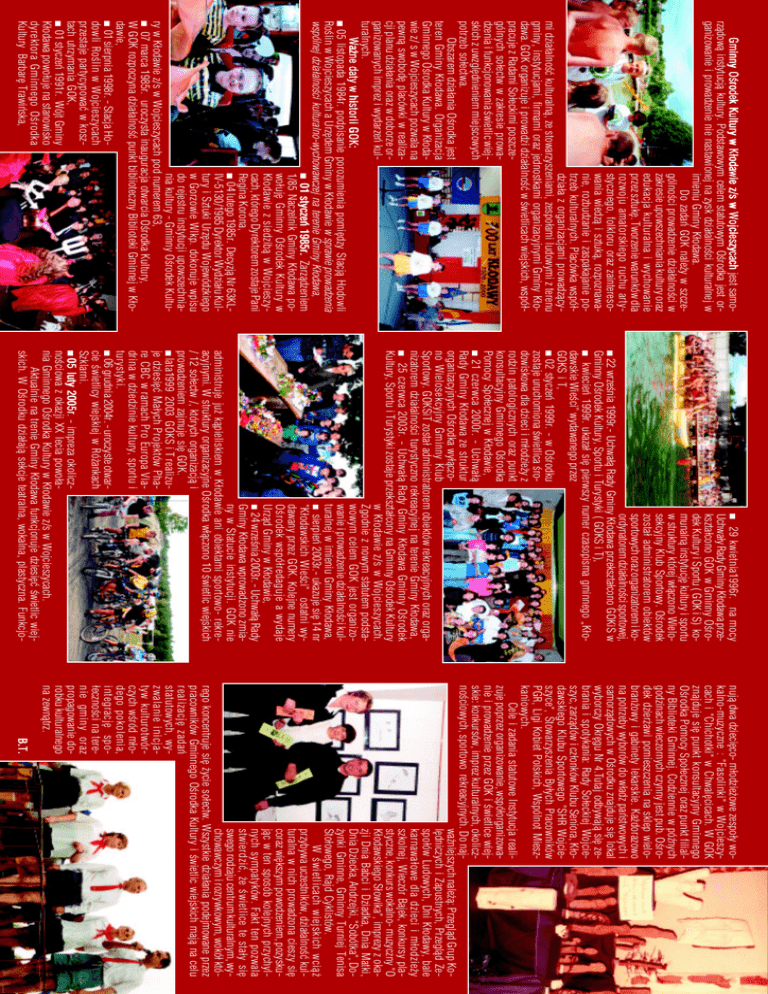 Gminny Ośrodek Kultury w Kłodawie z/s w Wojcieszycach jest samo− rządową instytucją kultury. Podstawowym celem statutowym Ośrodka jest or− ganizowanie i prowadzenie nie nastawionej na zysk działalności kulturalnej w imieniu Gminy Kłodawa. Do zadań GOK należy w szcze− gólności prowadzenie działalności w zakresie upowszechniania kultury oraz edukacja kulturalna i wychowanie przez sztukę. Tworzenie warunków dla rozwoju amatorskiego ruchu arty− stycznego, folkloru oraz zaintereso− wania wiedzą i sztuką, rozpoznawa− nie, rozbudzanie i zaspakajanie po− trzeb kulturalnych. Placówka współ− działa z organizacjami prowadzący− mi działalność kulturalną, ze stowarzyszeniami, zespołami ludowymi z terenu gminy, instytucjami, firmami oraz jednostkami organizacyjnymi Gminy Kło− dawa. GOK organizuje i prowadzi działalność w świetlicach wiejskich, współ− pracuje z Radami Sołeckimi poszcze− gólnych sołectw w zakresie prowa− dzenia i funkcjonowania świetlic wiej− skich z uwzględnieniem miejscowych potrzeb sołectwa. Obszarem działania Ośrodka jest teren Gminy Kłodawa. Organizacja Gminnego Ośrodka Kultury w Kłoda− wie z/ s w Wojcieszycach pozwala na pewną swobodę placówki w realiza− cji planu działania oraz w doborze or− ganizowanych imprez i wydarzeń kul− turalnych. Ważne daty w historii GOK: 05 listopada 1984r. podpisanie porozumienia pomiędzy Stacją Hodowli Roślin w Wojcieszycach a Urzędem Gminy w Kłodawie w sprawie prowadzenia wspólnej działalności kulturalno−wychowawczej na terenie Gminy Kłodawa, 01 styczeń 1985r. Zarządzeniem 1/85 Naczelnik Gminy Kłodawa po− wołuję Gminny Ośrodek Kultury w Kłodawie z siedzibą w Wojcieszy− cach, którego Dyrektorem zostaje Pani Regina Korona, 04 lutego 1985r. Decyzją Nr 63KL− IV−5130/1985 Dyrektor Wydziału Kul− tury i Sztuki Urzędu Wojewódzkiego w Gorzowie Wlkp. dokonuje wpisu do rejestru instytucji upowszechnia− nia kultury − Gminny Ośrodek Kultu− ry w Kłodawie z/s w Wojcieszycach pod numerem 63, 07 marca 1985r. uroczysta inauguracja otwarcia Ośrodka Kultury, W GOK rozpoczyna działalność punkt biblioteczny Biblioteki Gminnej w Kło− dawie, 01 sierpnia 1998r. − Stacja Ho− dowli Roślin w Wojcieszycach przestaje partycypować w kosz− tach utrzymania GOK, 01 styczeń 1991r. Wójt Gminy Kłodawa powołuje na stanowisko dyrektora Gminnego Ośrodka Kultury Barbarę Trawińska, 29 kwietnia1996r. na mocy Uchwały Rady Gminy Kłodawa prze− kształcono GOK w Gminny Ośro− dek Kultury i Sportu ( GOK i S) ko− munalną instytucję kultury i sportu w struktury której włączono Wielo− sekcyjny Klub Sportowy. Ośrodek został administratorem obiektów sportowych oraz organizatorem i ko− ordynatorem działalności sportowej, 22 września 1999r.− Uchwałą Rady Gminy Kłodawa przekształcono GOKiS w Gminny Ośrodek Kultury, Sportu i Turystyki ( GOKS i T), kwiecień 1999r. ukazał się pierwszy numer czasopisma gminnego „Kło− dawskie Wieści” wydawanego przez GOKS i T, 02 styczeń 1999r. − w Ośrodku zostaje uruchomiona świetlica śro− dowiskowa dla dzieci i młodzieży z rodzin patologicznych oraz punkt konsultacyjny Gminnego Ośrodka Pomocy Społecznej w Kłodawie, 21 czerwca 2000r. − Uchwałą Rady Gminy Kłodawa ze struktur organizacyjnych Ośrodka wyłączo− no Wielosekcyjny Gminny Klub Sportowy. GOKSiT został administratorem obiektów rekreacyjnych oraz orga− nizatorem działalności turystyczno rekreacyjnej na terenie Gminy Kłodawa, 25 czerwca 2003r. − Uchwałą Rady Gminy Kłodawa Gminny Ośrodek Kultury, Sportu i Turystyki zostaje przekształcony na Gminny Ośrodek Kultury w Kłodawie z/s w Wojcieszycach. Zgodnie z nowym statutem podsta− wowym celem GOK jest organizo− wanie i prowadzenie działalności kul− turalnej w imieniu Gminy Kłodawa, sierpień 2003r.− ukazuje się 14 nr "Kłodawskich Wieści" ostatni wy− dawany przez GOK. Kolejne numery Ośrodek współredaguje a wydaje Urząd Gminy w Kłodawie, 24 września 2003r. − Uchwałą Rady Gminy Kłodawa wprowadzono zmia− ny w Statucie instytucji. GOK nie administruje już kąpieliskiem w Kłodawie ani obiektami sportowo− rekre− acyjnymi. W struktury organizacyjne Ośrodka włączono 10 świetlic wiejskich / 12 sołectw /, których organizacją i prowadzeniem zajmuje się GOK. lata1999 2003 GOKS i T realizu− je dziesięć Małych Projektów Pha− re CBC w ramach Pro Europa Via− drina w dziedzinie kultury, sportu i turystyki. 06 grudnia 2004r. − uroczyste otwar− cie świetlicy wiejskiej w Różankach Szklarni. 05 luty 2005r 2005r. − impreza okolicz− nościowa z okazji XX lecia powoła− nia Gminnego Ośrodka Kultury w Kłodawie z/s w Wojcieszycach. Aktualnie na trenie Gminy Kłodawa funkcjonuje dziesięć świetlic wiej− skich. W Ośrodku działają sekcje teatralna, wokalna, plastyczna. Funkcjo− nują dwa dziecięco− młodzieżowe zespoły wo− kalno−muzyczne : "Fasolinki" w Wojcieszy− cach i "Chichotki" w Chwalęcicach. W GOK znajduje się punkt konsultacyjny Gminnego Ośrodka Pomocy Społecznej oraz punkt filial− ny Biblioteki Gminnej. Codziennie w późnych godzinach wieczornych czynny jest pub. Ośro− dek dzierżawi pomieszczenia na sklep wielo− branżowy i gabinety lekarskie. Każdorazowo na potrzeby wyborów do władz państwowych i samorządowych w Ośrodku znajduje się lokal wyborczy Okręgu Nr 4.Tutaj odbywają się ze− brania i spotykania: Rady Sołeckiej Wojcie− szyc, zarządów i członków Klubu Seniora, Kło− dawskiego Klubu Sportowego "SHR Wojcie− szyce", Stowarzyszenia Byłych Pracowników PGR, Ligi Kobiet Polskich, Wspólnot Miesz− kaniowych. Cele i zadania statutowe Instytucja reali− zuje poprzez organizowanie, współorganizowa− nie i prowadzenie przez GOK i świetlice wiej− skie: konkursów, imprez kulturalnych, okolicz− nościowych, sportowo rekreacyjnych. Do naj− w