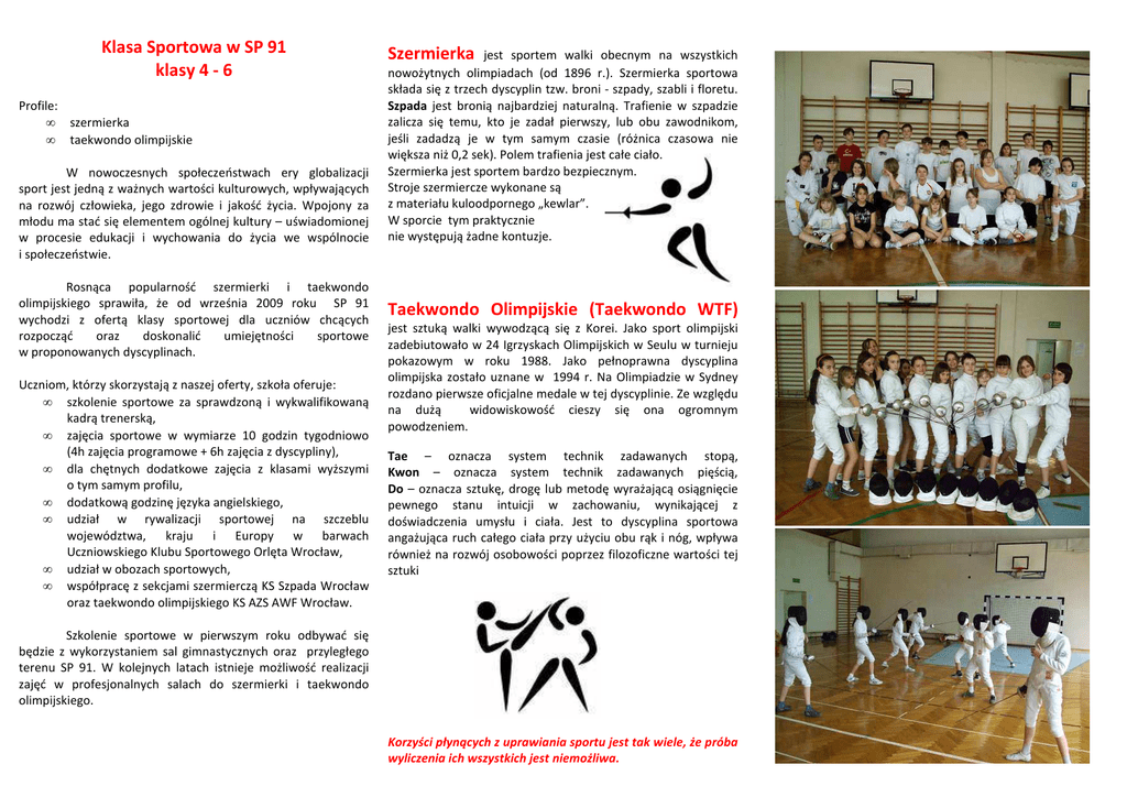 Klasa Sportowa w SP 91 klasy 4 - 6 Profile: • szermierka • taekwondo olimpijskie W nowoczesnych społeczeństwach ery globalizacji sport jest jedną z ważnych wartości kulturowych, wpływających na rozwój człowieka, jego zdrowie i jakość życia. Wpojony za młodu ma stać się elementem ogólnej kultury – uświadomionej w procesie edukacji i wychowania do życia we wspólnocie i społeczeństwie. Rosnąca popularność szermierki i taekwondo olimpijskiego sprawiła, że od września 2009 roku SP 91 wychodzi z ofertą klasy sportowej dla uczniów chcących rozpocząć oraz doskonalić umiejętności sportowe w proponowanych dyscyplinach. Uczniom, którzy skorzystają z naszej oferty, szkoła oferuje: • szkolenie sportowe za sprawdzoną i wykwalifikowaną kadrą trenerską, • zajęcia sportowe w wymiarze 10 godzin tygodniowo (4h zajęcia programowe + 6h zajęcia z dyscypliny), • dla chętnych dodatkowe zajęcia z klasami wyższymi o tym samym profilu, • dodatkową godzinę języka angielskiego, • udział w rywalizacji sportowej na szczeblu województwa, kraju i Europy w barwach Uczniowskiego Klubu Sportowego Orlęta Wrocław, • udział w obozach sportowych, • współpracę z sekcjami szermierczą KS Szpada Wrocław oraz taekwondo olimpijskiego KS AZS AWF Wrocław. Szermierka jest sportem walki obecnym na wszystkich nowożytnych olimpiadach (od 1896 r.). Szermierka sportowa składa się z trzech dyscyplin tzw. broni - szpady, szabli i floretu. Szpada jest bronią najbardziej naturalną. Trafienie w szpadzie zalicza się temu, kto je zadał pierwszy, lub obu zawodnikom, jeśli zadadzą je w tym samym czasie (różnica czasowa nie większa niż 0,2 sek). Polem trafienia jest całe ciało. Szermierka jest sportem bardzo bezpiecznym. Stroje szermiercze wykonane są z materiału kuloodpornego „kewlar”. W sporcie tym praktycznie nie występują żadne kontuzje. Taekwondo Olimpijskie (Taekwondo WTF) jest sztuką walki wywodzącą się z Korei. Jako sport olimpijski zadebiutowało w 24 Igrzyskach Olimpijskich w Seulu w turnieju pokazowym w roku 1988. Jako pełnoprawna dyscyplina olimpijska zostało uznane w 1994 r. Na Olimpiadzie w Sydney rozdano pierwsze oficjalne medale w tej dyscyplinie. Ze względu na dużą widowiskowość cieszy się ona ogromnym powodzeniem. Tae – oznacza system technik zadawanych stopą, Kwon – oznacza system technik zadawanych pięścią, Do – oznacza sztukę, drogę lub metodę wyrażającą osiągnięcie pewnego stanu intuicji w zachowaniu, wynikającej z doświadczenia umysłu i ciała. Jest to dyscyplina sportowa angażująca ruch całego ciała przy użyciu obu rąk i nóg, wpływa również na rozwój osobowości poprzez filozoficzne wartości tej sztuki Szkolenie sportowe w pierwszym roku odbywać się będzie z wykorzystaniem sal gimnastycznych oraz przyległego terenu SP 91. W kolejnych latach istnieje możliwość realizacji zajęć w profesjonalnych salach do szermierki i taekwondo olimpijskiego. Korzyści płynących z uprawiania sportu jest tak wiele, że próba wyliczenia ich wszystkich jest niemożliwa. ...Chcesz na orła w Ŝyciu wyjść do klasy sportowej z szermierki i taekwondo przyjdź... Więcej informacji udzielą: • JUś OD 1 WRZEŚNIA NOWA KLASA SPORTOWA Z TAEKWONDO OLIMPIJSKIEGO I SZERMIERKI Szermierka: o Anna Medyńska- Tercjak, Tel. 603459594 • Taekwondo Olimpijskie: o Przemysław Pachla, Tel. 693612838 • Szkoła Podstawowa Nr 91 Im. Orląt Lwowskich we Wrocławiu, ul. Stefanii Sempołowskiej 54, Tel./Fax 071 345 23 11, www.sp91.wroclaw.pl SZKOŁA PODSTAWOWA NR 91 IM. ORLĄT LWOWSKICH WE WROCŁAWIU UL. STEFANII SEMPOŁOWSKIEJ 54 51-661 WROCŁAW TEL./FAX. 345-23-11 EMAIL [email protected]