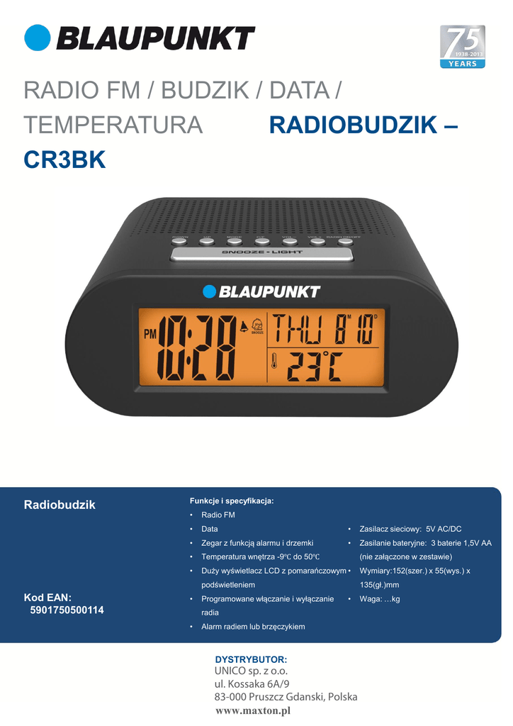RADIO FM / BUDZIK / DATA / TEMPERATURA RADIOBUDZIK – CR3BK Radiobudzik Kod EAN: 5901750500114 Funkcje i specyfikacja: • Radio FM • Data • Zasilacz sieciowy: 5V AC/DC • Zegar z funkcją alarmu i drzemki • Zasilanie bateryjne: 3 baterie 1,5V AA • Temperatura wnętrza -9℃ do 50℃ (nie załączone w zestawie) • Duży wyświetlacz LCD z pomarańczowym • Wymiary:152(szer.) x 55(wys.) x podświetleniem 135(gł.)mm • Programowane włączanie i wyłączanie • radia • Alarm radiem lub brzęczykiem DYSTRYBUTOR: UNICO sp. z o.o. ul. Kossaka 6A/9 83-000 Pruszcz Gdanski, Polska www.maxton.pl Waga: …kg