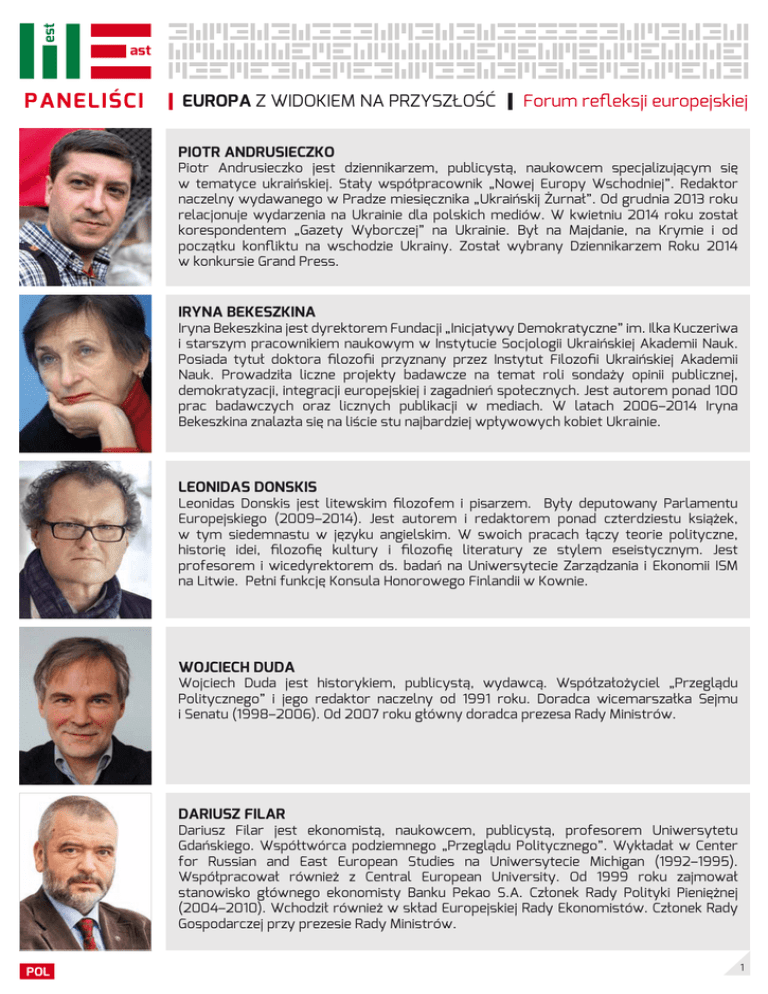est ast PANELIŚCI EUROPA Z WIDOKIEM NA PRZYSZŁOŚĆ Forum refleksji europejskiej PIOTR ANDRUSIECZKO Piotr Andrusieczko jest dziennikarzem, publicystą, naukowcem specjalizującym się w tematyce ukraińskiej. Stały współpracownik „Nowej Europy Wschodniej”. Redaktor naczelny wydawanego w Pradze miesięcznika „Ukraińskij Żurnał”. Od grudnia 2013 roku relacjonuje wydarzenia na Ukrainie dla polskich mediów. W kwietniu 2014 roku został korespondentem „Gazety Wyborczej” na Ukrainie. Był na Majdanie, na Krymie i od początku konfliktu na wschodzie Ukrainy. Został wybrany Dziennikarzem Roku 2014 w konkursie Grand Press. IRYNA BEKESZKINA Iryna Bekeszkina jest dyrektorem Fundacji „Inicjatywy Demokratyczne” im. Ilka Kuczeriwa i starszym pracownikiem naukowym w Instytucie Socjologii Ukraińskiej Akademii Nauk. Posiada tytuł doktora filozofii przyznany przez Instytut Filozofii Ukraińskiej Akademii Nauk. Prowadziła liczne projekty badawcze na temat roli sondaży opinii publicznej, demokratyzacji, integracji europejskiej i zagadnień społecznych. Jest autorem ponad 100 prac badawczych oraz licznych publikacji w mediach. W latach 2006–2014 Iryna Bekeszkina znalazła się na liście stu najbardziej wpływowych kobiet Ukrainie. LEONIDAS DONSKIS Leonidas Donskis jest litewskim filozofem i pisarzem. Były deputowany Parlamentu Europejskiego (2009–2014). Jest autorem i redaktorem ponad czterdziestu książek, w tym siedemnastu w języku angielskim. W swoich pracach łączy teorie polityczne, historię idei, filozofię kultury i filozofię literatury ze stylem eseistycznym. Jest profesorem i wicedyrektorem ds. badań na Uniwersytecie Zarządzania i Ekonomii ISM na Litwie. Pełni funkcję Konsula Honorowego Finlandii w Kownie. WOJCIECH DUDA Wojciech Duda jest historykiem, publicystą, wydawcą. Współzałożyciel „Przeglądu Politycznego” i jego redaktor naczelny od 1991 roku. Doradca wicemarszałka Sejmu i Senatu (1998–2006). Od 2007 roku główny doradca prezesa Rady Ministrów. DARIUSZ FILAR Dariusz Filar jest ekonomistą, naukowcem, publicystą, profesorem Uniwersytetu Gdańskiego. Współtwórca podziemnego „Przeglądu Politycznego”. Wykładał w Center for Russian and East European Studies na Uniwersytecie Michigan (1992–1995). Współpracował również z Central European University. Od 1999 roku zajmował stanowisko głównego ekonomisty Banku Pekao S.A. Członek Rady Polityki Pieniężnej (2004–2010). Wchodził również w skład Europejskiej Rady Ekonomistów. Członek Rady Gospodarczej przy prezesie Rady Ministrów. POL 1 est ast PANELIŚCI EUROPA Z WIDOKIEM NA PRZYSZŁOŚĆ Forum refleksji europejskiej ZBIGNIEW JANAS Zbigniew Janas jest politykiem, przedsiębiorcą. Działacz opozycji w PRL. W latach 1978–1980 był współpracownikiem KSS KOR. W 1980 roku wstąpił do Solidarności, kierował związkiem w zakładzie Ursus, od 1981 roku wchodził w skład Komisji Krajowej NSZZ „Solidarność”. W latach 1985–1989 był działaczem podziemnej Solidarności Polsko-Czechosłowackiej, a w 1989 roku założycielem Solidarności Polsko-Węgierskiej. W drugiej połowie lat 80. pracował w Spółdzielni Pracy Unicum, był też założycielem i udziałowcem Loran CKM sp. z o.o. WIKTOR JEROFIEJEW Wiktor Jerofiejew jest pisarzem, poetą, krytykiem literackim, doktorem nauk filologicznych. Absolwent Moskiewskiego Uniwersytetu Państwowego. Założyciel i wydawca czasopisma literackiego „Metropol”. Autor m.in.: powieści – „Rosyjska Piękność”, „Sąd Ostateczny”, „Encyklopedia duszy rosyjskiej”, „Dobry Stalin”, „Akimudy” oraz zbiorów „Życie z idiotą”, „Mężczyźni”, „Bóg X”, „Rosyjska apokalipsa”, „Świat Diabła”. Aktywny komentator życia politycznego i społecznego w Rosji i Europie. PIOTR KAPCZYŃSKI Piotr Kapczyński jest ekonomistą, przedsiębiorcą. Współtwórca podziemnego „Przeglądu Politycznego”. Od 1977 roku był zaangażowany w działalność opozycyjną. Współpracował z Biurem Interwencyjnym Komitetem Samoobrony Społecznej KOR, należał do Studenckiego Komitetu Solidarności, kolportował materiały Wolnych Związków Zawodowych. W Sierpniu ’80 drukował ulotki, organizował zaopatrzenie drukarni strajkowej i pełnił rolę tłumacza w rozmowach z zagranicznymi korespondentami. Założył niezależne wydawnictwo „Alternatywa”. Był etatowym pracownikiem pierwszej Solidarności. BASIL KERSKI Basil Kerski jest redaktorem, menadżerem kultury, publicystą, politologiem. Dyrektor Europejskiego Centrum Solidarności w Gdańsku, redaktor naczelny dwujęzycznego Magazynu Polsko-Niemieckiego „DIALOG”, redaktor „Przeglądu Politycznego”. Był wykładowcą historii i politologii na Wolnym Uniwersytecie oraz na Uniwersytecie Humboldta w Berlinie. Jako ekspert w dziedzinie polityki międzynarodowej pracował w amerykańsko-niemieckim Aspen Institute Berlin, Niemieckim Towarzystwie Polityki Zagranicznej, Centrum Badań Społecznych w Berlinie oraz w Bundestagu. JOHN C. KORNBLUM John C. Kornblum jest amerykańskim dyplomatą i przedsiębiorcą. Był m.in. członkiem sztabu Planowania Polityki Departamentu Stanu pod kierownictwem Henry’ego Kissingera (1973–1975), Dyrektorem Biura ds. Europy Środkowej w Departamencie Stanu (1981–1985), ministrem i zastępcą dowódcy amerykańskiego sektora w Berlinie Zachodnim (1985–1987), asystentem Sekretarza Stanu ds. europejskich i specjalnym wysłannikiem na Bałkanach (1995–1997) oraz ambasadorem Stanów Zjednoczonych w Niemczech (1997–2001). Od 2001 roku pracuje jako bankier inwestycyjny i doradca ds. handlu międzynarodowego. POL 2 est ast PANELIŚCI EUROPA Z WIDOKIEM NA PRZYSZŁOŚĆ Forum refleksji europejskiej KONRAD KNOCH Konrad Knoch jest doktorem nauk historycznych, kierownikiem Działu Badań Historycznych Europejskiego Centrum Solidarności, wykładowcą Uniwersytetu Gdańskiego. Przygotował m.in. pracę pod tytułem