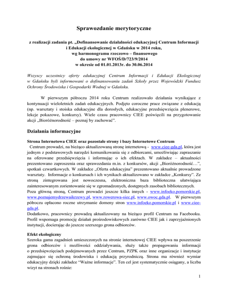 Sprawozdanie merytoryczne z realizacji zadania pt. „Dofinansowanie działalności edukacyjnej Centrum Informacji i Edukacji ekologicznej w Gdańsku w 2014 roku, wg harmonogramu rzeczowo – finansowego do umowy nr WFOŚ/D/723/9/2014 w okresie od 01.01.2013r. do 30.06.2014 Wszyscy uczestnicy oferty edukacyjnej Centrum Informacji i Edukacji Ekologicznej w Gdańsku byli informowani o dofinansowaniu zadań Szkoły przez Wojewódzki Fundusz Ochrony Środowiska i Gospodarki Wodnej w Gdańsku. W pierwszym półroczu 2014 roku Centrum realizowało działania wynikające z kontynuacji wieloletnich zadań edukacyjnych. Podjęto coroczne prace związane z edukacją (np. warsztaty i stoiska edukacyjne dla dorosłych, edukacyjne przedsięwzięcia plenerowe, lekcje pokazowe, konkursy). Wiele czasu pracownicy CIEE poświęcili na przygotowanie akcji „Bioróżnorodność – poznaj by zachować”. Działania informacyjne Strona Internetowa CIEE oraz pozostałe strony i bazy Internetowe Centrum Centrum prowadzi, na bieżąco aktualizowaną stronę internetową - www.ciee-gda.pl, która jest jednym z podstawowych narzędzi komunikowania się z odbiorcami, umożliwiając zapraszanie na oferowane przedsięwzięcia i informując o ich efektach. W zakładce – aktualności prezentowano zaproszenia oraz sprawozdania m.in. z konkursów, akcji „Bioróżnorodność…”, spotkań czwartkowych. W zakładce „Oferta edukacyjna” prezentowano aktualnie prowadzone warsztaty. Informacje o konkursach i ich wynikach aktualizowano w zakładce „Konkursy”. Ze stroną zintegrowana jest nowoczesna, elektroniczna baza biblioteczna ułatwiająca zainteresowanym zorientowanie się w zgromadzonych, dostępnych zasobach bibliotecznych. Poza główną stroną, Centrum prowadzi jeszcze kilka innych - www.infoeko.pomorskie.pl, www.poznajemydrzewaikrzewy.pl, www.rowerowa-siec.pl, www.owoc.gda.pl. W pierwszym półroczu opłacono roczne utrzymanie domeny stron www.infoeko.pomorskie.pl i www.cieegda.pl. Dodatkowo, pracownicy prowadzą aktualizowany na bieżąco profil Centrum na Facebooku. Profil wspomaga promocję działań prośrodowiskowych zarówno CIEE jak i zaprzyjaźnionych instytucji, docierając do jeszcze szerszego grona odbiorców. Efekt ekologiczny Szeroka gama zagadnień umieszczonych na stronie internetowej CIEE wpływa na poszerzenie grona odbiorców i możliwości oddziaływania, służy także propagowaniu informacji o przedsięwzięciach podejmowanych przez Centrum, PZPK oraz inne organizacje i instytucje zajmujące się ochroną środowiska i edukacją przyrodniczą. Strona ma również wymiar edukacyjny dzięki zakładce “Ważne informacje”. Ten cel jest systematycznie osiągany, a liczba wizyt na stronach rośnie: 1 [email protected] – 43 603 www.infoeko.pomorskie.pl – 28738 www.rowerowa-siec.pl – 16 036 www.poznajemydrzewaikrzewy.pl – 6 191 (od lutego br.) Statystyki Facebooka: polubienia - 315, zasięg postów – 1 luty – 16 czerwca 2014 r. - liczba osób udostepniających zdarzenia CIEE – 10 661, - liczba osób, które zobaczyły posty CIEE w pasku aktywności lub wchodząc na stronę 1 923 365 Informacja i promocja działalności Zakładki magnetyczne do książek Ponieważ pracownicy Centrum wykonali w ramach projektu współfinansowanego przez NFOŚiGW, w partnerstwie z Politechniką Gdańską program do nauki rozpoznawania drzew zaplanowano kolejną jego promocję. Wydrukowano 10 000 sztuk zakładek magnetycznych do książek, na których widnieje m.in. adres strony www.poznajemydrzewaikrzewy.pl. Zakładki rozdawane są laureatom konkursów, uczestnikom warsztatów i akcji edukacyjnych. Po pierwszych akcjach promocyjnych widać efekty w postaci zwiększonej oglądalności strony. Wywiady i artykuły: Dziennik Bałtycki 31.05.2014 – na temat projektu „Dojrzały smak przygody” Wywiad dla telewizji kablowej, Wywiad dla radia RMF, Radia Gdańsk (Magazyn Ekologiczny, wywiad do serwisu), Radia Plus Artykuł w piśmie PG Spot w Radiu Gdańsk – 25 emisji plakat w magazynie Herold Gdański Filmy: realizacja w ramach promocji akcji „Bioróżnorodność – poznaj by zachować” filmu z happeningu „Śniadanie na trawie” realizacja reportażu z dwudniowej akcji „Bioróżnorodność – poznaj by zachować” Efekt ekologiczny Efektem jest możliwość dotarcia do dużej ilości odbiorców, zachęcenie do zainteresowania się otaczającą przyrodą i poszerzenie ich wiedzy dotyczącej bioróżnorodności, przyrody w mieście, rodzimych drzew i krzewów, a także promowanie postaw prośrodowiskowych. Całoroczne działania edukacyjne Organizacja warsztatów i szkolenia dla różnych grup odbiorców Warsztaty pokazowe Warsztaty edukacyjne to niesłychanie istotny element propagowania wiedzy prośrodowiskowej, 2 dający możliwość utrzymania stałego kontaktu z bezpośrednim odbiorcą, czyli zarówno uczniami różnych grup wiekowych, jak i nauczycielami. Stanowią one inspirację i dają możliwość wzbogacania warsztatu nauczycieli wiedzą o nowych metodach pracy oraz przekazywania ciekawych materiałów edukacyjnych, pozyskiwanych z instytucji i organizacji z terenu całej Polski. Dla grup zorganizowanych przeprowadzono warsztaty pokazowe „Drzewa i krzewy bliżej nas”, które treścią nawiązują do tematu przewodniego roku – przyrody miejskiej. Spotkania czwartkowe Zrealizowano sześć spotkań czwartkowych dla miłośników ekologii. Tematem przewodnim tegorocznych spotkań jest przyroda miejska: Styczeń - „Przyroda w mieście” Michał Buliński Luty - „Czy czeka nas powrót do raju ? Dzikie zwierzęta w mieście” Witold Ciechanowicz Marzec – „Noc sów, czyli tajemnice nocnego życia w mieście” Ewelina Kurach Kwiecień - "Owady - wszędobylskie stworzenia" Anna Borowicz Maj - „Specyfika i bogactwo flory polskich trawników” Michał Buliński Czerwiec – Tradycyjne ogrody przyjazne krajobrazom i naturze” Justyna Rymon Lipińska ZPK (spotka