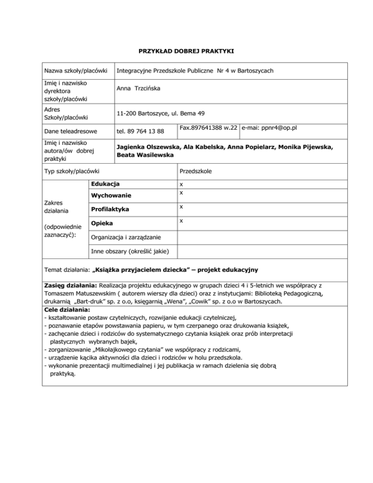 PRZYKŁAD DOBREJ PRAKTYKI Nazwa szkoły/placówki Integracyjne Przedszkole Publiczne Nr 4 w Bartoszycach Imię i nazwisko dyrektora szkoły/placówki Anna Trzcińska Adres Szkoły/placówki 11-200 Bartoszyce, ul. Bema 49 Dane teleadresowe tel. 89 764 13 88 Imię i nazwisko autora/ów dobrej praktyki Jagienka Olszewska, Ala Kabelska, Anna Popielarz, Monika Pijewska, Beata Wasilewska Typ szkoły/placówki Edukacja Zakres działania (odpowiednie zaznaczyć): Fax.897641388 w.22 e-mai: [email protected] Przedszkole Wychowanie x x Profilaktyka x Opieka x Organizacja i zarządzanie Inne obszary (określić jakie) Temat działania: „Książka przyjacielem dziecka” – projekt edukacyjny Zasięg działania: Realizacja projektu edukacyjnego w grupach dzieci 4 i 5-letnich we współpracy z Tomaszem Matuszewskim ( autorem wierszy dla dzieci) oraz z instytucjami: Biblioteką Pedagogiczną, drukarnią „Bart-druk” sp. z o.o, księgarnią „Wena”, „Cowik” sp. z o.o w Bartoszycach. Cele działania: - kształtowanie postaw czytelniczych, rozwijanie edukacji czytelniczej, - poznawanie etapów powstawania papieru, w tym czerpanego oraz drukowania książek, - zachęcanie dzieci i rodziców do systematycznego czytania książek oraz prób interpretacji plastycznych wybranych bajek, - zorganizowanie „Mikołajkowego czytania” we współpracy z rodzicami, - urządzenie kącika aktywności dla dzieci i rodziców w holu przedszkola. - wykonanie prezentacji multimedialnej i jej publikacja w ramach dzielenia się dobrą praktyką. Uzyskane efekty: - dziecko wie jak powstaje książka, samodzielnie wykonuje własne książeczki oraz zakładki do książek, - dziecko samodzielnie wykonuje papier czerpany, - dziecko współpracuje w zespole, uczy się pomagać dzieciom młodszym oraz korzystać z tej pomocy, - dziecko wspólnie z rodzicami wykonuje pracę plastyczną „Moja ulubiona książka”, bierze udział w grupowym konkursie, - dziecko inscenizuje ruchem treść piosenek bajki prezentowanej na „Mikołajkowym czytaniu”, - dziecko zdobywa wiedzę nt. powstawania i produkcji książek poprzez udział w wycieczkach oraz prezentację multimedialną. Wnioski z realizacji: 1. Realizacja projektu edukacyjnego usystematyzowała i poszerzyła wiedzę dzieci na temat powstawania, drukowania, ilustrowania oraz sprzedaży książek jak również możliwości wypożyczania ich w bibliotekach. 2. Spotkanie z autorem wierszy dla dzieci i dorosłych było cennym doświadczeniem początkującym własne próby tworzenia książeczek oraz układania bajek przez dzieci. 3. Współpraca z instytucjami wzbogaciła atrakcyjność form pracy realizowanych przez dzieci podczas trwania projektu. Uświadomiła dzieciom postęp jaki dokonał się na przestrzeni lat w zakresie druku i pisma. 4. Udział dzieci i rodziców w konkursie plastycznym umożliwił kształtowanie wyobraźni oraz pozytywnego wizerunku rodziny. 5. Urządzony kącik aktywności w holu przedszkola stanowił bogate podsumowanie wszystkich podjętych działań przez dzieci i rodziców. Był okazją byśmy wszyscy spróbowali swoich sił jako autorzy „Bajki o św. Mikołaju”. Strona WWW szkoły z prezentacją dobrej praktyki: www.ippnr4.bartoszyce.info.pl