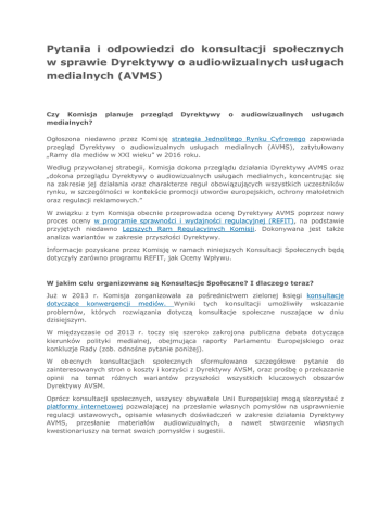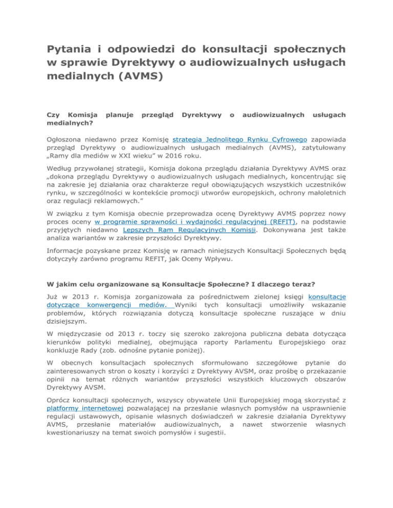 Pytania i odpowiedzi do konsultacji społecznych w sprawie Dyrektywy o audiowizualnych usługach medialnych (AVMS) Czy Komisja medialnych? planuje przegląd Dyrektywy o audiowizualnych usługach Ogłoszona niedawno przez Komisję strategia Jednolitego Rynku Cyfrowego zapowiada przegląd Dyrektywy o audiowizualnych usługach medialnych (AVMS), zatytułowany „Ramy dla mediów w XXI wieku” w 2016 roku. Według przywołanej strategii, Komisja dokona przeglądu działania Dyrektywy AVMS oraz „dokona przeglądu Dyrektywy o audiowizualnych usługach medialnych, koncentrując się na zakresie jej działania oraz charakterze reguł obowiązujących wszystkich uczestników rynku, w szczególności w kontekście promocji utworów europejskich, ochrony małoletnich oraz regulacji reklamowych.” W związku z tym Komisja obecnie przeprowadza ocenę Dyrektywy AVMS poprzez nowy proces oceny w programie sprawności i wydajności regulacyjnej (REFIT), na podstawie przyjętych niedawno Lepszych Ram Regulacyjnych Komisji. Dokonywana jest także analiza wariantów w zakresie przyszłości Dyrektywy. Informacje pozyskane przez Komisję w ramach niniejszych Konsultacji Społecznych będą dotyczyły zarówno programu REFIT, jak Oceny Wpływu. W jakim celu organizowane są Konsultacje Społeczne? I dlaczego teraz? Już w 2013 r. Komisja zorganizowała za pośrednictwem zielonej księgi konsultacje dotyczące konwergencji mediów. Wyniki tych konsultacji umożliwiły wskazanie problemów, których rozwiązania dotyczą konsultacje społeczne ruszające w dniu dzisiejszym. W międzyczasie od 2013 r. toczy się szeroko zakrojona publiczna debata dotycząca kierunków polityki medialnej, obejmująca raporty Parlamentu Europejskiego oraz konkluzje Rady (zob. odnośne pytanie poniżej). W obecnych konsultacjach społecznych sformułowano szczegółowe pytanie do zainteresowanych stron o koszty i korzyści z Dyrektywy AVSM, oraz prośbę o przekazanie opinii na temat różnych wariantów przyszłości wszystkich kluczowych obszarów Dyrektywy AVSM. Oprócz konsultacji społecznych, wszyscy obywatele Unii Europejskiej mogą skorzystać z platformy internetowej pozwalającej na przesłanie własnych pomysłów na usprawnienie regulacji ustawowych, opisanie własnych doświadczeń w zakresie działania Dyrektywy AVMS, przesłanie materiałów audiowizualnych, a nawet stworzenie własnych kwestionariuszy na temat swoich pomysłów i sugestii. Czym jest program Lepszych Regulacji? Założeniem Lepszych Regulacji jest tworzenie polityki i prawa w UE w taki sposób, aby osiągnąć cel jak najmniejszym kosztem. Lepsze Regulacje zostały przedstawione w Komunikacie Komisji Europejskiej z dnia 19 maja 2015 r. Program ten zapewnia opracowywanie, wdrażanie i przegląd polityki unijnej w sposób otwarty i przejrzysty, oparty o najlepsze dostępne dowody i wsparty udziałem zainteresowanych stron. Dla zapewnienia skuteczności działań UE, Komisja dokonuje oceny przewidywanych i rzeczywistych efektów swojej polityki, uchwalanych przepisów i innych istotnych środków legislacyjnych na każdym etapie cyklu tworzenia polityki unijnej ─ od planowania po wdrożenie, przegląd, a następnie poprawki. Czym jest program REFIT? Program sprawności i wydajności regulacyjnej (REFIT) stanowi element Lepszych Regulacji. Celem programu REFIT jest identyfikacja, ocena, przyjęcie i monitorowanie wdrażania inicjatyw prowadzących do uproszczenia regulacji oraz istotnej redukcji związanych z nimi kosztów. Dzięki temu możliwa stanie się pełna realizacja ustalonych celów, a korzyści z legislacji unijnych będą wiązały się z niższymi obciążeniami kosztowymi i regulacyjnymi. Dyrektywa AVMS zostanie poddana kontroli sprawności regulacyjnej w ramach programu REFIT Jakie są kryteria oceny Dyrektywy AVMS w ramach programu REFIT? Ramy programu REFIT ustanawiają następujące kryteria oceny legislacji unijnej: Istotność Wartość dodana UE Skuteczność Wydajność Spójność Komplementarność Jaki jest horyzont czasowy? Konsultacje społeczne potrwają do 30 września 2015 r. Przegląd Dyrektywy AVMS zostanie przeprowadzony w 2016 r. Czy są to pierwsze konsultacje społeczne w tej sprawie, organizowane przez Komisję? Nie. W 2013 r. Komisja Europejska zwróciła się do zainteresowanych stron o przekazanie opinii na temat zmieniającego się krajobrazu mediów oraz przekraczającego granice Internetu, w szczególności dotyczących warunków rynkowych, interoperacyjności i infrastruktury, oraz implikacji dla przepisów unijnych. W tym samym roku Komisja zorganizowała konsultacje społeczne w sprawie niezależności audiowizualnych organów regulacyjnych. Komisja zwróciła się o opinie zainteresowanych stron na temat konieczności wzmocnienia współpracy między organami regulacyjnymi oraz zwiększenia ich niezależności. Czy konsultacje społeczne są jedyną metodą gromadzenia przez Komisję dowodów na potrzeby oceny Dyrektywy? Nie. Komisja pozyska informacje i dane na temat dotychczasowego zastosowania Dyrektywy z kilku źródeł, m.in.: Odpowiedzi udzielone w ramach trzech konsultacji społecznych, zorganizowanych przez Komisję w 2013 r. (zob. powyżej). Pierwszego sprawozdania Komisji, dotyczącego stosowania Dyrektywy AVMS. W raporcie stwierdzono, że sektor audiowizualny przechodzi szybkie zmiany w zakresie technologii i praktyk biznesowych. W raporcie wykazano także, że niezbędne są dalsze prace nad problemami związanymi z telewizorami hybrydowymi i ich szybkim rozwojem. Pierwszego sprawozdania Komisji w sprawie promowania utworów europejskich w telewizji oraz usługach na żądanie na terenie UE za okres 2009-2010. Sprawozdań Europejskiego Obserwatorium Audiowizualnego. Sprawozdań Europejskiej Grupy Regulatorów ds. Audiowizualnych (ERGA) oraz opinii nt. polityki przekazanych przez przedstawicieli państw członkowskich w Komitecie Kontaktowym ds. Dyrektywy AVMS. Badań zamówionych przez Komi