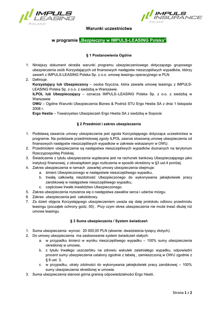 Warunki uczestnictwa w programie „Bezpieczny w IMPULS-LEASING Polska” (d alej: „program”) § 1 Postanowienia Ogólne 1. Niniejszy dokument określa warunki programu ubezpieczeniowego dotyczącego grupowego ubezpieczenia osób Korzystających od finansowych następstw nieszczęśliwych wypadków, którzy zawarli z IMPULS-LEASING Polska Sp. z o.o. umowę leasingu operacyjnego w PLN. 2. Definicje: Korzystający lub Ubezpieczony – osoba fizyczna, która zawarła umowę leasingu z IMPULSLEASING Polska Sp. z o.o. z siedzibą w Warszawie. ILPOL lub Ubezpieczający – oznacza IMPULS–LEASING Polska Sp. z o.o. z siedzibą w Warszawie OWU – Ogólne Warunki Ubezpieczenia Biznes & PodróŜ STU Ergo Hestia SA z dnia 1 listopada 2008 r. Ergo Hestia – Towarzystwo Ubezpieczeń Ergo Hestia SA z siedzibą w Sopocie § 2 Przedmiot i zakres ubezpieczenia 1. Podstawą zawarcia umowy ubezpieczenia jest zgoda Korzystającego dotycząca uczestnictwa w programie. Na podstawie przedmiotowej zgody ILPOL zawrze stosowną umowę ubezpieczenia od finansowych następstw nieszczęśliwych wypadków w zakresie wskazanym w OWU. 2. Przedmiotem ubezpieczenia są następstwa nieszczęśliwych wypadków doznanych na terytorium Rzeczypospolitej Polskiej. 3. Świadczenie z tytułu ubezpieczenia wypłacane jest na rachunek bankowy Ubezpieczającego jako instytucji finansowej, z obowiązkiem jego rozliczenia w sposób określony w §3 ust.4 poniŜej. 4. Zakres ubezpieczenia w ramach zawartej umowy ubezpieczenia obejmuje: a. śmierć Ubezpieczonego w następstwie nieszczęśliwego wypadku, b. trwałą całkowitą niezdolność Ubezpieczonego do wykonywania jakiejkolwiek pracy zarobkowej w następstwie nieszczęśliwego wypadku, c. częściowe trwałe inwalidztwo Ubezpieczonego. 5. Zakres ubezpieczenia rozszerza się o następstwa zawałów serca i udarów mózgu. 6. Zakres ubezpieczenia jest całodobowy. 7. Za dzień objęcia Korzystającego ubezpieczeniem uwaŜa się datę protokołu odbioru przedmiotu leasingu (początek ochrony godz. 00) . Przy czym okres ubezpieczenia nie moŜe trwać dłuŜej niŜ umowa leasingu. § 3 Suma ubezpieczenia / System świadczeń 1. Suma ubezpieczenia wynosi: 20 000,00 PLN (słownie: dwadzieścia tysięcy złotych). 2. Do umowy ubezpieczenia ma zastosowanie system świadczeń stałych: a. w przypadku śmierci w wyniku nieszczęśliwego wypadku – 100% sumy ubezpieczenia określonej w umowie, b. z tytułu trwałego uszczerbku na zdrowiu wskutek zaistniałego wypadku, odpowiedni procent sumy ubezpieczenia ustalony zgodnie z tabelą , zamieszczoną w OWU zgodnie z § 6 ust. 3, c. w przypadku, utraty zdolności do wykonywania jakiejkolwiek pracy zarobkowej – 100% sumy ubezpieczenia określonej w umowie. 3. Suma ubezpieczenia stanowi górna granicę odpowiedzialności Ergo Hestii. Strona 1 z 2 4. Podpisując umowę leasingową Korzystający automatycznie akceptuje następującą formę rozliczenia świadczenia naleŜnego z tytułu umowy ubezpieczenia: a. 100% naleŜnego odszkodowania, nie więcej niŜ suma ubezpieczenia wypłacane jest na rachunek bankowy Ubezpieczającego, z której to kwoty potrącane będą ewentualne zobowiązania Korzystającego wobec Ubezpieczającego z tytułu umowy leasingu, b. nadwyŜka uzyskanego odszkodowania ponad zobowiązania Korzystającego z tytułu umowy leasingu Ubezpieczający przekaŜe Korzystającemu, lub wskazanej przez niego osobie uprawnionej, niezwłocznie po dokonaniu rozliczenia, o którym mowa w ust. 4 pkt. a) niniejszego paragrafu. 5. Świadczenie z tytułu wystąpienia zdarzenia objętego umową ubezpieczenia Ergo Hestia wypłaca Ubezpieczającemu zgodnie z ustalonymi zasadami, o których mowa w § 3 ust 4 na podstawie wniosku o wypłatę świadczenia, złoŜonego przez Ubezpieczającego. § 4 Składka ubezpieczeniowa 1. Rozliczeń składki ubezpieczeniowej z Ergo Hestia dokonuje bezpośrednio Ubezpieczający. Składka ta będzie mu zwracana przez Korzystającego w ratach miesięcznych. Data płatności raty składki jest toŜsama z datą płatności rat leasingowych określoną w umowie leasingu. Składka (jej równowartość) będzie doliczana do faktur obejmujących raty leasingowe. 2. Dla umów leasingowych wieloletnich składka ubezpieczeniowa za kolejne lata jest niezmienna i jest płatna jednorazowo za cały okres leasingu. W przypadku okresu krótszego niŜ 12 miesięcy składka zostanie wyliczona w systemie pro rata temporis za faktyczny okres udzielonej ochrony ubezpieczeniowej. 3. Składka ubezpieczeniowa jest płatna od kaŜdego Korzystającego objętego ochroną w ramach niniejszej umowy. § 5 Obsługa Umowy Obsługę zawierania umów ubezpieczeń w imieniu Ubezpieczającego wykonywać będzie IMPULSINSURANCE Polska Sp. z o.o. IMPULS-INSURANCE Polska Sp. z o.o. Al. Jerozolimskie 212A 02-486 Warszawa [email protected] tel. 022 463 90 00 fax. 022 463 90 01 § 6 Postanowienia końcowe Warunki umowy ubezpieczenia regulują Ogólne Warunki Ubezpieczenia Biznes&PodróŜ z dnia 1 listopada 2008r STU Ergo Hestia SA (OWU), będące załącznikiem do niniejszego dokumentu. W przypadku sprzeczności pomiędzy niniejszymi warunkami a OWU, pierwszeństwo mają postanowienia OWU. Zarząd IMPULS-LEASING Polska Sp. z o.o. (-) Andrzej Gurak (-) Sławomir Sołtysiak Strona 2 z 2