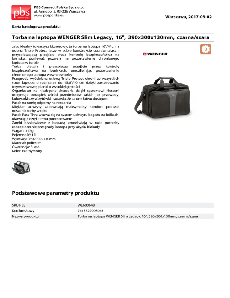 PBS Connect Polska Sp. z o.o. ul. Annopol 3, 03-236 Warszawa www.pbspolska.eu Warszawa, 2017-03-02 Karta katalogowa produktu: Torba na laptopa WENGER Slim Legacy, 16", 390x300x130mm, czarna/szara Jako idealny towarzysz biznesowy, ta torba na laptopa 16"/41cm z osłoną Triple Protect łączy w sobie konstrukcję usprawniającą i przyspieszającą przejście przez kontrolę bezpieczeństwa na lotnisku, ponieważ pozwala na pozostawienie chronionego laptopa w torbie Torba ułatwia i przyspiesza przejście przez kontrolę bezpieczeństwa na lotniskach, umożliwiając pozostawienie chronionego laptopa wewnątrz torby Przegroda wyściełana osłoną Triple Protect chroni ze wszystkich stron laptopa o rozmiarze do 15,6"/40 cm dzięki zastosowaniu trzywarstwowej pianki o wysokiej gęstości Organizator na niezbędne akcesoria dzięki systemowi kieszeni utrzymuje porządek wśród przedmiotów takich jak przewody, ładowarki czy wizytówki i sprawia, że są one łatwo dostępne Pasek na ramię odporny na rozdarcia Miękkie uchwyty zapewniają maksymalny komfort podczas noszenia torby w ręku Pasek Pass-Thru wsuwa się na system uchwytu bagażu na kółkach, ułatwiając dzięki temu podróżowanie Zamki błyskawiczne z blokadą umożliwiają w razie potrzeby zabezpieczenie przegrody laptopa przy użyciu blokady Waga: 1,12kg Pojemność: 15L Wymiary: 390x300x130mm Materiał: poliester Gwarancja: 3 lata Kolor: czarny/szary Podstawowe parametry produktu SKU PBS WE600648 Kod kreskowy 7613329008065 Nazwa produktu Torba na laptopa WENGER Slim Legacy, 16", 390x300x130mm, czarna/szara PBS Connect Polska Sp. z o.o. ul. Annopol 3, 03-236 Warszawa www.pbspolska.eu Warszawa, 2017-03-02 Karta katalogowa produktu cd. Torba na laptopa WENGER Slim Legacy, 16", 390x300x130mm, czarna/szara Podstawowe parametry produktu Kategoria Torby, teczki i plecaki Klasa Premium Marka WENGER Certyfikaty Nowy produkt w ofercie Standard Hit Standard Ilość lat gwarancji 3 Kolor Kolor Czarny/szary Cecha Produkt Torba slim Typ Na laptopa Rodzaj 16" W ofercie od 2016-06 Wymiary Wymiary (mm) 390x300x130 Wspólny słownik zamówień CPV 30237270-2 Torby na komputery przenośne Jednostki logistyczne Opakowanie 1 2 szt Opakowanie 2 48 szt