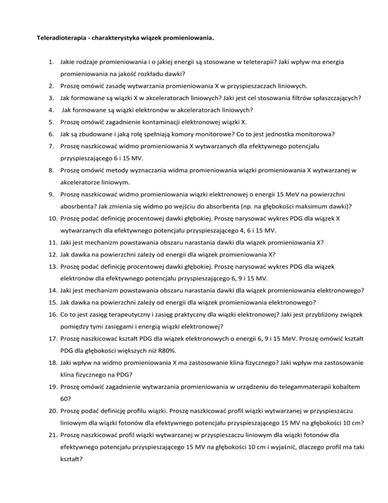 Teleradioterapia - charakterystyka wiązek promieniowania. 1. Jakie rodzaje promieniowania i o jakiej energii są stosowane w teleterapii? Jaki wpływ ma energia promieniowania na jakość rozkładu dawki? 2. Proszę omówić zasadę wytwarzania promieniowania X w przyspieszaczach liniowych. 3. Jak formowane są wiązki X w akceleratorach liniowych? Jaki jest cel stosowania filtrów spłaszczających? 4. Jak formowane są wiązki elektronów w akceleratorach liniowych? 5. Proszę omówić zagadnienie kontaminacji elektronowej wiązki X. 6. Jak są zbudowane i jaką rolę spełniają komory monitorowe? Co to jest jednostka monitorowa? 7. Proszę naszkicować widmo promieniowania X wytwarzanych dla efektywnego potencjału przyspieszającego 6 i 15 MV. 8. Proszę omówić metody wyznaczania widma promieniowania wiązki promieniowania X wytwarzanej w akceleratorze liniowym. 9. Proszę naszkicować widmo promieniowania wiązki elektronowej o energii 15 MeV na powierzchni abosrbenta? Jak zmienia się widmo po wejściu do absorbenta (np. na głębokości maksimum dawki)? 10. Proszę podać definicję procentowej dawki głębokiej. Proszę narysować wykres PDG dla wiązek X wytwarzanych dla efektywnego potencjału przyspieszającego 4, 6 i 15 MV. 11. Jaki jest mechanizm powstawania obszaru narastania dawki dla wiązek promieniowania X? 12. Jak dawka na powierzchni zależy od energii dla wiązek promieniowania X? 13. Proszę podać definicję procentowej dawki głębokiej. Proszę narysować wykres PDG dla wiązek elektronów dla efektywnego potencjału przyspieszającego 6, 9 i 15 MV. 14. Jaki jest mechanizm powstawania obszaru narastania dawki dla wiązek promieniowania elektronowego? 15. Jak dawka na powierzchni zależy od energii dla wiązek promieniowania elektronowego? 16. Co to jest zasięg terapeutyczny i zasięg praktyczny dla wiązki elektronowej? Jaki jest przybliżony związek pomiędzy tymi zasięgami i energią wiązki elektronowej? 17. Proszę naszkicować kształt PDG dla wiązek elektronowych o energii 6, 9 i 15 MeV. Proszę omówić kształt PDG dla głębokości większych niż R80%. 18. Jaki wpływ na widmo promieniowania X ma zastosowanie klina fizycznego? Jaki wpływ ma zastosowanie klina fizycznego na PDG? 19. Proszę omówić zagadnienie wytwarzania promieniowania w urządzeniu do telegammaterapii kobaltem 60? 20. Proszę podać definicję profilu wiązki. Proszę naszkicować profil wiązki wytwarzanej w przyspieszaczu liniowym dla wiązki fotonów dla efektywnego potencjału przyspieszającego 15 MV na głębokości 10 cm? 21. Proszę naszkicować profil wiązki wytwarzanej w przyspieszaczu liniowym dla wiązki fotonów dla efektywnego potencjału przyspieszającego 15 MV na głębokości 10 cm i wyjaśnić, dlaczego profil ma taki kształt? 22. Proszę naszkicować profil wiązki wytwarzanej w przyspieszaczu liniowym dla wiązki fotonów dla efektywnego potencjału przyspieszającego 6 MV na głębokości 10 cm. Co to jest półcień wiązki? Co jest miara wielkości półcienia? Jakie parametry wiązki X wpływają na wielkość półcienia? 23. jaki wpływ na profil wiązki mają modyfikatory zastosowane do formowania wiązki, kliny, tace do osłon? 24. Proszę naszkicować profil wiązki wytwarzanej w przyspieszaczu liniowym dla wiązki X dla efektywnego potencjału przyspieszającego 6 MV na głębokościach 5, 10 i 15 cm. Proszę wyjaśnić różnice pomiędzy profilami. 25. Proszę naszkicować profil wiązki wytwarzanej w przyspieszaczu liniowym dla wiązki elektronów o energii 12 MeV dawki maksymalnej i R50%. Proszę wyjaśnić różnice pomiędzy profilami. 26. Jak wyrażamy moc dawki dla wiązek przyspieszacza liniowego? Jak moc dawki zależy od wielkości pola dla wiązek fotonowych? 27. Jak wyrażamy moc dawki dla wiązek przyspieszacza liniowego? Jak moc dawki zależy od wielkości pola dla wiązek elektronowych? 28. Jak moc dawki dla wiązek fotonowych zależy od odległości SSD? 29. Jak moc dawki dla wiązek elektronowych zależy od odległości SSD? 30. Jak wytwarzane są wiązki terapeutyczne protonów? Protony, o jakiej energii są stosowane w radioterapii? 31. Co to jest zjawisko Bragga? Jak formowane są terapeutyczne wiązki protonowe? 32. W jaki sposób można uzyskać poszerzenie obszaru piku Bragga dla wiązek protonów? Proszę porównać te metody z punktu widzenia zastosowań klinicznych? 33. Jak wytwarzane są wiązki terapeutyczne jonów? Jony, o jakiej energii są stosowane w radioterapii? 34. Proszę naszkicować kształt izodoz dla wiązki promieniowania rtg 120 kV i mówić charakterystyczne cechy tego rozkładu. 35. Proszę naszkicować PDG dla wiązki fotonów wytwarzanej efektywnym potencjałem przyspieszającym 15 MV zmierzonej w fantomie o rozmiarach 20 x 20 x 20 cm3.. Proszę szczegółowo omówić kształt rozkładu blisko wyjścia wiązki z absorbenta.
