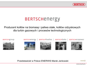 Producent kotłów na biomasę i paliwa stałe, kotłów odzyskowych dla turbin gazowych i procesów technologicznych Przedstawiciel w Polsce ENERWIS Marek Jankowski www.bertsch. Kotły na biomasę i pliwa stałe Kotły HRSG kogeneracja Kotły odzyskowe w przemyśle Aparaty dla przemyslu Grupa BERTSCH Referencje BERTSCHenergy jest producentem kotłów i instalacji kotłowych z ponad 85 letnim doświadczeniem. Nasza działalność skupia się na produkcji i projektowaniu kotłów parowych o parametrach: - moc do 100 MW, - ciśnienie do 150 bar, Posiadamy duże doświadczenie przy wykonywaniu całkowitych instalacji: - spalania różnego rodzajów biomasy i paliw stałych, różne układy rusztowe, - HRSG dla odzysku ciepła w układach z turbinami gazowymi, układach kombinowanych CCPP, - HRSG dla odzysku ciepła przy różnych procesach technologicznych w przemyśle, układy downstream, BERTSCHenergy dostarcza kompleksowe rozwiązania dla elektrociepłowni pracujących w cyklu kombinowanym dla turbin gazowych o mocy do 100MWe Certyfikaty: Pressure Equipment Directive 97/23/EC - CE marking; AD 2000-TRD-EN-ISO-3834-2; ÖNORM M 7812-T1; SVTI; ISO 9000; DIN 18800 Class E; Recertification Agreement TÜV-Austria; CHINA-Pressure Vessel Manufacture License; ASME U-Stamp; ASME S-Stamp www.bertsch.at Kotły na biomasę i pliwa stałe z rusztem ruchomym Kotły HRSG kogeneracja Kotły odzyskowe w przemyśle Aparaty dla przemyslu Grupa BERTSCH Referencje ze złożem fluidalnym Systemy kotłowe na biomasę i inne paliwa stałe z rusztem ruchomym / taśmowym Biorąc pod uwagę wysoki koszt pierwotnych źródeł energii, takich jak gaz czy ropa, i zwiększenie wymogów niskiej emisji CO2, biomasa stała się w ostatnich latach ważnym i bardzo wszechstronnym źródłem energii w Europie. Rodzaj biomasy: Zakres pracy: zrębki, kora, trociny, odpady biogenne, torf, odpady drzewne para 15-55 t/h, 40-130 bar, 400-520°C Rodzaj paleniska: - ruszt ruchomy chłodzony powietrzem lub wodą, taśmowy dla węgla kamiennego / brunatnego, - biomasa dostarczana przez popychacz lub podajnik obrotowy, - powietrze pierwotne kontrolowane we wszystkich 5 strefach pod spodem rusztu, powietrze wtórne pododawane z dużym impulsem przy wejściu do komory radiacyjnej, powietrze do spalania podgrzewane do max. 250°C, w zależności od wymagań danego paliwa, - gaz z recyrkulacji podawany pod i nad ruszt dla optymalnego procesu spalania. - ściany komory spalania są ścianami membranowymi chłodzone wodą, wyłożone ogniotrwałym materiałem, Technologia kotła: - kocioł z obiegiem naturalnym z dużą komorą spalania, drugie przejście jako radiacyjne, trzecie przejście z powierzchnią podgrzewaną konwekcyjnie, czwarte przez powierzchnie ekonomizera, - temperatura pary przegrzewacza kontrolowana za pomocą wtrysku wody pomiędzy poszczególnymi stopniami przegrzewacza, - powierzchnie grzewcze czyszczone zdmuchiwaczem sadzy i/lub grawitacyjnie kulkami metalowymi, Oczyszczanie gazów spalinowych: - wstępne separacja cyklonem podwójnym lub multicyklonem, - elektrofiltr lub filtr tekstylny, w zależności od rodzaju paliwa i regulacji prawnych dotyczących emisji, oddzielenie substancji toksycznych z gazów spalinowych poprzez suchą sorpcję, - redukcja NOx poprzez układ SNCR (w komorze radiacyjnej). Przykłady realizacji: IBV / Belgia Kraftanlagen / Niemcy Kaiserslautern / Niemcy www.bertsch.at Kotły na biomasę i pliwa stałe Kotły HRSG kogeneracja z rusztem ruchomym Zamówienie Nr Klient: Projekt: Rozruch: Kotły odzyskowe w przemyśle Aparaty dla przemyslu Grupa BERTSCH Referencje ze złożem fluidalnym J060114S Industrie du Bois Vielsalm & CIE s.a., Belgia Elektrociepłownia IBV na biomasę 2 kwartał 2008r. Dane techniczne: Moc wyjściowa elektryczna 20 Moc termiczna 2 x 40 Strumień pary (MCR) 2 x 44 Ciśnienie pary 65 Temperatura pary 485 Paliwo drewno i kora Przykłady realizacji: IBV / Belgia MWe MW t/h bar °C (W40-55) Zakres dostaw : - system transportu biomasy, - system podawania na ruszt, - ruchomy ruszt, - kocioł parowy z przegrzewaczem pary, - elektrofiltr i komin, - DCS & PCS, - układ pary i kondensacji, - uzdatnianie wody, - kompresory powietrza, Kraftanlagen / Niemcy Kaiserslautern / Niemcy www.bertsch.at Zakres dostaw klienta : prace budowlane, cykl woda-para, skraplacz, turbina parowa Kotły na biomasę i pliwa stałe Kotły HRSG kogeneracja z rusztem ruchomym Zamówienie Nr Klient: Projekt: Rozruch: Kotły odzyskowe w przemyśle Aparaty dla przemyslu Grupa BERTSCH Referencje ze złożem fluidalnym J090185S Kraftanlagen München GmbH / N-Ergie Sandreuth, Niemcy Elektrownia na biomasę 2 kwartał 2011r. Dane techniczne: Moc wyjściowa elektryczna 6 MWe Moc cieplna 23,1 MW Strumień pary (MCR) 25 t/h Ciśnienie pary 65 bar Temp. pary 485 °C Paliwo zrębki drzewne i upraw rolnych (W30-60) Ochrona środowiska zgodnie z EN/DGRL/TALuft/BimSchG Przykłady realizacji: IBV / Belgia Zakres dostaw : - wyposażenie układu zasilania paliwa, - kocioł rusztowy, - sterowniki przemysłowe, - zbiornik wody zasilającej, pompy wody zasilającej, odpowietrznik, - konstrukcje stalowe, Kraftanlagen / Niemcy Kaiserslautern / Niemcy www.bertsch.at Zakres dostaw klienta : prace budowlane i wyposażenie, woda/kondensat, kondensacja pary, turbina parowa, transport paliwa, system kontroli i pomiaru, komin Kotły na biomasę i pliwa stałe Kotły HRSG kogeneracja z rusztem ruchomym Miejsce: Projekt: Rozruch: Kotły odzyskowe w przemyśle Aparaty dla przemyslu Grupa BERTSCH ze złożem fluidalnym Kaiserslautern, Niemcy Kocioł węglowy z rusztem taśmowym 4 kwartał 2009r. Dane techniczne: Moc cieplna 33,5 Strumień pary (MCR) 36 Ciśnienie pary 82 Temp. Pary 525 Paliwo węgiel kamienny Przykłady realizacji: IBV / Belgia MW t/h bar °C Zakres dostaw : - wyposażenie układu zasilania paliwa, - kocioł rusztowy, - sterowniki przemysłowe, - zbiornik wody zasilającej, pompy wody zasilającej, odpowietrznik, - konstrukcje s