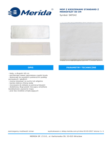 MOP Z KIESZENIAMI STANDARD Z MIKROFAZY 40 CM Symbol: SKP242 OPIS PARAMETRY TECHNICZNE - biały, o długości 40 cm - pochłaniaja nawet najmniejsze cząstki brudu - doskonałe do wszelkich powierzchni podłóg: porowatych i gładkich - można stosować na sucho lub wilgotno - bardzo dobrze chłoną wodę - mocowane do stelaża za pomocą kieszeni - dodatkowy długi pasek mocujący umożliwia bezdotykowe używanie mopa - prać bez środków zmiękczających zastrzegamy możliwość zmian wydrukowano z sklep.merida.com.pl dnia 02-03-2017 strona 1 z 1 MERIDA SP. Z O.O., ul. Karkonoska 59, 53-015 Wrocław