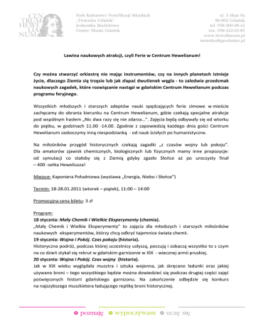 Lawina naukowych atrakcji, czyli Ferie w Centrum Hewelianum! Czy można stworzyć orkiestrę nie mając instrumentów, czy na innych planetach istnieje życie, dlaczego Ziemia się trzęsie lub jak złapać dwutlenek węgla - to zaledwie przedsmak naukowych zagadek, które rozwiązanie nastąpi w gdańskim Centrum Hewelianum podczas programu feryjnego. Wszystkich młodszych i starszych adeptów nauki spędzających ferie zimowe w mieście zachęcamy do obrania kierunku na Centrum Hewelianum, gdzie czekają specjalne atrakcje pod wspólnym hasłem „Nic dwa razy się nie zdarza…”. Zajęcia będą odbywały się od wtorku do piątku, w godzinach 11.00 -14.00. Zgodnie z zapowiedzią każdego dnia gości Centrum Hewelianum zaskoczymy inną niespodzianką - od nauk ścisłych po humanistyczne. Na miłośników przygód historycznych czekają zagadki „z czasów wojny lub pokoju”. Dla amatorów zjawisk chemicznych, biologicznych lub fizycznych mamy inne propozycje: od symulacji co stałoby się z Ziemią gdyby zgasło Słońce aż po uroczysty finał – 400 -setka Heweliusza! Miejsce: Kaponiera Południowa (wystawa „Energia, Niebo i Słońce”) Termin: 18-28.01.2011 (wtorek – piątek), 11:00 – 14:00 Promocyjna cena biletu: 3 zł Program: 18 stycznia: Mały Chemik i Wielkie Eksperymenty (chemia). „Mały Chemik i Wielkie Eksperymenty” to zajęcia dla młodszych i starszych miłośników naukowych eksperymentów, którzy chcą odkryć tajemnice świata chemii. 19 stycznia: Wojna i Pokój. Czas pokoju (historia). Historyczna podróż, podczas której uczestnicy usłyszą, poczują i zobaczą wszystko to z czym na co dzień stykał się rekrut w gdańskim garnizonie w XIX - wiecznej armii pruskiej. 20 stycznia: Wojna i Pokój. Czas wojny (historia). Jak w XIX wieku wyglądała musztra i sztuka wojenna, jak skręcano ładunki oraz jakiej używano broni – tego wszystkiego będzie można dowiedzieć się podczas drugiej części zajęć poświęconych historii gdańskiego garnizonu. Na zakończenie odbędzie się konkurs na najszybszego muszkietera ładującego replikę broni historycznej. 21 stycznia: Fizyka udomowiona (fizyka). Fizyka jest filozofią natury – tym stwierdzeniem udowodnimy, że nauka ta jest wszechobecna w naszym codziennym życiu. Podczas zajęć zaprezentujemy doświadczenia, które przy bardzo niewielkim nakładzie środków rodzice lub wychowawcy będą mogli powtórzyć w domu, inspirując w ten sposób swoje pociechy do podróży w fascynujący i egzotyczny świat naukowych odkryć. 25 stycznia: W Krainie Królowej Mrozu (fizyka/chemia). Zima kojarz się nam ze śniegiem, lodem a przede wszystkim mrozem i chłodem: -5°C, -10°C, czasem aż -20°C. Jednak nawet temperatury panujące w arktycznej zamieci są upałem w porównaniu z cieczą jaką jest ciekły azot. Zajęcia „W Krainie Królowej Mrozu” odkryją przed nami świat, w którym panuje temperatura - 196 °C! 26 stycznia: Podróż do wnętrza Ziemi (geografia). Co jest przyczyną wstrząsów sejsmicznych oraz jakie tajemnice kryje Ziemia w swoim wnętrzu - dzięki „Magic Planet” i trójwymiarowej projekcji na powierzchni kuli udamy się w wyjątkową podróż pod powierzchnię ziemskiej skorupy. 27 stycznia: Życie na krawędzi (astrobiologia). Czy jesteśmy sami we Wszechświecie – to jedno z intrygujących pytań, które stawia przed sobą nauka zwana astrobiologią. Specjalnie dla uczestników ferii w Centrum Hewelianum przygotowaliśmy pracownię astrobiologiczną, gdzie będzie można dowiedzieć się na przykład czym zajmują się naukowcy z NASA. 28 stycznia: 400 – setka Heweliusza (Wielki finał!). 28 stycznia przypada 400. rocznica urodzin naszego patrona Jana Heweliusza dlatego na wszystkich gości Centrum Hewelianum czekają specjalne atrakcje, w tym: - warsztaty z astronomii podczas których będzie można wykonać samodzielnie zdjęcie galaktyk, mgławic oraz innych obiektów 2-metrowym teleskopem Faulkesa na Hawajach, - pokaz specjalny Heweliusza - modelu jednego z dwóch pierwszych polskich satelitów wykonany przez Centrum Badań Kosmicznych PAN w skali 1:1, - warsztaty sklejania modeli satelity Heweliusz, - konkurs z nagrodami, - urodzinowy tort. Zapraszamy wszystkich spragnionych do spędzenia ferii w Centrum Hewelianum! zimowych wrażeń i lawiny odkryć