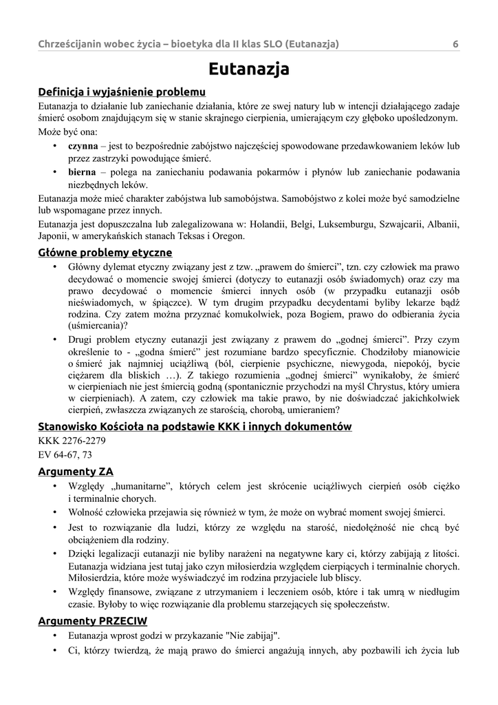 Chrześcijanin wobec życia – bioetyka dla II klas SLO (Eutanazja) 6 Eutanazja Definicja i wyjaśnienie problemu Eutanazja to działanie lub zaniechanie działania, które ze swej natury lub w intencji działającego zadaje śmierć osobom znajdującym się w stanie skrajnego cierpienia, umierającym czy głęboko upośledzonym. Może być ona: • czynna – jest to bezpośrednie zabójstwo najczęściej spowodowane przedawkowaniem leków lub przez zastrzyki powodujące śmierć. • bierna – polega na zaniechaniu podawania pokarmów i płynów lub zaniechanie podawania niezbędnych leków. Eutanazja może mieć charakter zabójstwa lub samobójstwa. Samobójstwo z kolei może być samodzielne lub wspomagane przez innych. Eutanazja jest dopuszczalna lub zalegalizowana w: Holandii, Belgi, Luksemburgu, Szwajcarii, Albanii, Japonii, w amerykańskich stanach Teksas i Oregon. Główne problemy etyczne • • Główny dylemat etyczny związany jest z tzw. „prawem do śmierci”, tzn. czy człowiek ma prawo decydować o momencie swojej śmierci (dotyczy to eutanazji osób świadomych) oraz czy ma prawo decydować o momencie śmierci innych osób (w przypadku eutanazji osób nieświadomych, w śpiączce). W tym drugim przypadku decydentami byliby lekarze bądź rodzina. Czy zatem można przyznać komukolwiek, poza Bogiem, prawo do odbierania życia (uśmiercania)? Drugi problem etyczny eutanazji jest związany z prawem do „godnej śmierci”. Przy czym określenie to - „godna śmierć” jest rozumiane bardzo specyficznie. Chodziłoby mianowicie o śmierć jak najmniej uciążliwą (ból, cierpienie psychiczne, niewygoda, niepokój, bycie ciężarem dla bliskich …). Z takiego rozumienia „godnej śmierci” wynikałoby, że śmierć w cierpieniach nie jest śmiercią godną (spontanicznie przychodzi na myśl Chrystus, który umiera w cierpieniach). A zatem, czy człowiek ma takie prawo, by nie doświadczać jakichkolwiek cierpień, zwłaszcza związanych ze starością, chorobą, umieraniem? Stanowisko Kościoła na podstawie KKK i innych dokumentów KKK 2276-2279 EV 64-67, 73 Argumenty ZA • • • • • Względy „humanitarne”, których celem jest skrócenie uciążliwych cierpień osób ciężko i terminalnie chorych. Wolność człowieka przejawia się również w tym, że może on wybrać moment swojej śmierci. Jest to rozwiązanie dla ludzi, którzy ze względu na starość, niedołężność nie chcą być obciążeniem dla rodziny. Dzięki legalizacji eutanazji nie byliby narażeni na negatywne kary ci, którzy zabijają z litości. Eutanazja widziana jest tutaj jako czyn miłosierdzia względem cierpiących i terminalnie chorych. Miłosierdzia, które może wyświadczyć im rodzina przyjaciele lub bliscy. Względy finansowe, związane z utrzymaniem i leczeniem osób, które i tak umrą w niedługim czasie. Byłoby to więc rozwiązanie dla problemu starzejących się społeczeństw. Argumenty PRZECIW • • Eutanazja wprost godzi w przykazanie "Nie zabijaj". Ci, którzy twierdzą, że mają prawo do śmierci angażują innych, aby pozbawili ich życia lub Chrześcijanin wobec życia – bioetyka dla II klas SLO (Eutanazja) • • • • • • • 7 w jakiś sposób uczestniczyli w tym (np. lekarze wydający opinię i kwalifikujący do eutanazji). Legalizacja eutanazji otwiera szerokie pole do nadużyć, np. wykonywanie eutanazji niedobrowolnych na osobach nieświadomych, wywieranie presji na osobach chorych, aby zgodziły się na eutanazję, by nie obciążać rodziny i społeczeństwa. Zmienia spojrzenie na lekarza, którego zadaniem jest ratowanie życia, a nie jego odbieranie. To może rodzić nieufność i lęk w relacji lekarz – pacjent. Rodzi utylitarystyczne podejście do ludzkiego życia: wartościowy jest tylko człowiek zdrowy i produktywny, natomiast stary i chory jest już niepotrzebny. Poważne wątpliwości budzi także kwestia pewności co do nieuleczalności danej choroby; postęp medycyny pokazuje, że zawsze istnieje prawdopodobieństwo odkrycia nowym metod leczniczych. Legalizacja eutanazji może sprawić, że nie będzie się szukać nowych metod leczenia niektórych chorób, gdyż taniej będzie uśmiercać pacjentów. Legalizacja eutanazji otwiera drzwi, których już się nie da zamknąć; przeciwnie – trzeba je będzie otwierać coraz szerzej, tzn. udostępniać eutanazję coraz szerszej grupie osób (np. już nie tylko terminalnie i nieuleczalnie chorym i cierpiącym fizycznie, ale również – chorym psychicznie, już nie tylko dorosłym, ale również dzieciom). Raz wprowadzone prawo trudno jest wycofać, natomiast łatwo poszerzyć. Jest to zasada tzw. „równi pochyłej”. Dobrym przykładem byłaby Belgia, która zalegalizował eutanazję w 2002 r. wyłącznie dla osób dorosłych; natomiast w 2014 r. rozszerzyła ją również na dzieci. Odrzuca sens cierpienia, przez które człowiek uczestniczy krzyżu Chrystusa. Propozycje rozwiązań alternatywnych, które nie budzą wątpliwości moralnych • • • Dobrze rozwinięty system hospicjów. Domy dziennego pobytu, gdzie rodziny mogłyby zostawiać swoje osoby starsze i chore na pewien czas, np. gdy są w pracy. Opieka paliatywna, czyli leczenie bólu. Dodatkowe informacje Od eutanazji należy odróżnić rezygnację z uporczywej terapii oraz działań, których pierwszorzędnym celem jest złagodzenie cierpień przez terapie paliatywne.
