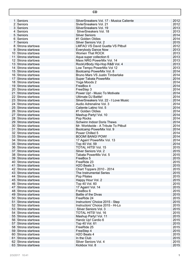 CD 1 2 3 4 5 6 7 8 9 10 11 12 13 14 15 16 17 18 19 20 21 22 23 24 25 26 27 28 29 30 31 32 33 34 35 36 37 38 39 40 41 42 43 44 45 46 47 48 49 50 51 52 53 54 55 56 57 58 59 60 61 62 63 Seniors Seniors Seniors Seniors Seniors Seniors Seniors Strona startowa Strona startowa Strona startowa Strona startowa Strona startowa Strona startowa Strona startowa Strona startowa Strona startowa Strona startowa Strona startowa Strona startowa Strona startowa Strona startowa Strona startowa Strona startowa Strona startowa Strona startowa Strona startowa Strona startowa Strona startowa Strona startowa Strona startowa Strona startowa Strona startowa Strona startowa Strona startowa Strona startowa Strona startowa Strona startowa Strona startowa Strona startowa Strona startowa Strona startowa Strona startowa Strona startowa Strona startowa Strona startowa Strona startowa Strona startowa Strona startowa Strona startowa Strona startowa Strona startowa Strona startowa Strona startowa Strona startowa Strona startowa Strona startowa Strona startowa Strona startowa Strona startowa Strona startowa Strona startowa Strona startowa Strona startowa 2/3/2017 10:41 SilverSneakers Vol. 17 - Musica Caliente SivlerSneakers Vol. 21 SilverSneakers Vol. 19 SilverSneakers Vol. 18 Silver Seniors #1 Golden Oldies Silver Seniors Vol. 2 LMFAO VS David Guetta VS Pitbull Everybody Dance Now Women That ROCK Aqua super collection 6 Maxx NRG PowerMix Vol. 14 RockUrBody Hip-Hop R&B Vol. 4 Low Tempo PowerMix Vol 12 Bootcamp PowerMix Vol. 8 Bruno Mars VS Justin Timberlake Super Tabata PowerMix Yoga Moods 2 FreeBox 4 FreeStep 3 Power Up! - Music To Motivate Ultimate DJ Battle! SilverSneakers Vol. 22 - I Love Music Audio Adrenaline Vol. 3 Caliente Latino Vol. 5 #1 Golden Oldies Mashup Party! Vol. 10 Pop Rocks Schwinn Indoor Doris Thews Mr. Worldwide - A Tribute To Pitbull Bootcamp PowerMix Vol. 9 Power Chilled 5 BOOM! BANG! POW! 17 Again! PowerMix Vol. 13 Top 40 Vol. 59 TOTAL HITS! Vol. 15 Silver Seniors Vol. 2 Tabata PowerMix Vol. 5 FreeBox 5 FreeRide 23 H2O Beats 3 Chart Toppers 2010 - 2014 The Instrumental Series Pop Pilates Happy Hour Vol. 2 Top 40 Vol. 60 17 Again! Vol. 14 FreeBox 6 Battle of the Divas FreeRide 24 Instructors' Choice 2015 - Step Instructors' Choice 2015 - Hi-Lo Silver Seniors Vol. 3 TOTAL HITS! Vol. 16 Mashup Party! Vol. 11 Handz Up! Cardio 6 Top 40 Vol. 61 FreeRide 25 FreeStep 4 H2O Beats 4 In the Club Silver Seniors Vol. 4 Kickbox Vol. 8 2012 2012 2013 2013 2014 2014 2015 2012 2013 2013 2013 2013 2013 2013 2014 2014 2014 2014 2014 2014 2014 2014 2014 2014 2014 2014 2014 2014 2014 2014 2014 2014 2014 2014 2014 2015 2015 2015 2015 2015 2015 2015 2015 2015 2015 2015 2015 2015 2015 2015 2015 2015 2015 2015 2015 2015 2015 2015 2015 2015 2015 2015 2015 1 64 65 66 67 68 69 70 71 72 73 74 75 76 77 78 79 80 81 82 83 84 85 86 87 88 89 90 91 92 93 94 95 96 97 98 99 100 101 102 103 104 105 106 107 108 109 110 111 112 113 114 115 116 117 118 119 120 121 122 123 124 125 126 127 128 129 Strona startowa Strona startowa Strona startowa Strona startowa Strona startowa Strona startowa Strona startowa Strona startowa Strona startowa Strona startowa Strona startowa Strona startowa Strona startowa Strona startowa Strona startowa Strona startowa Strona startowa Strona startowa Strona startowa Strona startowa Strona startowa Strona startowa Strona startowa Strona startowa Strona startowa Strona startowa Strona startowa Strona startowa Strona startowa Strona startowa Strona startowa Strona startowa Strona startowa Strona startowa Strona startowa Strona startowa Strona startowa Strona startowa Strona startowa Strona startowa Strona startowa Strona startowa Strona startowa Strona startowa Strona startowa Strona startowa Strona startowa Strona startowa Strona startowa Strona startowa Strona startowa Strona startowa Strona startowa Strona startowa Strona startowa Strona startowa Strona startowa Strona startowa Strona startowa Strona startowa Strona startowa Strona startowa Strona startowa Strona startowa Strona startowa Strona startowa 2/3/2017 10:41 Amy Dixon Cycling Stadium Anthems Dance Dance Dance - Funky Disco Mix Tabata PowerMix Vol. 6 Cardio Blast! PowerMix Vol. 2 TOTAL HITS! Vol. 17 Maxx NRG PowerMix Vol. 15 Low Tempo PowerMix 13 Silver Seniors Vol. 5 Cardio Warrior FreeRide 26 FreeStep 5 H2O Beats 5 POP goes RETRO Handz Up! Cardio 7 Viva Latino - Best of Latin Mashup Party! Vol. 12 20 Smash Hits! Top 40 Vol. 62 17 Again! Vol. 15 Best of 2015 FreeBox 7 FreeRide 27 Millennium Step & Conditioning H2O Beats 6 SHOCKWAVE Vol. 2 TOTAL HITS! Vol. 18 70's Hits Reloaded Mat Pilates Vol. 5 Latin Tabata PowerMix Bootcamp Vol. 10 Battle of the Brits! Cycling Shannon Fable Top AU Hits Silver Seniors Vol. 6 Music for Active Aging L. Biscontini Pop Pilates - POP 5 Instructors' Choice 2016 - Cardio Instructors' Choice 2016 - Step Top 40 Vol. 63 H2O Beats 7 FreeStep 6 FreeRide 28 FreeBox 8 Best of 2000's Vol 2 Tropical House PowerMix TOTAL HITS! Vol. 19 Ride PowerMix Vol. 4 Instrumental Cardio Gregg Cook Cykling Mashup Party! Vol. 13 PowerChilled 6 Best of 2016 HIIT IT! Outrageous Oldies The Loco-Motion Top 40 Vol. 65 Best of Mashup Party! Vol. 2 Free Box 9 FreeRide 29 Free Step 7 H2O Beats 8 Handz Up! Cardio 8 Top 40 Vol. 64 Chill - Tropical House Edition Silver Seniors Vol. 7 A Tribute to Prince & David Bowie 2015 2015 2015 2015 2015 2015 2015 2015 2015 2015 2015 2015 2015 2015 2015 2015 2015 2016 2016 2016 2016 2016 2016 2016 2016 2016 2016 2016 2016 2016 2016 2016 2016 2016 2016 2016 2016 2016 2016 2016 2016 2016 2016 2016 2016 2016 2016 2016 2016 2016 2016 2016 2016 2016 2016 2016 2016 2016 2016 2016 2016 2016 2016 2016 2016 2016 2 130 131 132 133 134 135 Strona startowa Strona startowa Strona startowa Strona startowa Strona startowa Strona startowa 2/3/2017 10:41 TOTAL HITS! Vol. 20 Instrumental Cardio A Tribute To Calvin Harris Handz Up! Cardio 9 Baby Boomer TOTAL HITS! Vol. 21 2016 2016 2017 2017 2017 2017 3