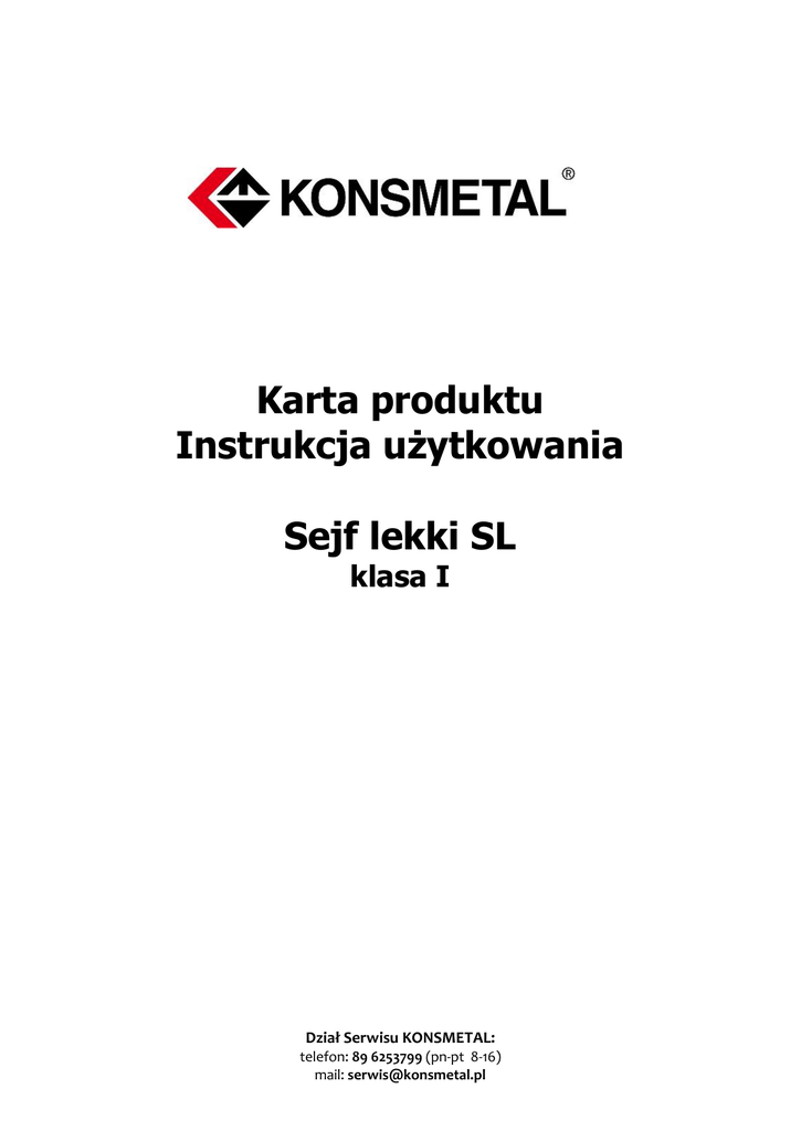 Karta produktu Instrukcja użytkowania Sejf lekki SL klasa I Dział Serwisu KONSMETAL: telefon: 89 6253799 (pn-pt 8-16) mail: [email protected] Sejfy lekkie SL, klasa I Spis treści Zastosowanie ........................................................................................................................ 3 Certyfikaty do przechowywania ......................................................................................... 3 Ważne – przeczytaj przed rozpoczęciem użytkowania sejfu ........................................ 4 Opis produktu ....................................................................................................................... 4 Wyposażenie podstawowe ................................................................................................. 5 Wyposażenie dodatkowe .................................................................................................... 5 Rodzaje zamków .................................................................................................................. 5 Standardowe kolory ............................................................................................................ 5 Dane techniczne .................................................................................................................. 6 Montaż do podłoża .............................................................................................................. 6 Obsługa sejfu – otwieranie ................................................................................................ 7 Obsługa sejfu – zamykanie ................................................................................................ 8 Montaż półek ........................................................................................................................ 9 Wymiana baterii w zamku elektronicznym ...................................................................... 9 Eksploatacja........................................................................................................................ 10 Konserwacja ....................................................................................................................... 10 Regulacja zawiasów .......................................................................................................... 11 Najczęściej występujące problemy i sposoby ich usunięcia ........................................ 12 Dane kontaktowe Serwisu KONSMETAL ........................................................................ 12 str. 2 Sejfy lekkie SL, klasa I Zastosowanie Sejfy lekkie SL służą do zabezpieczenia gotówki, czeków, weksli, papierów wartościowych, dokumentów niejawnych, broni oraz biżuterii. Wykorzystywane są, jako wyroby wolnostojące w biurach, sklepach, aptekach, szpitalach i mieszkaniach prywatnych. Certyfikaty do przechowywania Wartości pod nadzorem zgodnie z normą europejską PN-EN 1143-1:2012, klasa I; Możliwość przechowywania broni palnej i amunicji: o Produkt spełnia wymogi Rozporządzenia Ministra Spraw Wewnętrznych i Administracji z dnia 26 sierpnia 2014 r. w sprawie przechowywania, noszenia oraz ewidencjonowania broni i amunicji. o Produkt spełnia wymogi Rozporządzenia Ministra Spraw Wewnętrznych i Administracji dnia 11 grudnia 2013 r. zmieniającego rozporządzenia w sprawie zasad uzbrojenia specjalistycznych formacji ochronnych i warunków przechowywania oraz ewidencjonowania broni i amunicji. UWAGA! Aby zachować klasę odporności zgodnie z certyfikatem sejf czy szafa o wadze do 1000kg musi być zakotwiony do podłoża zgodnie z instrukcją. str. 3 Sejfy lekkie SL, klasa I Ważne – przeczytaj przed rozpoczęciem użytkowania sejfu Proszę uważnie zapoznać się z niniejszą instrukcją i stosować się do jej zapisów. Jeśli urządzenie wyposażone jest w zamek szyfrowy i/lub elektroniczny ZAWSZE pamiętaj o zmianie szyfru fabrycznego na własny, nieznany osobom postronnym, PRZED rozpoczęciem użytkowania urządzenia. Pozostawienie szyfru fabrycznego stanowi zagrożenie dla bezpieczeństwa zdeponowanych w nim wartości. Zmiana szyfru oraz test nowego szyfru w zamku szyfrowym lub elektronicznym MUSI być wykonywana na otwartych drzwiach sejfu. Zmieniając szyfr na zamkniętych drzwiach narażasz się na konieczność ich awaryjnego serwisowego otwarcia. Jeśli sejf jest wyposażony w klamkę lub pokrętło do poruszania rygli otwarcie lub domknięcie drzwi należy wykonywać WYŁĄCZNIE trzymając za klamkę lub pokrętło do poruszania rygli. Otwieranie czy zamykanie drzwi sejfu poprzez ciągnięcie za klucz, pokrętło zamka szyfrowego czy klawiaturę zamka elektronicznego może skutkować uszkodzeniem wyrobu niepodlegającym gwarancji. Przed zamknięciem drzwi sejfu KONIECZNIE sprawdź czy rygle są maksymalnie schowane. Wysunięte rygle podczas zamykania drzwi sejfu mogą uszkodzić powłokę lakierniczą w miejscu uderzenia rygli o krawędź otworu drzwiowego. Takie uszkodzenia nie są traktowane, jako podstawa do naprawy gwarancyjnej. Na końcu niniejszej instrukcji znajdują się opisy postępowania przy najczęściej występujących problemach. Opis produktu Rozbudowana konstrukcja drzwi i korpusu, wykonana z najwyższej jakości blachy o wysokiej odporności na sforsowanie; Ruchomy system ryglujący, poziomy i pionowy; Konstrukcja rygla stałego uniemożliwiająca wyrwanie drzwi; System zawiasowania wewnętrznego, kąt otwarcia drzwi 900 ; Każdy model wyposażony w klamkę; Przystosowane do mocowania do podłoża; Gwarancja 24 miesiące. str. 4 Sejfy lekkie SL, klasa I Wyposażenie podstawowe Zamek kluczowy kl. A z dwoma kluczami; Półki z regulacją wysokości zawieszenia (w zależności od modelu); maksymalne obciążenie półki 50 kg; Dwa otwory do kotwienia; Instrukcja obsługi i użytkowania wyrobu z kartą gwarancyjną. Wyposażenie dodatkowe Zamiana zamka kluczowego na szyfrowy lub elektroniczny; Dodatkowy 