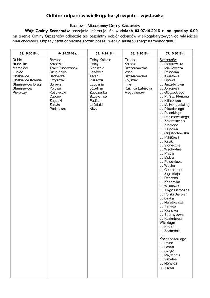 Odbiór odpadów wielkogabarytowych – wystawka Szanowni Mieszkańcy Gminy Szczerców Wójt Gminy Szczerców uprzejmie informuje, że w dniach 03-07.10.2016 r. od godziny 6.00 na terenie Gminy Szczerców odbędzie się bezpłatny odbiór odpadów wielkogabarytowych od właścicieli nieruchomości. Odpady będą odbierane sprzed posesji według następującego harmonogramu: 03.10.2016 r. Dubie Rudzisko Marcelów Lubiec Chabielice Chabielice Kolonia Stanisławów Drugi Stanisławów Pierwszy 04.10.2016 r. Brzezie Kozłówki Trakt Puszczański Szubienice Bednarze Krzyżówki Borowa Polowa Kościuszki Dzbanki Zagadki Załuże Podklucze 05.10.2016 r. Osiny Kolonia Osiny Kieruzele Janówka Tatar Puszcza Lubośnia Józefina Żabczanka Szubienice Podżar Leśniaki Niwy 06.10.2016 r. Grudna Kolonia Szczercowska Wieś Szczercowska Zbyszek Firlej Kuźnica Lubiecka Magdalenów 07.10.2016 r. Szczerców ul. Piotrkowska ul. Mickiewicza ul. Północna ul. Kwiatowa ul. Lipowa ul. Jarzębinowa ul. Akacjowa ul. Głowackiego ul. Pl. Św. Floriana ul. Kilińskiego ul. M. Konopnickiej ul. Piłsudskiego ul. Pułaskiego ul. Poniatowskiego ul. Żeromskiego ul. Źródlana ul. Targowa ul. Częstochowska ul. Piaskowa ul. Kącik ul. Słoneczna ul. Wschodnia ul. Praga ul. Mokra ul. Południowa ul. Wąska ul. Cmentarna ul. 3-go Maja ul. Rzeczna ul. Kopernika ul. Wiśniowa ul. 11-go Listopada ul. Polski Sierpień ul. Łaska ul. Narutowicza ul. Tenusa ul. Klonowa ul. Strumykowa ul. Kazimierza Wielkiego ul. Krótka ul. Zachodnia ul. Kochanowskiego ul. Polna ul. Leśna ul. Skryta ul. Reymonta ul. Szkolna ul. Norwida ul. Cicha MIEJSCOWOŚCI I ULICE ZOSTAŁY UŁOŻONE WEDŁUG KOLEJNOŚCI PRZEJAZDU. Odpady powstające w gospodarstwie domowym o rozmiarach wielkogabarytowych należy wystawić przed posesję lub do drogi dojazdowej. W ramach wystawki odbierane będą: radia, telewizory, monitory oraz inny sprzęt RTV, lodówki, pralki, kuchenki, odkurzacze oraz inny sprzęt AGD, opony do rozmiaru 1250x400, złom metalowy – rynny, rury, blachy, piece, dywany, wykładziny, meble duże opakowania– beczki, skrzynki, wiadra, elementy stolarki – listwy, deski, płyty wiórowe, drzwi, okna, szkło okienne i drzwiowe odpady zielone – powiązane gałęzie z drzew i krzewów, baterie i akumulatory. Jako odpady wielkogabarytowe nie są traktowane i nie będą odbierane: odpady poremontowe i budowlane: gruz, płytki, cegła, kamienie, odpady tekstylne: odzież, obuwie, tkaniny wystroju wnętrz (firany, zasłony, narzuty, koce), odpady powstające w ramach prowadzonej działalności gospodarczej, odpady zawierające azbest – eternit. Uwaga!!! Czas przeznaczony przez obsługującego na obsługę odbioru odpadów obejmuje: czas załadunku, przejazd i transport oraz czas rozładunków dla wszystkich wymienionych w danym dniu ulic i miejscowości. Mieszkańcom, którzy nie wystawią odpadów przed posesję do godziny 6:00 rano w wyznaczonym dniu nie gwarantujemy ich odbioru – samochody nie będą zawracane z trasy przejazdu na indywidualne zgłoszenie. Objazd wymienionymi miejscowościami i ulicami jest jednokrotny. Szczegółowe informacje można uzyskać pod numerem tel. 44 632 39 00.