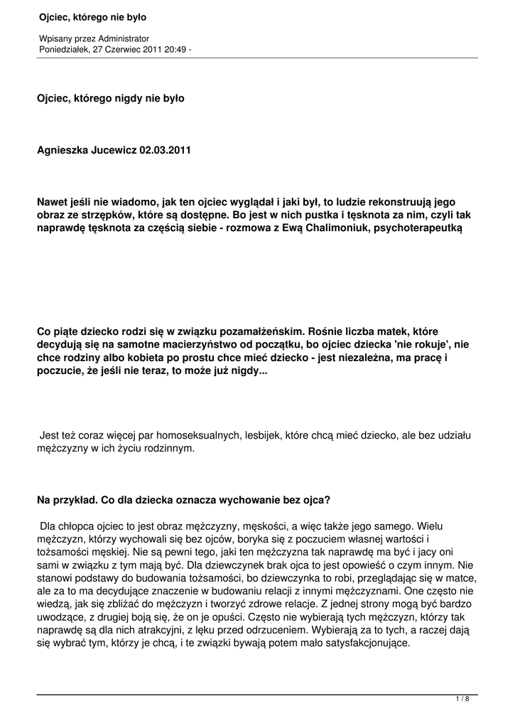 Ojciec, którego nie było Wpisany przez Administrator Poniedziałek, 27 Czerwiec 2011 20:49 - Ojciec, którego nigdy nie było Agnieszka Jucewicz 02.03.2011 Nawet jeśli nie wiadomo, jak ten ojciec wyglądał i jaki był, to ludzie rekonstruują jego obraz ze strzępków, które są dostępne. Bo jest w nich pustka i tęsknota za nim, czyli tak naprawdę tęsknota za częścią siebie - rozmowa z Ewą Chalimoniuk, psychoterapeutką Co piąte dziecko rodzi się w związku pozamałżeńskim. Rośnie liczba matek, które decydują się na samotne macierzyństwo od początku, bo ojciec dziecka 'nie rokuje', nie chce rodziny albo kobieta po prostu chce mieć dziecko - jest niezależna, ma pracę i poczucie, że jeśli nie teraz, to może już nigdy... Jest też coraz więcej par homoseksualnych, lesbijek, które chcą mieć dziecko, ale bez udziału mężczyzny w ich życiu rodzinnym. Na przykład. Co dla dziecka oznacza wychowanie bez ojca? Dla chłopca ojciec to jest obraz mężczyzny, męskości, a więc także jego samego. Wielu mężczyzn, którzy wychowali się bez ojców, boryka się z poczuciem własnej wartości i tożsamości męskiej. Nie są pewni tego, jaki ten mężczyzna tak naprawdę ma być i jacy oni sami w związku z tym mają być. Dla dziewczynek brak ojca to jest opowieść o czym innym. Nie stanowi podstawy do budowania tożsamości, bo dziewczynka to robi, przeglądając się w matce, ale za to ma decydujące znaczenie w budowaniu relacji z innymi mężczyznami. One często nie wiedzą, jak się zbliżać do mężczyzn i tworzyć zdrowe relacje. Z jednej strony mogą być bardzo uwodzące, z drugiej boją się, że on je opuści. Często nie wybierają tych mężczyzn, którzy tak naprawdę są dla nich atrakcyjni, z lęku przed odrzuceniem. Wybierają za to tych, a raczej dają się wybrać tym, którzy je chcą, i te związki bywają potem mało satysfakcjonujące. 1/8 Ojciec, którego nie było Wpisany przez Administrator Poniedziałek, 27 Czerwiec 2011 20:49 - Jaką funkcję spełnia ojciec w pierwszych latach życia dziecka? W okresie niemowlęcym ojciec jest tylko zmiennikiem kobiety. Takie małe dziecko jeszcze nie odróżnia płci i ojciec jest tym samym obiektem, który przewija, karmi, przytula, bierze na spacer, bawi się. Później zaczyna istnieć w świadomości dziecka jako drugi rodzic - ojciec. Ojciec zapewnia inne specyficzne doświadczenie, jest inny niż mama, przez to staje się ważną postacią w życiu dziecka. Tym, który pozwala oddalać się od mamy w bezpieczny sposób, odkrywać świat, ćwiczyć nowe umiejętności. Ojciec 4-5-letniego chłopca to równolegle przewodnik, autorytet i rywal. Dziecko symbiotycznie związane z matką ma ojca po to, by móc się bezpiecznie oddalić od mamy. Jednocześnie ojca, który zagraża tej wyjątkowej relacji z mamą. Chłopiec może chcieć wykluczyć ojca, by mieć mamę tylko dla siebie. Jeżeli para ma dobrą relację, to takie dziecko od ojca i od matki usłyszy nieraz, że to oni tworzą związek i że ono jest ich kochanym, ale jednak dzieckiem, i ono tę wiadomość z ulgą przyjmuje. Nawet jeśli fantazjuje, że się z mamą kiedyś ożeni, to rodzice mogą obrócić to w zabawę. Tata może też sprostować: to fajnie, że chcesz mieć taką wspaniałą dziewczynę jak mama, ale to jest moja dziewczyna, a ty znajdziesz sobie swoją, jak będziesz duży. I chłopiec dostaje wtedy komunikat, że mama jako partnerka nie jest dla niego, ale że kobiety są fajne i że on też taką fajną dziewczynę kiedyś może mieć. A kiedy tego realnego ojca nie ma? To chłopiec ma poczucie, że musi spełniać funkcję dorosłego mężczyzny, ale jednocześnie czuje, że tej funkcji nie udźwignie, i wtedy zaczyna się kształtować w nim to niepewne poczucie własnej wartości. Wydaje mu się, że jest partnerem mamy, czuje się za nią odpowiedzialny, ale wie, że jest za mały i że nie da rady. Nie obroni mamy, nie sprosta roli dorosłego mężczyzny. Czy matki mimowolnie traktują swojego syna jak powiernika, przyjaciela? Tak, z tym że najczęściej to jest obustronna gra. Zdarza się, że mamy, zwłaszcza jeśli zdecydowały się nie wchodzić w kolejny związek, za długo synów przy sobie trzymają. Wyjeżdżają z nimi na wczasy, kiedy oni mają już naście lat, chodzą z nimi na przyjęcia, do teatru. Mówią o nich z dumą: 'Mój mężczyzna', i traktują jak partnerów. Im to imponuje, bo w takim wieku czucie się facetem jest gratyfikujące, ale z drugiej strony boją się opuścić matkę, bo już jeden mężczyzna to zrobił. Obawiają się również, że coś ich ominie, jeżeli przy niej zostaną. Czego obawia się matka? Głównie samotności albo tego, że inna kobieta nie będzie dla niego taka dobra jak ona. Matki najczęściej nie robią tego świadomie. Często dają sprzeczne komunikaty, pytają: 'Czemu się nie żenisz? Czemu tutaj jeszcze mieszkasz?', a z drugiej strony: 'Co ja bez ciebie zrobię?', 'Twoja żona pewnie nie pozwoli ci się ze mną kontaktować', 'Moje życie straci sens' itd. Zdarza się, że u każdej nowej dziewczyny matka będzie szukała wad. Ale to jest obustronny miecz, bo taki 13-14-letni chłopiec przyzwyczajony, że mama jest tylko dla niego, może skutecznie przeganiać każdego potencjalnego partnera mamy. Jeżeli kobieta bardziej stawia na syna niż na siebie i ulegnie takiemu tupaniu nogami, to robi błąd. Bo potem z takim 15-latkiem może być jeszcze trudniej, a kiedy on będzie chciał odejść i zobaczy negatywne skutki tej symbiotycznej 2/8 Ojciec, którego nie było Wpisany przez Administrator Poniedziałek, 27 Czerwiec 2011 20:49 - relacji, to wtedy chętnie by widział jakiegoś pana, który się tą mamą zajmie, ale mama już najczęściej z tego aspektu życia zrezygnowała, poświęciła się dla syna i jeszcze, nie daj Boże, mu to mówi. To jest duży bagaż na życie dla takiego dziecka. Czy takiemu chłopcu jest trudniej nawiązać d
