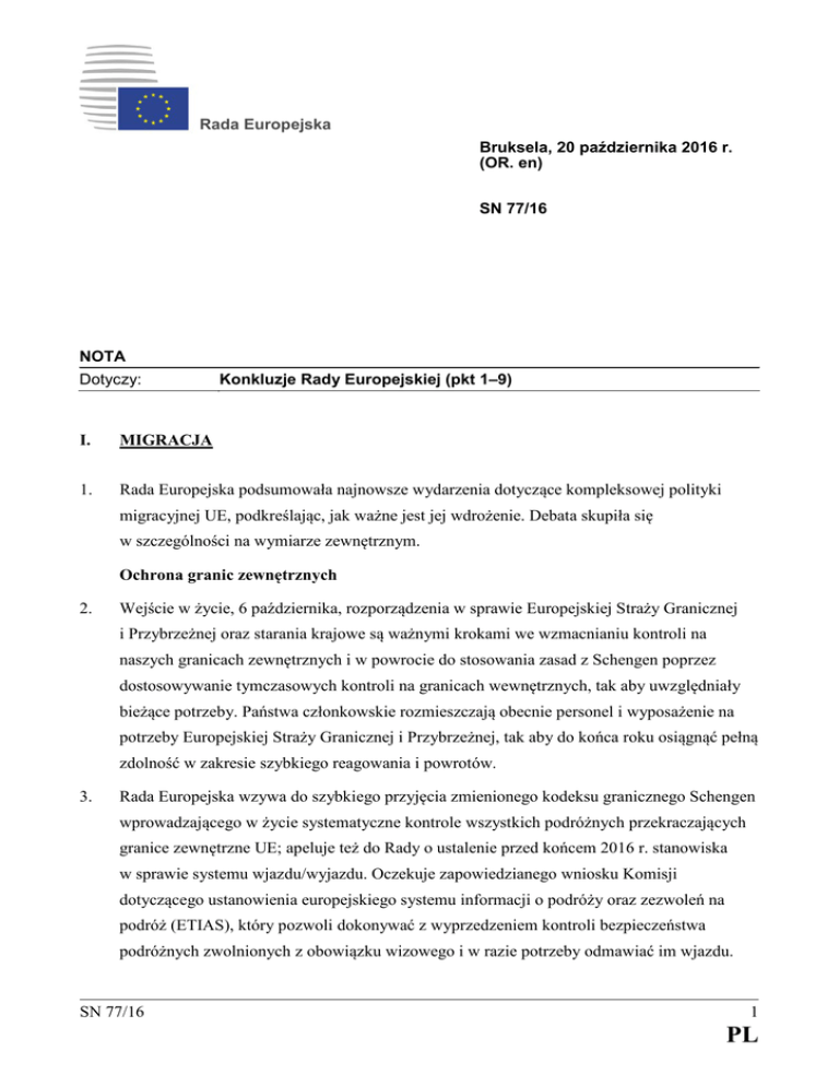 Rada Europejska Bruksela, 20 października 2016 r. (OR. en) SN 77/16 NOTA Dotyczy: Konkluzje Rady Europejskiej (pkt 1–9) I. MIGRACJA 1. Rada Europejska podsumowała najnowsze wydarzenia dotyczące kompleksowej polityki migracyjnej UE, podkreślając, jak ważne jest jej wdrożenie. Debata skupiła się w szczególności na wymiarze zewnętrznym. Ochrona granic zewnętrznych 2. Wejście w życie, 6 października, rozporządzenia w sprawie Europejskiej Straży Granicznej i Przybrzeżnej oraz starania krajowe są ważnymi krokami we wzmacnianiu kontroli na naszych granicach zewnętrznych i w powrocie do stosowania zasad z Schengen poprzez dostosowywanie tymczasowych kontroli na granicach wewnętrznych, tak aby uwzględniały bieżące potrzeby. Państwa członkowskie rozmieszczają obecnie personel i wyposażenie na potrzeby Europejskiej Straży Granicznej i Przybrzeżnej, tak aby do końca roku osiągnąć pełną zdolność w zakresie szybkiego reagowania i powrotów. 3. Rada Europejska wzywa do szybkiego przyjęcia zmienionego kodeksu granicznego Schengen wprowadzającego w życie systematyczne kontrole wszystkich podróżnych przekraczających granice zewnętrzne UE; apeluje też do Rady o ustalenie przed końcem 2016 r. stanowiska w sprawie systemu wjazdu/wyjazdu. Oczekuje zapowiedzianego wniosku Komisji dotyczącego ustanowienia europejskiego systemu informacji o podróży oraz zezwoleń na podróż (ETIAS), który pozwoli dokonywać z wyprzedzeniem kontroli bezpieczeństwa podróżnych zwolnionych z obowiązku wizowego i w razie potrzeby odmawiać im wjazdu. SN 77/16 1 PL Zajęcie się przepływami migracyjnymi Zapobieganie nielegalnej migracji wzdłuż szlaku środkowośródziemnomorskiego a) 4. Konieczne są większe wysiłki, by powstrzymać napływ migrantów o nieuregulowanym statusie, zwłaszcza z Afryki, oraz by zwiększyć odsetek powrotów. Uznając znaczący wkład, również o charakterze finansowym, wniesiony przez państwa członkowskie pierwszej linii w ostatnich latach, Rada Europejska: • przypomina, jak ważne jest kontynuowanie prac na rzecz realizacji ram partnerstwa w zakresie współpracy z poszczególnymi krajami pochodzenia lub tranzytu, w początkowej fazie ze szczególnym uwzględnieniem Afryki. Ich celem jest dążenie do osiągnięcia konkretnych i wymiernych rezultatów w zakresie zapobiegania nielegalnej migracji i w zakresie powrotów migrantów o nieuregulowanym statusie, jak również stworzenie i zastosowanie niezbędnych środków oddziaływania, przy wykorzystaniu wszelkich stosownych unijnych polityk, instrumentów i narzędzi, w tym w dziedzinie rozwoju i handlu; • przypomina o potrzebie zajęcia się pierwotnymi przyczynami migracji w regionie, również poprzez wspieranie wysiedleńców w regionie, co pomoże zapobiegać nielegalnej migracji, oraz podkreśla w tym kontekście wkład planu działań z Valletty oraz proponowany Plan inwestycji zewnętrznych. Z zadowoleniem przyjmuje Deklarację nowojorską w sprawie uchodźców i migrantów oraz wzywa wszystkie globalne podmioty, by wzięły na swoje barki obowiązki w tym zakresie; • przyjmuje do wiadomości dokument Komisji pt. „Pierwsze sprawozdanie z postępów w sprawie ram partnerstwa z krajami trzecimi w kontekście Europejskiego programu w zakresie migracji”; • wzywa wysoką przedstawiciel, w tym w jej roli wiceprzewodniczącej Komisji, by na grudniowym posiedzeniu Rady Europejskiej przedstawiła postępy w pięciu wybranych afrykańskich państwach i pierwsze wyniki osiągnięte w zakresie przyjazdów i powrotów. Postępy te określą kierunek dalszych prac nad umowami oraz umożliwią rozszerzenie zakresu tego podejścia, tak by objąć nim inne państwa; • wzywa wszystkie podmioty do kontynuowania bliskiej współpracy nad umowami z myślą o intensyfikacji ich operacyjnej realizacji, a państwa członkowskie – do wzmocnienia krajowych procedur administracyjnych służących przeprowadzaniu powrotów. SN 77/16 2 PL Utrzymanie i zaostrzenie kontroli na szlaku wschodniośródziemnomorskim b) 5. By ustabilizować sytuację na szlaku wschodniośródziemnomorskim w sposób trwały, trzeba kontynuować realizację oświadczenia UE–Turcja oraz dalej wspierać kraje położone wzdłuż szlaku zachodniobałkańskiego. Rada Europejska apeluje: • o dalsze starania na rzecz przyspieszenia powrotów z wysp greckich do Turcji, zgodnie z oświadczeniem UE–Turcja, zwłaszcza przez poprawę skuteczności i szybkości procedur azylowych; • o szybkie powołanie stałych koordynatorów w punktach szybkiej rejestracji migrantów („hotspotach”) w Grecji; • do państw członkowskich, aby w pełni odpowiedziały na apele o wskazane przez właściwe agencje UE zasoby potrzebne do tego, by pomóc Grecji; • o dalsze postępy w realizacji pełnego zakresu zawartych w oświadczeniu UE–Turcja zobowiązań wobec wszystkich państw członkowskich, także w zakresie liberalizacji reżimu wizowego. Zachęca się współprawodawców, by w ciągu najbliższych kilku tygodni osiągnęli porozumienie co do zmiany mechanizmu zawieszającego zwolnienie z obowiązku wizowego. 6. Rada Europejska z zadowoleniem przyjmuje postępy poczynione w opracowywaniu umów z Libanem i Jordanią w celu zwiększenia wsparcia dla uchodźców i społeczności przyjmujących w obu krajach, a także podpisanie 2 października dokumentu pt. „Wspólna droga naprzód w kwestiach migracji w stosunkach między UE a Afganistanem”, z myślą o stawieniu czoła wyzwaniom związanym z migracją nieuregulowaną i udoskonaleniu praktycznej współpracy w zakresie powrotów, readmisji i reintegracji. c) Zachowanie czujności w odniesieniu do innych szlaków 7. UE będzie kontynuować współpracę z innymi krajami i ściśle monitorować przepływy wzdłuż innych szlaków migracyjnych, w tym wzdłuż szlaku zachodniośródziemnomorskiego, tak by móc szybko reagować na rozwój wydarzeń. SN 77/16 3 PL Zajęcie się 