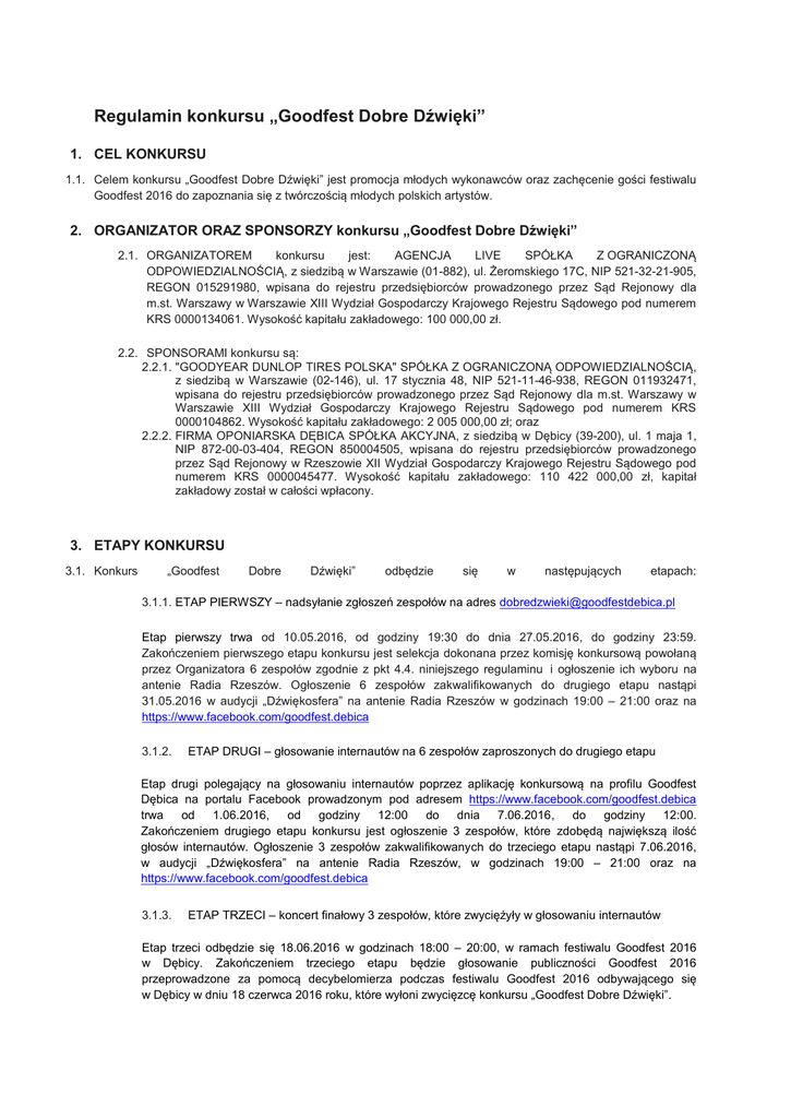 Regulamin konkursu „Goodfest Dobre Dźwięki” 1. CEL KONKURSU 1.1. Celem konkursu „Goodfest Dobre Dźwięki” jest promocja młodych wykonawców oraz zachęcenie gości festiwalu Goodfest 2016 do zapoznania się z twórczością młodych polskich artystów. 2. ORGANIZATOR ORAZ SPONSORZY konkursu „Goodfest Dobre Dźwięki” 2.1. ORGANIZATOREM konkursu jest: AGENCJA LIVE SPÓŁKA Z OGRANICZONĄ ODPOWIEDZIALNOŚCIĄ, z siedzibą w Warszawie (01-882), ul. Żeromskiego 17C, NIP 521-32-21-905, REGON 015291980, wpisana do rejestru przedsiębiorców prowadzonego przez Sąd Rejonowy dla m.st. Warszawy w Warszawie XIII Wydział Gospodarczy Krajowego Rejestru Sądowego pod numerem KRS 0000134061. Wysokość kapitału zakładowego: 100 000,00 zł. 2.2. SPONSORAMI konkursu są: 2.2.1. "GOODYEAR DUNLOP TIRES POLSKA" SPÓŁKA Z OGRANICZONĄ ODPOWIEDZIALNOŚCIĄ, z siedzibą w Warszawie (02-146), ul. 17 stycznia 48, NIP 521-11-46-938, REGON 011932471, wpisana do rejestru przedsiębiorców prowadzonego przez Sąd Rejonowy dla m.st. Warszawy w Warszawie XIII Wydział Gospodarczy Krajowego Rejestru Sądowego pod numerem KRS 0000104862. Wysokość kapitału zakładowego: 2 005 000,00 zł; oraz 2.2.2. FIRMA OPONIARSKA DĘBICA SPÓŁKA AKCYJNA, z siedzibą w Dębicy (39-200), ul. 1 maja 1, NIP 872-00-03-404, REGON 850004505, wpisana do rejestru przedsiębiorców prowadzonego przez Sąd Rejonowy w Rzeszowie XII Wydział Gospodarczy Krajowego Rejestru Sądowego pod numerem KRS 0000045477. Wysokość kapitału zakładowego: 110 422 000,00 zł, kapitał zakładowy został w całości wpłacony. 3. ETAPY KONKURSU 3.1. Konkurs „Goodfest Dobre Dźwięki” odbędzie się w następujących etapach: 3.1.1. ETAP PIERWSZY – nadsyłanie zgłoszeń zespołów na adres [email protected] Etap pierwszy trwa od 10.05.2016, od godziny 19:30 do dnia 27.05.2016, do godziny 23:59. Zakończeniem pierwszego etapu konkursu jest selekcja dokonana przez komisję konkursową powołaną przez Organizatora 6 zespołów zgodnie z pkt 4.4. niniejszego regulaminu i ogłoszenie ich wyboru na antenie Radia Rzeszów. Ogłoszenie 6 zespołów zakwalifikowanych do drugiego etapu nastąpi 31.05.2016 w audycji „Dźwiękosfera” na antenie Radia Rzeszów w godzinach 19:00 – 21:00 oraz na https://www.facebook.com/goodfest.debica 3.1.2. ETAP DRUGI – głosowanie internautów na 6 zespołów zaproszonych do drugiego etapu Etap drugi polegający na głosowaniu internautów poprzez aplikację konkursową na profilu Goodfest Dębica na portalu Facebook prowadzonym pod adresem https://www.facebook.com/goodfest.debica trwa od 1.06.2016, od godziny 12:00 do dnia 7.06.2016, do godziny 12:00. Zakończeniem drugiego etapu konkursu jest ogłoszenie 3 zespołów, które zdobędą największą ilość głosów internautów. Ogłoszenie 3 zespołów zakwalifikowanych do trzeciego etapu nastąpi 7.06.2016, w audycji „Dźwiękosfera” na antenie Radia Rzeszów, w godzinach 19:00 – 21:00 oraz na https://www.facebook.com/goodfest.debica 3.1.3. ETAP TRZECI – koncert finałowy 3 zespołów, które zwyciężyły w głosowaniu internautów Etap trzeci odbędzie się 18.06.2016 w godzinach 18:00 – 20:00, w ramach festiwalu Goodfest 2016 w Dębicy. Zakończeniem trzeciego etapu będzie głosowanie publiczności Goodfest 2016 przeprowadzone za pomocą decybelomierza podczas festiwalu Goodfest 2016 odbywającego się w Dębicy w dniu 18 czerwca 2016 roku, które wyłoni zwycięzcę konkursu „Goodfest Dobre Dźwięki”. 4. WARUNKI ZGŁOSZENIA I UCZESTNICTWA 4.1. Zgłoszenia do konkursu „Goodfest Dobre Dźwięki” przyjmowane są pod adresem [email protected] 4.2. Zgłoszenia przyjmowane są od 10.05.2016, od godziny 19:30 do dnia 27.05.2016, do godziny 23:59. 4.3. Każde zgłoszenie musi zawierać: dane kontaktowe przedstawiciela zespołu (imię i nazwisko, numer telefonu i adres e-mail), krótką informację o zespole wraz ze zdjęciem przedstawiającym zespół, link do próbki muzycznej zespołu (tzw. sampla stanowiącego utwór muzyczny wykonany przez zespół) oraz zeskanowane oświadczenia wszystkich członków zgłaszanych zespołów o akceptacji postanowień niniejszego regulaminu oraz zobowiązania do ich przestrzegania. Oryginały oświadczeń muszą zostać dostarczone do siedziby Organizatora do zakończenia przyjmowania zgłoszeń. Wzór oświadczenia stanowi załącznik nr 1 do niniejszego regulaminu. 4.4. Spośród zgłoszonych zespołów, na podstawie przesłanych sampli, komisja konkursowa wybierze 6 zespołów, które zostaną zaproszone do drugiego etapu konkursu. Podczas głosowania komisji konkursowej każdy z jej członków – według swojego uznania, biorąc pod uwagę poziom artystyczny zgłoszonych zespołów – przyzna każdemu zespołowi od 0 do 20 punktów. W przypadku jednakowej liczbie przyznanych punktów dla danego zespołu rozstrzygający będzie głos Przewodniczącego komisji konkursowej. 4.5. Wyboru zespołów zaproszonych do udziału w drugim etapie konkursu „Goodfest Dobre Dźwięki” dokona komisja konkursowa w składzie: 2 przedstawicieli Radia Rzeszów oraz 1 przedstawiciel Organizatora. 4.6. Zespoły zaproszone do 2 etapu konkursu poprzez zgłoszenie do konkursu wyrażają zgodę na zaprezentowanie opisu i zdjęcia zespołu oraz zgłoszonego utworu w aplikacji konkursowej na profilu Goodfest Dębica na portalu Facebook pod adresem https://www.facebook.com/goodfest.debica. 4.7. 3 zespoły, które w drugim etapie konkursu zdobędą najwięcej głosów internautów w głosowaniu przeprowadzonym poprzez aplikację konkursową na profilu Goodfest Dębica na portalu Facebook pod adresem https://www.facebook.com/goodfest.debica, zostaną zaproszone na koncert organizowany w ramach festiwalu Goodfest 2016. 4.8. Koncerty 3 zespołów wyłonionych w konkursie odbędą się 18.06.2016, na scenie głównej festiwalu Goodfest 2016 odbywającego się w Dębicy, w godzinach 18:00 – 20:00. Koncert każdego z z