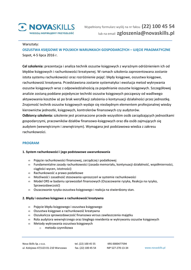 (22) 100 45 54 lub na email [email protected] Wypełniony formularz wyślij na nr faksu Warsztaty: OSZUSTWA KSIĘGOWE W POLSKICH WARUNKACH GOSPODARCZYCH – UJĘCIE PRAGMATYCZNE Sopot, 4-5 lipca 2016 r. Cel szkolenia: prezentacja i analiza technik oszustw księgowych z wyraźnym odróżnieniem ich od błędów księgowych i rachunkowości kreatywnej. W ramach szkolenia zaprezentowana zostanie istota systemu rachunkowości oraz rozróżnienie pojęć: błędy księgowe, oszustwa księgowe, rachunkowość kreatywna. Przedstawiona zostanie systematyka i ewolucja metod wykrywania oszustw księgowych wraz z odpowiedzialnością za popełnianie oszustw księgowych. Szczegółowej analizie zostaną poddane pojedyncze techniki oszustw księgowych począwszy od wadliwego aktywowania kosztów aż po brak weryfikacji założenia o kontynuacji działalności przez jednostkę. Znajomość technik oszustw księgowych wydaje się niezbędnym elementem profesjonalnej wiedzy kierownictw jednostki, księgowych, kontrolerów finansowych czy audytorów. Odbiorcy szkolenia: szkolenie jest przeinaczone przede wszystkim osób zarządzających jednostkami gospodarczymi, pracowników działów finansowo-księgowych oraz dla osób zajmujących się audytem (wewnętrznym i zewnętrznym). Wymagana jest podstawowa wiedza z zakresu rachunkowości. PROGRAM 1. System rachunkowości i jego podstawowe uwarunkowania • • • • • • Pojęcie rachunkowości finansowej, zarządczej i podatkowej Fundamentalne zasady rachunkowości (zasada memoriału, kontynuacji działalność, współmierności, ciągłości wycen, istotności) Rachunkowość a prawo podatkowe Możliwość i zasadność stosowania uproszczeń w systemie rachunkowości Model ORS w badaniu sprawozdań finansowych (Oszacowanie ryzyka, Reakcja na ryzyko, Sprawozdawczość) Oszacowanie ryzyka oszustwa księgowego i reakcja na stwierdzony stan. 2. Błędy i oszustwa księgowe a rachunkowość kreatywna • • • • • Pojęcie błędu księgowego i oszustwa księgowego Oszustwa księgowe a rachunkowość kreatywna Oszukańcza sprawozdawczość finansowa versus zawłaszczenia majątku Rola audytora wewnętrznego oraz biegłego rewidenta w wykrywaniu oszustw księgowych Metody wykrywania oszustwa księgowych o metoda czynnikowa Nova Skills Sp. z o.o. ul. Kolejowa 47/U23 01-210 Warszawa tel. (22) 100 45 55 fax. (22) 100 45 54 KRS 0000477594 NIP 527-270-13-34 www.novaskills.pl (22) 100 45 54 lub na email [email protected] Wypełniony formularz wyślij na nr faksu analiza „czerwonych flag” „Trójkąt oszustwa” Statystyczne metody diagnozowania ryzyka oszustwa o pojecie manipulatorzy i niemanipulatorzy o wartości graniczne wskaźników finansowych dla manipulatorów i niemanipulatorów o model Beneisha o modele bazujące na kategorii rozliczeń miedzyokresowych i zarządzaniu zyskami o rozkłady statystyczny a ryzyko oszustwa Odpowiedzialność za popełnianie oszustw księgowych (karna, cywilna) Skala, zakres i charakter oszustw księgowych w polskich realiach gospodarczych oraz na świecie o o • • • 3. Analiza wybranych technik oszustw księgowych • • • • • • • • • • • • • • • • Wadliwe aktywowanie kosztów (np. remont a modernizacja) Prezentacja kosztów prac badawczych i rozwojowych Manipulacja odpisami amortyzacyjnymi i wartością rezydualną Tworzenie ukrytych (cichych) rezerw Wadliwa wycena należności i zapasów Przyspieszone fakturowanie i manipulowanie okresem uznawania przychodu Sprzedaż z klauzulą odkupu Kontrakty długoterminowe – procent realizacji i ujawnianie straty Kapitała własny a zobowiązania Uznaniowa prezentacja leasingu i umów pokrewnych Tendencyjna wycena udziałów i akcji obcych Wartość godziwa, jako podstawa wyceny aktywów i zobowiązań Wykorzystywanie uproszczeń w systemie rachunkowości (pojęcie istotności) Ceny transferowe w krajowych i międzynarodowych oszustwach księgowych Weryfikacja założenia o kontynuacji działalności – brak ujawniania zagrożeń operacyjnych i finansowych i ich skutków Prognoza upadłości z wykorzystaniem analizy dyskryminacyjnej EKSPERT: Prof. nadzw. dr hab. Artur Hołda, CICA Prof. nadzw. Uniwersytetu Ekonomicznego w Krakowie (UEK) oraz Wyższej Szkoły Ekonomii i Informatyki w Krakowie (WSEI). Pracownik naukowodydaktyczny Katedry Rachunkowości UEK oraz Kierownik Zakładu Finansów i Rachunkowości w WSEI. Jest autorem i współautorem ponad 100 opracowań, w tym o charakterze książkowym, z dziedziny rachunkowości i finansów. Szeroko współpracuje z praktyką gospodarczą w tym z międzynarodowymi grupami kapitałowymi. Prowadzi obligatoryjne szkolenia dla biegłych rewidentów w Polsce, jak również zajęcia na studiach MBA (Master of Business Administration). Posiada certyfikat dyplomowanego księgowego IFAC oraz jest audytorem II stopnia PIKW, jak również ma kwalifikacje zawodowe Certyfikowanego Audytora ds. (systemów) Kontroli Wewnętrznych - CICA (Certified Internal Controls Auditor). Nova Skills Sp. z o.o. ul. Kolejowa 47/U23 01-210 Warszawa tel. (22) 100 45 55 fax. (22) 100 45 54 KRS 0000477594 NIP 527-270-13-34 www.novaskills.pl (22) 100 45 54 lub na email [email protected] Wypełniony formularz wyślij na nr faksu DANE UCZESTNIKÓW 1 osoba Imię i Nazwisko FORMULARZ ZGŁOSZENIOWY Warsztaty: OSZUSTWA KSIĘGOWE W POLSKICH WARUNKACH GOSPODARCZYCH – UJĘCIE PRAGMATYCZNE Sopot, 4-5 lipca 2016 r Stanowisko Email Telefon 2 osoba Imię i Nazwisko HOTEL REZYDENT Stanowisko 950.00 PLN + VAT (do 23 czerwca 2016 r) 1250.00 PLN + VAT (od 24 czerwca 2016 r) Email Telefon 3 osoba W ramach uczestnictwa zapewniamy również: materiały drukowane, lunch bufet, nielimitowany bufet kawowy (kawa, herbata, soki, woda, ciastka, owoce) oraz certyfikat ukończenia szkolenia. Imię i Nazwisko Stanowisko Email Telefon DANE OSOBY ZGŁASZAJĄCEJ (DO KONTAKTU) Imię i Nazwisko Stanowisko Email Telefon 2. Po otrzymaniu formularza zgłoszenio