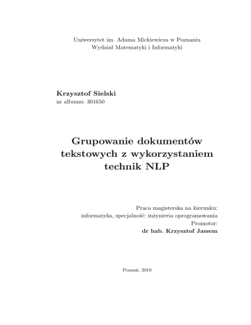 i Informatyki Uniwersytetu im. Adama Mickiewicza w Poznaniu, oświadczam, że przedkładaną pracę dyplomową pt.: Grupowanie dokumentów tekstowych z wykorzystaniem technik NLP napisałem samodzielnie. Oznacza