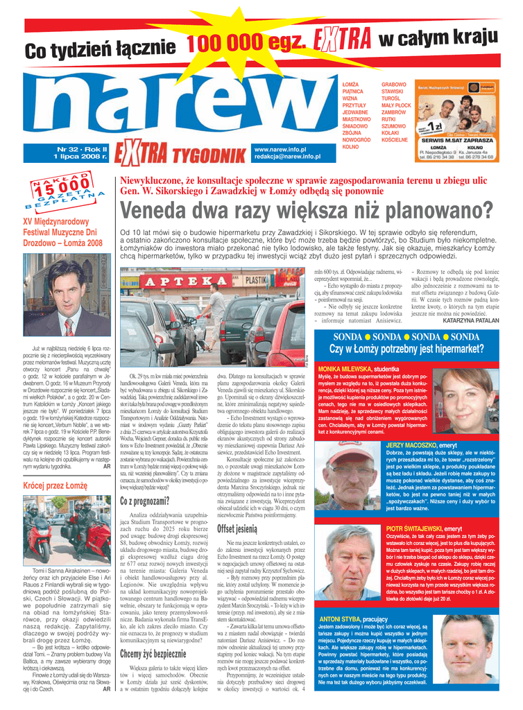 w całym kraju . z g e 0 0 0 0 0 1 ie zn c łą ń e zi d Co ty Nr 32 • Rok II 1 lipca 2008 r. www.narew.info.pl [email protected] ŁOMŻA PIĄTNICA WIZNA PRZYTUŁY JEDWABNE MIASTKOWO ŚNIADOWO ZBÓJNA NOWOGRÓD KOLNO GRABOWO STAWISKI TUROŚL MAŁY PŁOCK ZAMBRÓW RUTKI SZUMOWO KOŁAKI KOŚCIELNE Niewykluczone, że konsultacje społeczne w sprawie zagospodarowania terenu u zbiegu ulic Gen. W. Sikorskiego i Zawadzkiej w Łomży odbędą się ponownie XV Międzynarodowy Festiwal Muzyczne Dni Drozdowo – Łomża 2008 Veneda dwa razy większa niż planowano? Od 10 lat mówi się o budowie hipermarketu przy Zawadzkiej i Sikorskiego. W tej sprawie odbyło się referendum, a ostatnio zakończono konsultacje społeczne, które być może trzeba będzie powtórzyć, bo Studium było niekompletne. Łomżyniaków do inwestora miało przekonać nie tylko lodowisko, ale także festyny. Jak się okazuje, mieszkańcy Łomży chcą hipermarketów, tylko w przypadku tej inwestycji wciąż zbyt dużo jest pytań i sprzecznych odpowiedzi. mln 600 tys. zł. Odpowiadając radnemu, wiceprezydent wspomniał, że… – Echo wystąpiło do miasta z propozycją, aby sfinansować cześć zakupu lodowiska – poinformował na sesji. – Nie odbyły się jeszcze konkretne rozmowy na temat zakupu lodowiska – informuje natomiast Anisiewicz. – Rozmowy te odbędą się pod koniec wakacji i będą prowadzone równolegle, albo jednocześnie z rozmowami na temat offsetu związanego z budową Galerii. W czasie tych rozmów padną konkretne kwoty, o których na tym etapie jeszcze nie można nic powiedzieć. KATARZYNA PATALAN Krócej przez Łomżę Fot Bono SONDA G SONDA G SONDA G SONDA Już w najbliższą niedzielę 6 lipca rozpocznie się z niecierpliwością wyczekiwany przez melomanów festiwal. Muzyczną ucztę otworzy koncert „Panu na chwałę” o godz. 12 w kościele parafialnym w Jedwabnem. O godz. 16 w Muzeum Przyrody w Drozdowie rozpocznie się koncert,,Śladami wielkich Polaków'', a o godz. 20 w Centrum Katolickim w Łomży „Koncert jakiego jeszcze nie było”. W poniedziałek 7 lipca o godz. 19 w łomżyńskiej Katedrze rozpocznie się koncert,,Verbum Nobile”, a we wtorek 7 lipca o godz. 19 w Kościele P.P. Benedyktynek rozpocznie się koncert autorski Pawła Lipskiego. Muzyczny festiwal zakończy się w niedzielę 13 lipca. Program festiwalu na kolejne dni opublikujemy w następnym wydaniu tygodnika. AR Ok. 29 tys. m kw miała mieć powierzchnia handlowo-usługowa Galerii Veneda, która ma być wybudowana u zbiegu ul. Sikorskiego i Zawadzkiej. Taką powierzchnię zadeklarował inwestor itaka była brana poduwagę wprzedłożonym mieszkańcom Łomży do konsultacji Studium Transportowym i Analizie Oddziaływania. Natomiast w środowym wydaniu „Gazety Parkiet” zdnia25 czerwca wartykule autorstwa Krzysztofa Wocha, Wojciech Gepner, doradca ds. public relations w Echo Investment powiedział, że „Obecnie rozważane są trzy koncepcje. Sądzę, że ostateczna zostanie wybrana powakacjach. Powierzchnia centrum wŁomży będzie mniej więcej opołowę większa, niż wcześniej planowaliśmy”. Czy ta zmiana oznacza, że samochodów wokolicy inwestycji opołowę większej będzie więcej? Co z prognozami? Tomi i Sanna Airaksinen – nowożeńcy oraz ich przyjaciele Else i Ari Rauos z Finlandii wybrali się w tygodniową podróż poślubną do Polski, Czech i Słowacji. W piątkowe popołudnie zatrzymali się na obiad na łomżyńskiej Starówce, przy okazji odwiedzili naszą redakcję. Zapytaliśmy, dlaczego w swojej podróży wybrali drogę przez Łomżę. – Bo jest krótsza – krótko odpowiedział Tomi. – Znamy problem budowy Via Baltica, a my zawsze wybieramy drogę krótszą i ciekawszą. Finowie z Łomży udali się do Warszawy, Krakowa, Oświęcimia oraz na Słowację i do Czech. AR Analiza oddziaływania uzupełniająca Studium Transportowe w prognozach ruchu do 2025 roku bierze pod uwagę: budowę drogi ekspresowej S8, budowę obwodnicy Łomży, rozwój układu drogowego miasta, budowę drogi ekspresowej wzdłuż ciągu dróg nr 677 oraz rozwój nowych inwestycji na terenie miasta: Galeria Veneda i obiekt handlowo-usługowy przy al. Legionów. Nie uwzględnia wpływu na układ komunikacyjny nowoprojektowanego centrum handlowego na Bawełnie, obszary te funkcjonują w opracowaniu, jako tereny przemysłowo-rolnicze. Badania wykonała firma TransEko, ale ich zakres zleciło miasto. Czy nie oznacza to, że prognozy w studium komunikacyjnym są niewiarygodne? Chcemy żyć bezpiecznie Większa galeria to także więcej klientów i więcej samochodów. Obecnie w Łomży działa już sześć dyskontów, a w ostatnim tygodniu dołączyły kolejne dwa. Dlatego na konsultacjach w sprawie planu zagospodarowania okolicy Galerii Veneda zjawili się mieszkańcy ul. Sikorskiego. Upominali się o ekrany dźwiękoszczelne, które zminimalizują negatywy sąsiedztwa ogromnego obiektu handlowego. – Echo Investment wystąpi o wprowadzenie do tekstu planu stosownego zapisu obligującego inwestora galerii do realizacji ekranów akustycznych od strony zabudowy mieszkaniowej -zapewnia Dariusz Anisiewicz, przedstawiciel Echo Investment. Konsultacje społeczne już zakończono, o pozostałe uwagi mieszkańców Łomży złożone w magistracie zapytaliśmy odpowiedzialnego za inwestycje wiceprezydenta Marcina Sroczyńskiego, jednak nie otrzymaliśmy odpowiedzi na to i inne pytania związane z inwestycją. Wiceprezydent obiecał udzielić ich w ciągu 30 dni, o czym niezwłocznie Państwa poinformujemy. Offset jesienią Nie ma jeszcze konkretnych ustaleń, co do zakresu inwestycji wykonanych przez Echo Investment na rzecz Łomży. O postęp w negocjacjach umowy offsetowej na ostatniej sesji zapytał radny Krzysztof Sychowicz. – Były rozmowy przy poprzednim planie, który został uchylony. W momencie jego uchylenia porozumienie przestało obowiązywać – odpowiedział radnemu wiceprezydent Marcin Sroczyński