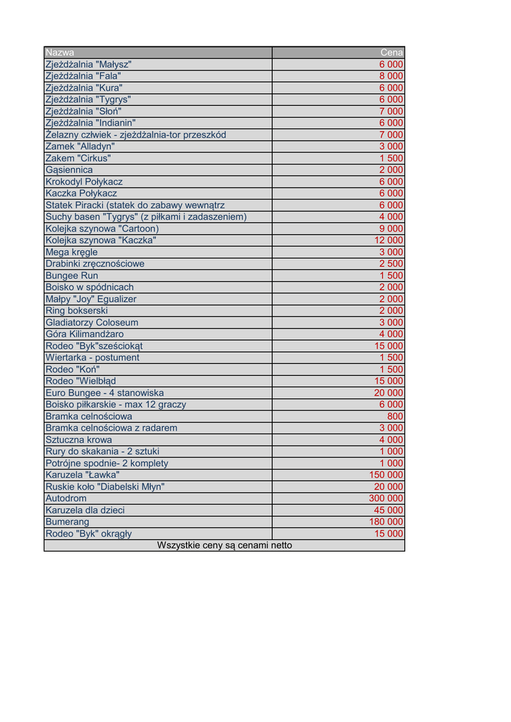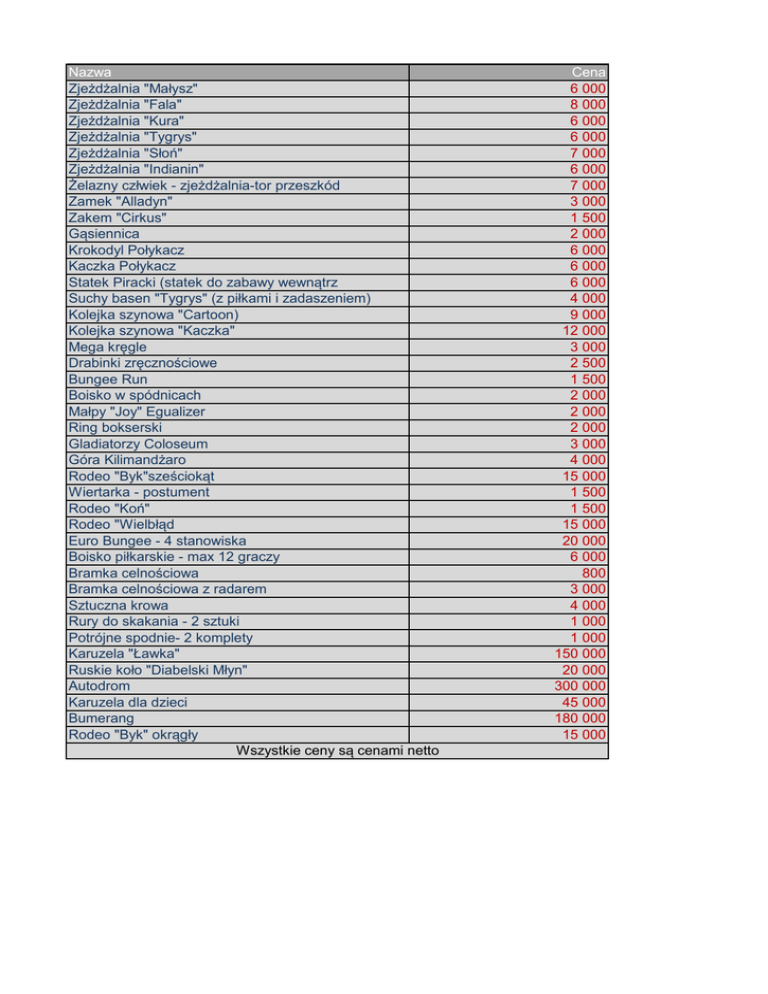 Nazwa Zjeżdżalnia "Małysz" Zjeżdżalnia "Fala" Zjeżdżalnia "Kura" Zjeżdżalnia "Tygrys" Zjeżdżalnia "Słoń" Zjeżdżalnia "Indianin" Żelazny człwiek - zjeżdżalnia-tor przeszkód Zamek "Alladyn" Zakem "Cirkus" Gąsiennica Krokodyl Połykacz Kaczka Połykacz Statek Piracki (statek do zabawy wewnątrz Suchy basen "Tygrys" (z piłkami i zadaszeniem) Kolejka szynowa "Cartoon) Kolejka szynowa "Kaczka" Mega kręgle Drabinki zręcznościowe Bungee Run Boisko w spódnicach Małpy "Joy" Egualizer Ring bokserski Gladiatorzy Coloseum Góra Kilimandżaro Rodeo "Byk"sześciokąt Wiertarka - postument Rodeo "Koń" Rodeo "Wielbłąd Euro Bungee - 4 stanowiska Boisko piłkarskie - max 12 graczy Bramka celnościowa Bramka celnościowa z radarem Sztuczna krowa Rury do skakania - 2 sztuki Potrójne spodnie- 2 komplety Karuzela "Ławka" Ruskie koło "Diabelski Młyn" Autodrom Karuzela dla dzieci Bumerang Rodeo "Byk" okrągły Wszystkie ceny są cenami netto Cena 6 000 8 000 6 000 6 000 7 000 6 000 7 000 3 000 1 500 2 000 6 000 6 000 6 000 4 000 9 000 12 000 3 000 2 500 1 500 2 000 2 000 2 000 3 000 4 000 15 000 1 500 1 500 15 000 20 000 6 000 800 3 000 4 000 1 000 1 000 150 000 20 000 300 000 45 000 180 000 15 000