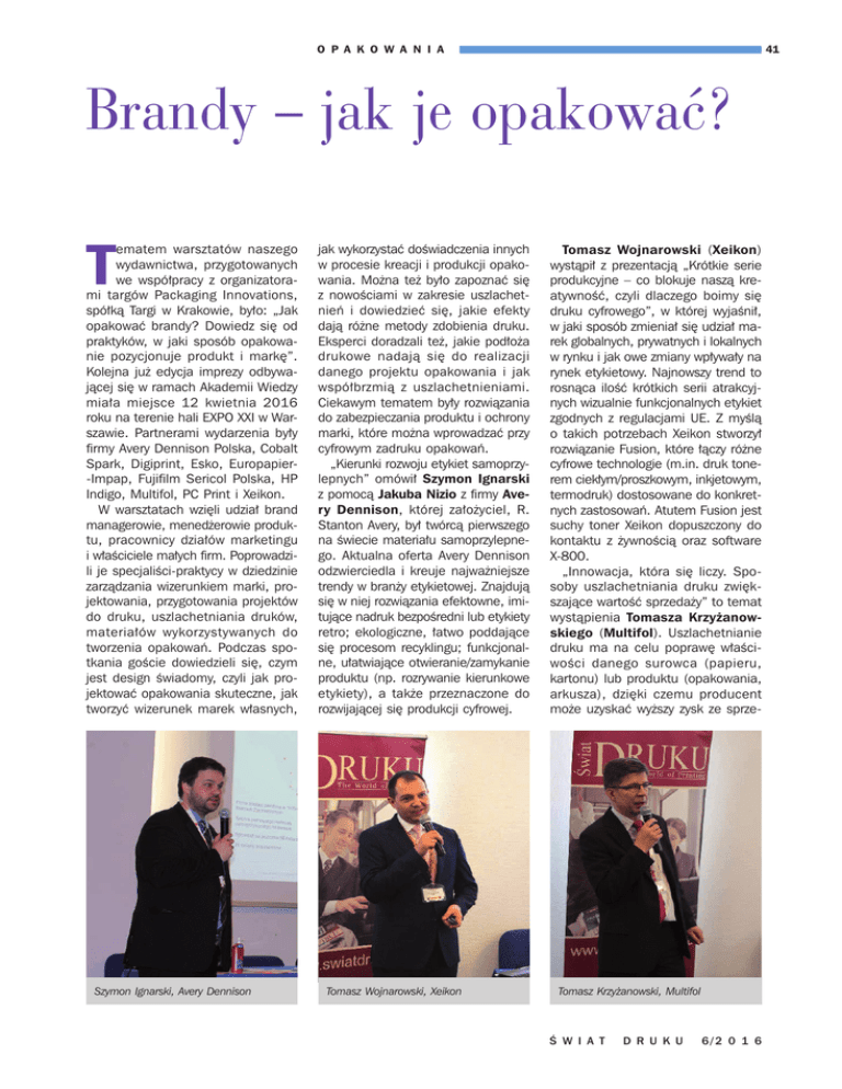 O P A K O W A N I A 41 Brandy – jak je opakować? T ematem warsztatów naszego wydawnictwa, przygotowanych we współpracy z organizatorami targów Packaging Innovations, spółką Targi w Krakowie, było: „Jak opakować brandy? Dowiedz się od praktyków, w jaki sposób opakowanie pozycjonuje produkt i markę”. Kolejna już edycja imprezy odbywającej się w ramach Akademii Wiedzy miała miejsce 12 kwietnia 2016 roku na terenie hali EXPO XXI w Warszawie. Partnerami wydarzenia były firmy Avery Dennison Polska, Cobalt Spark, Digiprint, Esko, Europapier-Impap, Fujifilm Sericol Polska, HP Indigo, Multifol, PC Print i Xeikon. W warsztatach wzięli udział brand managerowie, menedżerowie produktu, pracownicy działów marketingu i właściciele małych firm. Poprowadzili je specjaliści-praktycy w dziedzinie zarządzania wizerunkiem marki, projektowania, przygotowania projektów do druku, uszlachetniania druków, materiałów wykorzystywanych do tworzenia opakowań. Podczas spotkania goście dowiedzieli się, czym jest design świadomy, czyli jak projektować opakowania skuteczne, jak tworzyć wizerunek marek własnych, Szymon Ignarski, Avery Dennison jak wykorzystać doświadczenia innych w procesie kreacji i produkcji opakowania. Można też było zapoznać się z nowościami w zakresie uszlachetnień i dowiedzieć się, jakie efekty dają różne metody zdobienia druku. Eksperci doradzali też, jakie podłoża drukowe nadają się do realizacji danego projektu opakowania i jak współbrzmią z uszlachetnieniami. Ciekawym tematem były rozwiązania do zabezpieczania produktu i ochrony marki, które można wprowadzać przy cyfrowym zadruku opakowań. „Kierunki rozwoju etykiet samoprzylepnych” omówił Szymon Ignarski z pomocą Jakuba Nizio z firmy Avery Dennison, której założyciel, R. Stanton Avery, był twórcą pierwszego na świecie materiału samoprzylepnego. Aktualna oferta Avery Dennison odzwierciedla i kreuje najważniejsze trendy w branży etykietowej. Znajdują się w niej rozwiązania efektowne, imitujące nadruk bezpośredni lub etykiety retro; ekologiczne, łatwo poddające się procesom recyklingu; funkcjonalne, ułatwiające otwieranie/zamykanie produktu (np. rozrywanie kierunkowe etykiety), a także przeznaczone do rozwijającej się produkcji cyfrowej. Tomasz Wojnarowski, Xeikon Tomasz Wojnarowski (Xeikon) wystąpił z prezentacją „Krótkie serie produkcyjne – co blokuje naszą kreatywność, czyli dlaczego boimy się druku cyfrowego”, w której wyjaśnił, w jaki sposób zmieniał się udział marek globalnych, prywatnych i lokalnych w rynku i jak owe zmiany wpływały na rynek etykietowy. Najnowszy trend to rosnąca ilość krótkich serii atrakcyjnych wizualnie funkcjonalnych etykiet zgodnych z regulacjami UE. Z myślą o takich potrzebach Xeikon stworzył rozwiązanie Fusion, które łączy różne cyfrowe technologie (m.in. druk tonerem ciekłym/proszkowym, inkjetowym, termodruk) dostosowane do konkretnych zastosowań. Atutem Fusion jest suchy toner Xeikon dopuszczony do kontaktu z żywnością oraz software X-800. „Innowacja, która się liczy. Sposoby uszlachetniania druku zwiększające wartość sprzedaży” to temat wystąpienia Tomasza Krzyżanowskiego (Multifol). Uszlachetnianie druku ma na celu poprawę właściwości danego surowca (papieru, kartonu) lub produktu (opakowania, arkusza), dzięki czemu producent może uzyskać wyższy zysk ze sprze- Tomasz Krzyżanowski, Multifol Ś W I A T D R U K U 6/2 0 1 6 O P A K O W A N I A 42 Steve Wood, Fujifilm Speciality Inks Systems daży uszlachetnionego produktu oraz poszerzyć swoją ofertę. Firma Multifol podczas tegorocznego wystąpienia promowała technologię laser effect (lakier plus motyw zdobiący), lakier holograficzny (odciśnięcie wzoru holograficznego na powierzchni arkusza) i kalandrowanie. „Cyfrowy druk niskonakładowych materiałów POS” był tematem wystąpienia Steve’a Wooda (Fujifilm Speciality Inks Systems), które tłumaczył Aleksander Smerczek (Fujifilm Sericol Polska). Rynek tektury falistej rośnie i zmienia się dynamicznie (krótsze nakłady i presja cięcia kosztów), a tradycyjne techniki druku nie są cenowo konkurencyjne w produkcji krótkich nakładów. Rozwiązania Fujifilm do druku UV – modułowa drukarka Onset X (manualna lub w pełni zautomatyzowana) wyposażona w specjalistyczne gło- Aleksander Smerczek, Fujifilm Sericol Polska wice drukujące w połączeniu z elastycznymi atramentami Uvijet OL/ LM o wysokim połysku – pozwalają różnicować produkcję opakowań i materiałów POS i sięgać po wyższe marże. Agnieszka Cegła i Artur Domian (Europapier-Impap) wystąpili z prezentacją „Jakie opakowanie jest trendy? Czy papier ma znaczenie?”. Opakowanie, które jest trendy, musi wpisywać się w nurt zrównoważonego rozwoju, więc rośnie udział w rynku opakowań z ekologicznymi certyfikatami FSC/PEFC. Klienci oczekują opakowań na wynos i o zwiększonej funkcjonalności, estetycznych i wyróżniających się wyglądem, dostosowanych do indywidualnych potrzeb. Oferta Europapier-Impap obejmuje lekkie i wytrzymałe materiały, znakomitej jakości powierzchnie do druku, wykonane z włókien pierwot- Agnieszka Cegła i Artur Domian, Europapier-Impap Ś W I A T D R U K U 6/2 0 1 6 Łukasz Szymański, Digiprint PL nych i wtórnych, które pozwalają na stworzenie takich produktów (w tym luksusowych opakowań). Są to m.in. zróżnicowane linery do kaszerowania, których właściwości zostały wyczerpująco omówione podczas spotkania. „Produkcja opakowań w rozszerzonym gamucie – wyzwania i korzyści” to temat, który – w kontekście rozwiązań firmy Esko dla przygotowalni, do zarządzania barwą czy druku proofów – omówił Łukasz Szymański (Digiprint PL). Zauważył, że główne kłopoty producentów opakowań to duża ilość odpadu, małych zleceń, wysokie koszty takiej produkcji oraz długi czas zmiany prac (50–60% cza