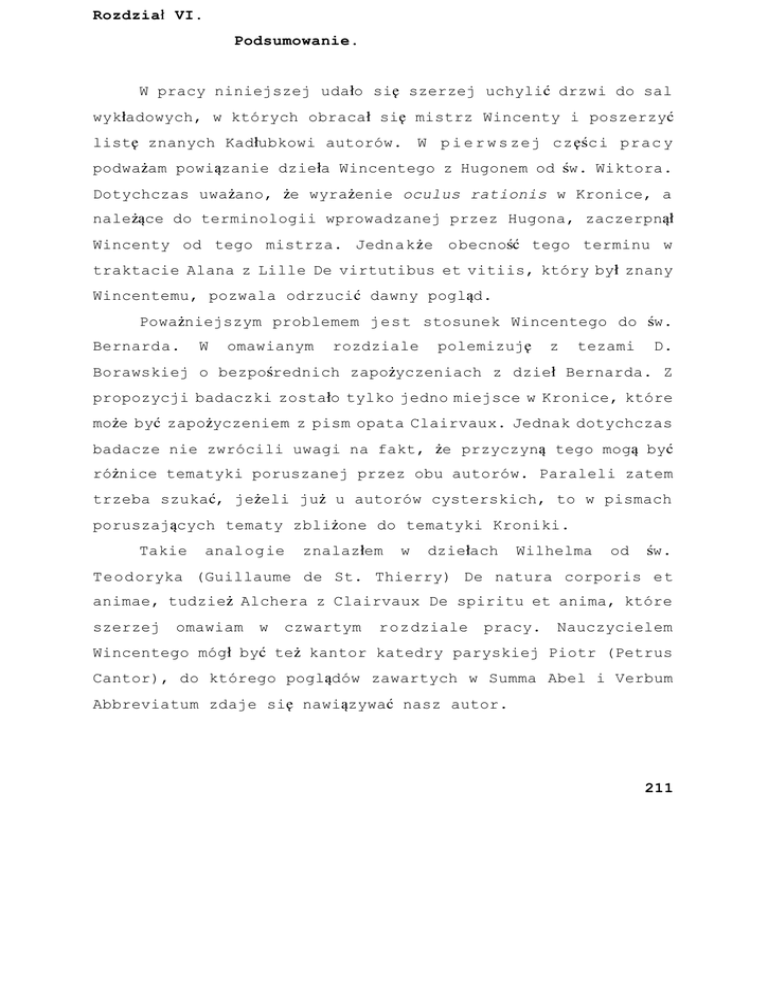 Rozdzia» VI. Podsumowanie. W pracy niniejszej uda»o si szerzej uchyli drzwi do sal wyk»adowych, w których obraca» si mistrz Wincenty i poszerzy list znanych Kad»ubkowi autorów. W p i e r w s zej czÑci prac y podwaóam powizanie dzie»a Wincentego z Hugonem od Ñw. Wiktora. Dotychczas uwaóano, óe wyraóenie oculus rationis w Kronice, a naleóce do terminologii wprowadzanej przez Hugona, zaczerpn» Wincenty od tego mistrza. Jednakóe obecnoÑ tego terminu w traktacie Alana z Lille De virtutibus et vitiis, który by» znany Wincentemu, pozwala odrzuci dawny pogld. Powaóniejszym problemem jest stosunek Wincentego do Ñw. Bernarda. W omawianym rozdziale polemizuj z tezami D. Borawskiej o bezpoÑrednich zapoóyczeniach z dzie» Bernarda. Z propozycji badaczki zosta»o tylko jedno miejsce w Kronice, które moóe by zapoóyczeniem z pism opata Clairvaux. Jednak dotychczas badacze nie zwrócili uwagi na fakt, óe przyczyn tego mog by róónice tematyki poruszanej przez obu autorów. Paraleli zatem trzeba szuka, jeóeli juó u autorów cysterskich, to w pismach poruszajcych tematy zblióone do tematyki Kroniki. Takie analogie znalaz»em w dzie»ach Wilhelma od Ñw. Teodoryka (Guillaume de St. Thierry) De natura corporis et animae, tudzieó Alchera z Clairvaux De spiritu et anima, które szerzej omawiam w czwartym rozdziale pracy. Nauczycielem Wincentego móg» by teó kantor katedry paryskiej Piotr (Petrus Cantor), do którego pogldów zawartych w Summa Abel i Verbum Abbreviatum zdaje si nawizywa nasz autor. 211 Nie branym dotd pod uwag w analizach dzie»em jest Radulfa Nigra De re militari et triplici via peregrinationis Ierosolomitane. W omawianym rozdziale próbuj wskaza, na Ñlady znajomoÑci tego dzie»a w Kronice. Radulf, który by» znajomym Gerwazego z Tilbury, móg» dostarczy temu autorowi infor macji na temat Polski przekazanych potem w jego Otia imperalia. Na Paryó jako miejsce studiów Wincentego wskazuje teó formu»a pokory w intytulacji biskupiej Wincentego, któr pos»ugiwa» si teó Maurycy z Sully, biskup Paryóa, w czasie zagranicznych studiów Wincentego w jednym ze swoich wczeÑniejszych dokumentów. Jednak podobnie podpisywa» si jako biskup Chartres autor bliószy Kad»ubkowi - Jan z Salisbury. Z dzie» samego Alana, których znajomoÑci zdaje si wykazywa mistrz Wincenty wskaza»em De articulis catholicae fidei - monitum oraz kazanie o Krzyóu Pa½skim. Mimo zastrzeóe½ podnoszonych przez D. Borawsk uda»o mi si udowodni pochodzenie definicji cnoty zawartej w Kronice z dzie»a Alana z Lille Tractatus de virtutibus et vitiis et de donis spiritus sancti. Wbrew polemikom D. Borawskiej potwierdzi»em dawno obserwowan zaleónoÑ Kad»ubka od Jana z Salisbury, a mianowicie od jego Polikratyka. Nietypowa opisujc definicja dokonania sprawiedliwoÑci, Grakcha, pochodzi, jak da» Kad»ubek jak uda»o mi si stwierdzi, z dzie»a Placentinusa Summa Institutionum. 1 Równieó uwaga: Nemo tamen misericors, nisi iustus; nemo iustus nisi misericors: nam iustitia sine misericordia, crudelitas et misericordia sine iustitia fatuitas est (III3). nie pochodzi z Jana Z»otoustego 90 homilii o ewangelii Ñw. Mateusza. Ma ona, jak uwaóam, inne ïród»o. Pochodzi ona z dzie»a Radulfa Ardensa Speculum universale: quoniam iustitia sine clementia crudelitas est sicut et clementia sine iustitia laxitas et iniustitia1. MyÑl Wincentego II,2 Kroniki: Verus homo falsus fieri per falsa meretur (...) wywodzi si jak sdz z dzie»a Anzelm z Canterbury Dialogus de veritate. Przyk»adem wp»ywu form scholastycznych na Kronik jest wprowadzenie do jej tekstu rozwaóa½ sformu»owanych w formie quaestio. Przyk»ad tego mamy w rozdzia»ach 6 i 7 ks.II, w ramach replik Mateusza - postawienie problemu i Jana - rozwinicie i rozwizanie quaestio. Postawienie problemu rozpoczyna si fraz: Nam, ut ex ipso gentilitatis ritu praesumitur, si superstitiosa sunt tonsurae libamina, cur superiore miraculo videntur consecrata? Takie postawienie problemu spe»nia - dodajmy tu jeszcze wymagania stawiane przez Gilberta de la Porée dla quaestio: Non omnis contradictio quaestio est. Cum enim altera (pars contradictionis) nulla prorsus habere argumenta veritatis videtur (...), tunc contradictio non est quaestio2. Przy rozwizaniu tego problemu mamy powo»anie si na autorytety Pisma Ðwitego i prawa rzymskiego. Ca»oÑ ko½czy si sentencj, w której zgodnie z duchem epoki »czy si ratio i religio. OczywiÑcie samo stawianie problemu nawizuje tu do retorycznych status. Widzimy 2 tu jednak równieó usamodzielnienie si tych zasad w stosunku do retoryki, to co potem rozwinie si w samodzielne quaestiones disputatae. W czwartej czÑci pracy omawiam wizj Ñwiata zawart w Kronice. Poniewaó mamy niejednorodnym, analiza pitrach. wic Mamy tu do czynienia koncentruje poziom si opowieÑci z jakby materia»em na trzech tradycyjnych blisko zwizanych z rozmaicie rozumianym mitem, poziom koncepcji odwo»ujcych si do ówczesnej nauki o cz»owieku i pa½stwie i poziom analizy odwo»ujcych si do koncepcji etycznych. Musz zaznaczy, óe przedstawiona analiza nie wyczerpuje tematu. Podobnie jak poprzednio, stara»em si da przyk»ad analizy tekstowej wychodzcej od jednego dzie»a a jednoczeÑnie nie zamykajcej si tylko na wybranych fragmentach, co oczywiÑcie nie oznacza, óe jest to jedyny rodzaj dopuszczalnej analizy. I tak przy analizie opowieÑci tradycyjnych odnoszcych si do dziejów bajecznych ograniczam si tylko do analizy samej Kroniki Wincentego nie biorc pod uwag innych ïróde». Staram si tu dotrze do tych przekszta»ce½, które wprowadzi» do tradycyjnych opowieÑci sam autor bdï krg z którego wychodzi». Tu upatruj ïród»a podwojenia pewnych motywów. Z drugiej zaÑ strony analiza wewntrzna prowadzi mnie do odrzucenia pewnych hipotez Jacka Banaszkiewicza budowanych na bazie znanych koncepcji G.Dumézil'a, gdyó nie maj one uzasadnienia w tekÑcie. Przechodzc do ogólnych kategorii przedstawianego w Kronice Ñwiata, chcia»em p