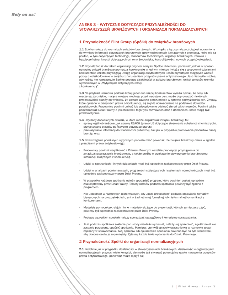 ANEKS 3 - WYTYCZNE DOTYCZĄCE PRZYNALEŻNOŚCI DO STOWARZYSZEŃ BRANŻOWYCH I ORGANIZACJI NORMALIZACYJNYCH 1 Przynależność Flint Group (Spółki) do związków branżowych 1.1 Spółka należy do rozmaitych związków branżowych. W związku z tą przynależnością jest uprawniona do wymiany informacji dotyczących branżowych spraw technicznych i związanych z promocją, które nie są poufne, w tym dotyczących technologii, standardów technicznych, regulacji branżowych, zdrowia i bezpieczeństwa, kwestii dotyczących ochrony środowiska, kontroli jakości, nowych przepisów/regulacji. 1.2 Przynależność do takich organizacji przynosi korzyści Spółce i klientom; ponieważ jednak w sposób naturalny związki branżowe gromadzą konkurencję w jednym miejscu i wiążą się z grupowymi działaniami konkurentów, często przyciągają uwagę organizacji antytrustowych i osób prywatnych mogących wnosić pozwy o odszkodowanie w związku z naruszeniem przepisów prawa antytrustowego. Jest niezwykle istotne, aby każdy, kto reprezentuje Spółkę podczas działalności w związku branżowym, unikał tematów rozmów wymienionych w „Wytycznych dotyczących relacji z konkurencją”. 1.3 Na przykład, rozmowa podczas której jeden lub więcej konkurentów wyraża opinię, że ceny lub marże są zbyt niskie, mająca miejsce niedługo przed wzrostem cen, może doprowadzić niektórych przedstawicieli branży do wniosku, że zostało zawarte porozumienie w sprawie podwyższenia cen. Zmowy, które opisano w przepisach prawa o konkurencji, są zwykle udawadnianie na podstawie dowodów poszlakowych. Pracownicy powinni unikać lub zdecydowanie odcinać się od takich rozmów. Powinni także poinformować Dział Prawny o jakichkolwiek tego typu rozmowach oraz o działaniach, które mogą być problematyczne. 1.4 Przykłady dozwolonych działań, w które może angażować związek branżowy, to: - sprawy ogólnobranżowe, jak sprawy REACH (prawo UE dotyczące stosowania substancji chemicznych), przygotowane przepisy państwowe dotyczące branży; - przekazywanie informacji do wiadomości publicznej, tak jak w przypadku promowania produktów danej branży; oraz 1.5 Przestrzeganie poniższych wytycznych pozwala mieć pewność, że związek branżowy działa w zgodzie z przepisami prawa antytrustowego: - Pracownicy powinni weryfikować z Działem Prawnym wszelkie propozycje przystąpienia do związku/stowarzyszenia branżowego, a także prośby o przekazanie stowarzyszeniu branżowemu informacji związanych z konkurencją. - Udział w spotkaniach i innych działaniach musi być uprzednio zaakceptowany przez Dział Prawny. - Udział w analizach porównawczych, programach statystycznych i systemach normotwórczych musi być uprzednio zaakceptowany przez Dział Prawny. - W przypadku każdego spotkania należy sporządzić program, który powinien zostać uprzednio zaakceptowany przez Dział Prawny. Tematy rozmów podczas spotkania powinny być zgodne z programem. - Nie uczestnicz w rozmowach nieformalnych, czy „poza protokołem” podczas omawiania tematów biznesowych na uroczystościach, ani w żadnej innej formalnej lub nieformalnej komunikacji z konkurentami. - Materiały pomocnicze, slajdy i inne materiały służące do prezentacji, których zamierzasz użyć, powinny być uprzednio zaakceptowane przez Dział Prawny. - Podczas wszystkich spotkań należy sporządzać szczegółowe i kompletne sprawozdania. - Jeśli podczas spotkania zostanie poruszony niewłaściwy temat, należy się sprzeciwić, a jeśli temat nie zostanie porzucony, opuścić spotkanie. Pamiętaj, że twój sprzeciw uczestnictwa w rozmowie został zapisany w sprawozdaniu. Twój sprzeciw lub opuszczenie spotkania powinno być na tyle stanowcze, aby obecne osoby je zapamiętały. Zgłaszaj każde takie wydarzenie do Działu Prawnego. 2 Przynależność Spółki do organizacji normalizacyjnych 2.1 Podobnie jak w przypadku działalności w stowarzyszeniach branżowych, działalność w organizacjach normalizacyjnych przynosi wiele korzyści, ale może też stwarzać potencjalne ryzyko naruszenia przepisów prawa antytrustowego, ponieważ może łączyć się 1 Flint Group: Annex 3 ze spotykaniem się konkurentów. Podane wyżej wytyczne odnoszące się do stowarzyszeń branżowych dotyczą także organizacji normalizacyjnych i należy brać je pod uwagę zawsze, gdy Spółka bierze udział w działaniach normotwórczych. 2.2 Zgodne z prawem działania normotwórcze przynoszą różnorodne korzyści klientom. Na przykład, mogą zwiększyć kompatybilność produktów i ich interoperacyjność, a także akceptację i stosowanie określonych technologii. Jednak, gdy konkurent lub grupa konkurentów używa procedur normotwórczych, aby w sposób nieodpowiedni wykluczyć inne podmioty gospodarcze z rynku lub zwiększyć ich koszty udziału w rynku, pojawiają się wątpliwości związane z przepisami prawa antytrustowego. Ostatnio urzędy antytrustowe podjęły również działania egzekucyjne w sprawie, w której członkowie organizacji normalizacyjnych nie ujawnili swojego prawa własności intelektualnej zanim została przyjęta norma, a następnie zażądali znacznych opłat licencyjnych od podmiotów, które starały się dostosować wytwarzane produkty do nowej normy. 2.3 Udział Spółki w jakichkolwiek działaniach normotwórczych musi być uprzednio zaakceptowany przez Dział Prawny i być zawsze zgodny z obowiązującymi regułami i procedurami przyjętymi przez organizacje normalizujące. 3. Niniejsze wytyczne uzupełniają Politykę Antytrustową („Politykę”). Tak jak w przypadku wszystkich pozostałych obszarów Polityki, żaden Pracownik Spółki nie jest upoważniony przez Spółkę, ani przez jakikolwiek inny podmiot do postępowania w sposób niezgodny z Wytycznymi i przepisami prawa antytrustowego. Flint Group: Annex 3 2
