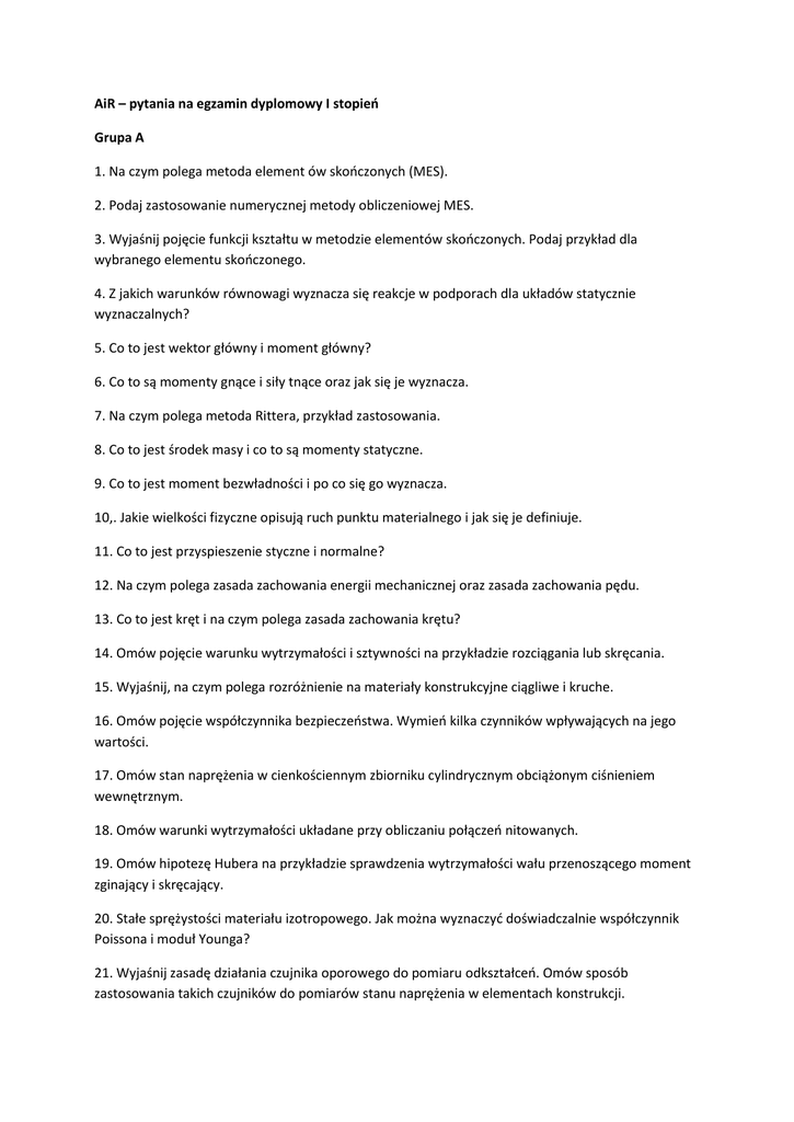 AiR – pytania na egzamin dyplomowy I stopieo Grupa A 1. Na czym polega metoda element ów skooczonych (MES). 2. Podaj zastosowanie numerycznej metody obliczeniowej MES. 3. Wyjaśnij pojęcie funkcji kształtu w metodzie elementów skooczonych. Podaj przykład dla wybranego elementu skooczonego. 4. Z jakich warunków równowagi wyznacza się reakcje w podporach dla układów statycznie wyznaczalnych? 5. Co to jest wektor główny i moment główny? 6. Co to są momenty gnące i siły tnące oraz jak się je wyznacza. 7. Na czym polega metoda Rittera, przykład zastosowania. 8. Co to jest środek masy i co to są momenty statyczne. 9. Co to jest moment bezwładności i po co się go wyznacza. 10,. Jakie wielkości fizyczne opisują ruch punktu materialnego i jak się je definiuje. 11. Co to jest przyspieszenie styczne i normalne? 12. Na czym polega zasada zachowania energii mechanicznej oraz zasada zachowania pędu. 13. Co to jest kręt i na czym polega zasada zachowania krętu? 14. Omów pojęcie warunku wytrzymałości i sztywności na przykładzie rozciągania lub skręcania. 15. Wyjaśnij, na czym polega rozróżnienie na materiały konstrukcyjne ciągliwe i kruche. 16. Omów pojęcie współczynnika bezpieczeostwa. Wymieo kilka czynników wpływających na jego wartości. 17. Omów stan naprężenia w cienkościennym zbiorniku cylindrycznym obciążonym ciśnieniem wewnętrznym. 18. Omów warunki wytrzymałości układane przy obliczaniu połączeo nitowanych. 19. Omów hipotezę Hubera na przykładzie sprawdzenia wytrzymałości wału przenoszącego moment zginający i skręcający. 20. Stałe sprężystości materiału izotropowego. Jak można wyznaczyd doświadczalnie współczynnik Poissona i moduł Younga? 21. Wyjaśnij zasadę działania czujnika oporowego do pomiaru odkształceo. Omów sposób zastosowania takich czujników do pomiarów stanu naprężenia w elementach konstrukcji. 22. Omów zjawisko zmęczenia materiałów konstrukcyjnych. 23. Na przykładzie prętów ściskanych wyjaśnij, na czym polega zjawisko utraty stateczności. 24. Jakie są podstawowe różnice między stalami a żeliwami niestopowymi? Jaka jest klasyfikacja obydwu grup stopów żelaza? 25. Co to są kompozyty? Jaki jest ich podział ze względu na postad łączonych materiałów? Jakie są typowe obszary zastosowao materiałów kompozytowych? 26. Co to są polimery? Jakie są charakterystyczne właściwości polimerów odróżniające je od metali i ceramiki? 27. Jaka jest idea wytwarzania kompozytów włóknistych? Jaka jest rola włókien w tych materiałach? Jakie cechy włókien mają wpływ na właściwości materiału kompozytowego? 28. Co to jest spiekana ceramika specjalna (Inżynierska)? Jakimi właściwościami różni się od szkła? 29. Co to jest granica plastyczności? Jakie stosuje się metody podwyższania granicy plastyczności metali? 30. Na jakie właściwości metali ma istotny wpływ wielkośd ziaren? Jakie stosuje się metody rozdrabniania ziaren w stopach metali? 31. Jaki parametr jest miarą sztywności materiałów? Jaka jest różnica między sztywnością metali a sztywnością polimerów? Jaki jest związek między sztywnością a temperaturą zeszklenia polimerów? 32. Jakie są różnice między stopami aluminium i stalami niestopowymi pod względem gęstości, modułu Younga, granicy plastyczności i odporności na korozję? 33. Jaki jest wpływ zawartości węgla na mikrostrukturę, właściwości mechaniczne stali i spawalnośd stali? W jaki sposób zawartośd węgla determinuje zastosowanie stali? 34. Jakie jednostki układu SI stosowane są w pomiarach elementów maszyn? 35. Klasyfikacja przyrządów pomiarowych stosowanych w pomiarach elementów maszyn. 36. Jakie rodzaje odchyłek obejmuje dokładnośd geometryczna wykonania części maszyn? 37. Co różni współrzędnościową technikę pomiarową od technik tradycyjnych? 38. Jak oznacza się wymiary tolerowane na rysunku? Podaj przykłady. 39. Wyjaśnij na przykładzie co to jest pasowanie i podaj jakie są rodzaje pasowania. 40. Co to są cechy metrologiczne narzędzi pomiarowych? Co to jest legalizacja narzędzi pomiarowych? 41. Podaj nazwy i symbole tolerancji kształtu. Jak oznacza się tolerancje kształtu na rysunku? 42. Podaj nazwy i symbole tolerancji położenia i kierunku. Jak oznacza się te tolerancje na rysunku? 43. W jaki sposób na rysunku określa się wymagania w zakresie chropowatości powierzchni? 44. Podaj definicję lub interpretację najczęściej stosowanych parametrów chropowatości powierzchni. 45. Wymieo grupy przyczyn powstawania błędów pomiaru. 46. Co to są błędy systematyczne? Co to są błędy przypadkowe? Co to są błędy nadmierne? 47. Co to jest niepewnośd pomiarowa? Wyjaśnij pojęcia standardowa i rozszerzona niepewnośd pomiaru. Grupa B 1. Połączenia rozłączne. 2. Połączenia nierozłączne. 3. Obliczenia wytrzymałościowe i kształtowanie wałów. 4. Krzywa tarcia w łożysku ślizgowym. 5. Obliczenia i dobór łożyska tocznego. 6. Zasady łożyskowania wału dwupodporowego. 7. Sprzęgła sztywne. 8. Sprzęgła podatne. 9. Sprzęgła włączalne. 10. Obliczenia geometryczne i kształtowanie kół zębatych o zębach prostych. Zasada zazębienia 11. Przekładnia zębata dwu stopniowa walcowa z zębach prostych (schemat, zasada działania, przełożenie geometryczne, kinematyczne, dynamiczne). 12. Przekładnia ślimakowa (schemat, zasada działania, przełożenie). 13. Przekładnia pasowa z pasem klinowym. 14. Drgania giętne wału dwupodporowego. 15. Ruchliwośd mechanizmu, manipulatora o budowie szeregowej i równoległej - porównanie 16. Transformacje elementarne w przestrzeni (macierze), parametry Denavita-Hartenberga 17. Jakobian manipulatora na przykładzie układu płaskiego 18. Obróbka elektroerozyjna. 19. Materiały narzędziowe stosowane w obróbce wiórowej. 20. Szlifowanie bezkłowe. 21. Przeciąganie (obróbka ubytkowa). 22. Dogładzanie oscylacy