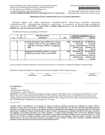 Komornik Sądowy przy Sądzie Rejonowym w Siemianowicach Śl. Dariusz Graca, Kancelaria Komornicza w Siemianowicach Śl. 41-106 Siemianowice Śląskie, ul. Józefa Bema 19 W odpowiedzi podać: sygn. akt Km 725/12 56156011080000935000067453 Getin Noble Bank SA I O. w Katowicach Siemianowice Śląskie, dnia 20.06.2012 r. *0012062000927* www.komornik.siemianowice-slaskie.com.pl [email protected] OBWIESZCZENIE O PIERWSZEJ LICYTACJI RUCHOMOŚCI Komornik Sądowy przy Sądzie Rejonowym w Siemianowicach Śl. Dariusz Graca, Kancelaria Komornicza w Siemianowicach Śl. w Siemianowicach Śląskich ul. Józefa Bema 19 na podstawie art. 867 kpc podaje do publicznej wiadomości, że w dniu 24.07.2012r. o godz 10:00 w siedzibie spółki Jazot sp. z o.o. ul. Witczaka 135 41-902 Bytom odbędzie się pierwsza licytacja ruchomości. Przedmiotem licytacji są następujące ruchomości: Nr prot. L.p. Opis licytowanej ruchomości 1 Ładowarka kołowa Atlas AR50 wraz z łyżką z zębami o poj. 0,7 m3 oraz widłami o dł. 1200 mm, nr seryjny 107295, r. produkcji 2009 2 minikoparka KUBOTA KX61-3 z trzema łyżkami, nr seryjny 77916, r. prod. 2010 ilość Wartość szacunkowa w zł. jednostkowa łączna 1,00 142.680,00 zł 142.680,00 zł (wartość (wartość brutto, zawiera brutto, zawiera podatek Vat podatek Vat 23%) 23%) 1,00 107.010,00 zł 107.010,00 zł (wartość (wartość brutto, zawiera brutto, zawiera podatek Vat podatek Vat 23%) 23%) Ceną wywoławczą każdej ruchomości w powyższej licytacji jest 3/4 wartości szacunkowej podanej w obwieszczeniu. Ruchomości będące przedmiotem niniejszej licytacji można oglądać w dniu i miejscu licytacji. asesor asesor komornik Michał Kupny Marcin Dudek Dariusz Graca Do wiadomości: - dłużnik; - pełnomocnik wierzyciela; - Sąd Rejonowy - tablica ogłoszeń Pouczenie: Na niniejszą czynność komornika przysługuje skarga do Sądu Rejonowego w Siemianowicach Śląskich, a jeżeli dłużnik ma miejsce zamieszkania bądź siedzibę poza obszarem tegoż Sądu Rejonowego do Sądu Rejonowego właściwego według miejsca zamieszkania bądź siedziby dłużnika (art.767§1 kpc). Skargę wnosi się do sądu w terminie tygodniowym od dnia zawiadomienia o dokonaniu tejże czynności (art. 767 kpc). (Sporządził: Lubera ) Licytacja odbywa się publicznie. W przetargu nie mogą uczestniczyć: dłużnik, komornik, ich małżonkowie, dzieci, rodzice i rodzeństwo, osoby obecne na licytacji w charakterze urzędowym oraz licytant, który nie wykonał warunków poprzedniej licytacji. Stawienie się jednego licytanta wystarcza do odbycia przetargu. Pełnomocnictwo do udziału w przetargu powinno być stwierdzone dokumentem z podpisem urzędowo poświadczonym, chyba że chodzi o pełnomocnictwo udzielone adwokatowi lub radcy prawnemu. Przystępujący do przetargu obowiązany jest złożyć rękojmię w wysokości jednej dziesiątej sumy oszacowania. Rękojmię złożoną przez licytanta, któremu udzielono przybicia, zatrzymuje się; pozostałym licytantom rękojmię zwraca się niezwłocznie. § 3. Jeżeli nabywca nie wykonał w terminie warunków licytacji co do zapłaty ceny, traci rękojmię, a skutki przybicia wygasają. Z utraconej rękojmi pokrywa się koszty egzekucji związanej ze sprzedażą, a reszta wchodzi w skład sumy uzyskanej w egzekucji albo jeżeli egzekucja została umorzona jest przelewana na dochód Skarbu Państwa.