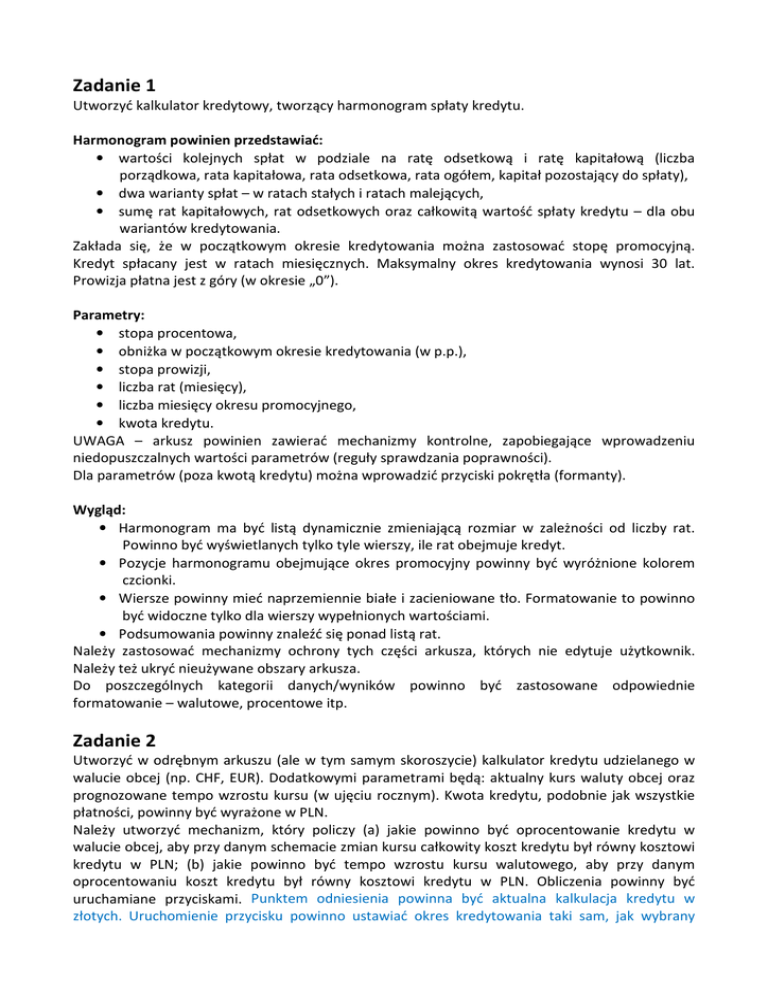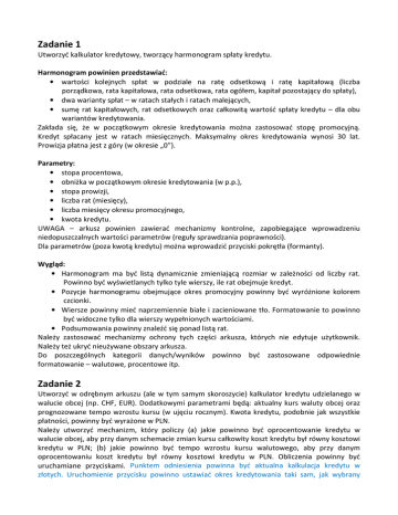 Zadanie 1 Utworzyć kalkulator kredytowy, tworzący harmonogram spłaty kredytu. Harmonogram powinien przedstawiać: • wartości kolejnych spłat w podziale na ratę odsetkową i ratę kapitałową (liczba porządkowa, rata kapitałowa, rata odsetkowa, rata ogółem, kapitał pozostający do spłaty), • dwa warianty spłat – w ratach stałych i ratach malejących, • sumę rat kapitałowych, rat odsetkowych oraz całkowitą wartość spłaty kredytu – dla obu wariantów kredytowania. Zakłada się, że w początkowym okresie kredytowania można zastosować stopę promocyjną. Kredyt spłacany jest w ratach miesięcznych. Maksymalny okres kredytowania wynosi 30 lat. Prowizja płatna jest z góry (w okresie „0”). Parametry: • stopa procentowa, • obniżka w początkowym okresie kredytowania (w p.p.), • stopa prowizji, • liczba rat (miesięcy), • liczba miesięcy okresu promocyjnego, • kwota kredytu. UWAGA – arkusz powinien zawierać mechanizmy kontrolne, zapobiegające wprowadzeniu niedopuszczalnych wartości parametrów (reguły sprawdzania poprawności). Dla parametrów (poza kwotą kredytu) można wprowadzić przyciski pokrętła (formanty). Wygląd: • Harmonogram ma być listą dynamicznie zmieniającą rozmiar w zależności od liczby rat. Powinno być wyświetlanych tylko tyle wierszy, ile rat obejmuje kredyt. • Pozycje harmonogramu obejmujące okres promocyjny powinny być wyróżnione kolorem czcionki. • Wiersze powinny mieć naprzemiennie białe i zacieniowane tło. Formatowanie to powinno być widoczne tylko dla wierszy wypełnionych wartościami. • Podsumowania powinny znaleźć się ponad listą rat. Należy zastosować mechanizmy ochrony tych części arkusza, których nie edytuje użytkownik. Należy też ukryć nieużywane obszary arkusza. Do poszczególnych kategorii danych/wyników powinno być zastosowane odpowiednie formatowanie – walutowe, procentowe itp. Zadanie 2 Utworzyć w odrębnym arkuszu (ale w tym samym skoroszycie) kalkulator kredytu udzielanego w walucie obcej (np. CHF, EUR). Dodatkowymi parametrami będą: aktualny kurs waluty obcej oraz prognozowane tempo wzrostu kursu (w ujęciu rocznym). Kwota kredytu, podobnie jak wszystkie płatności, powinny być wyrażone w PLN. Należy utworzyć mechanizm, który policzy (a) jakie powinno być oprocentowanie kredytu w walucie obcej, aby przy danym schemacie zmian kursu całkowity koszt kredytu był równy kosztowi kredytu w PLN; (b) jakie powinno być tempo wzrostu kursu walutowego, aby przy danym oprocentowaniu koszt kredytu był równy kosztowi kredytu w PLN. Obliczenia powinny być uruchamiane przyciskami. Punktem odniesienia powinna być aktualna kalkulacja kredytu w złotych. Uruchomienie przycisku powinno ustawiać okres kredytowania taki sam, jak wybrany aktualnie dla kredytu udzielanego w złotych. Symetryczny mechanizm „równoważenia” powinien zostać dodany na arkuszu kredytu złotowego (dostosowuje się w tym przypadku stopa procentowa). Zadanie 3 Dodać do skoroszytu tabelę kursów walutowych (dla pięciu wybranych walut). Tabela ta zawierać ma: symbol waluty, nazwę waluty, aktualny kurs oraz prognozowane roczne tempo wzrostu tego kursu. Należy zmodyfikować arkusz z zadania 2 w taki sposób, aby waluta kredytu wybierana była z listy. Jednocześnie dalej działać mają utworzone wcześniej mechanizmy „równoważenia” kredytu walutowego i złotowego. Zadanie 4 Należy utworzyć trzy grupy scenariuszy. Pierwsza grupa scenariuszy opisuje parametry kredytów złotowych – poza okresem kredytowania (utworzyć 2 scenariusze w ramach tej grupy, odpowiadające hipotetycznym ofertom dwóch banków). Druga grupa scenariuszy opisuje parametry kredytów walutowych, w tym symbol waluty – poza okresem kredytowania (utworzyć 3 scenariusze w ramach tej grupy, odpowiadające hipotetycznym ofertom dwóch banków). Trzecia grupa scenariuszy obejmuje prognozy tempa wzrostu kursów (utworzyć 2 scenariusze, odpowiadające prognozom dwóch różnych ekspertów). Dla większej czytelności scenariuszy zdefiniować nazwy komórek zawierających poszczególne parametry. Przetestować mechanizm przełączania scenariuszy.