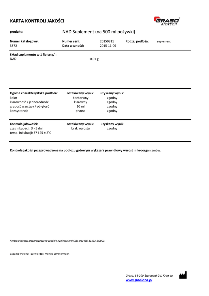 KARTA KONTROLI JAKOŚCI produkt: NAD Suplement (na 500 ml pożywki) Numer katalogowy: 3572 Numer serii: Data ważności: Skład suplementu w 1 fiolce g/l: NAD 20150811 2015-11-09 Rodzaj podłoża: suplement 0,01 g Ogólna charakterystyka podłoża: kolor klarowność / jednorodność grubość warstwy / objętość konsystencja oczekiwany wynik: bezbarwny klarowny 10 ml płynne uzyskany wynik: zgodny zgodny zgodny zgodny Kontrola jałowości: czas inkubacji: 3 - 5 dni temp. inkubacji: 37 i 25 ± 2˚C oczekiwany wynik: brak wzrostu uzyskany wynik: zgodny Kontrola jakości przeprowadzona na podłożu gotowym wykazała prawidłowy wzrost mikroorganizmów. Kontrola jakości przeprowadzona zgodnie z zaleceniami CLSI oraz ISO 11133-2:2003. Badania wykonał i zatwierdził: Monika Zimmermann Graso, 83-200 Starogard Gd, Krąg 4a www.podloza.pl