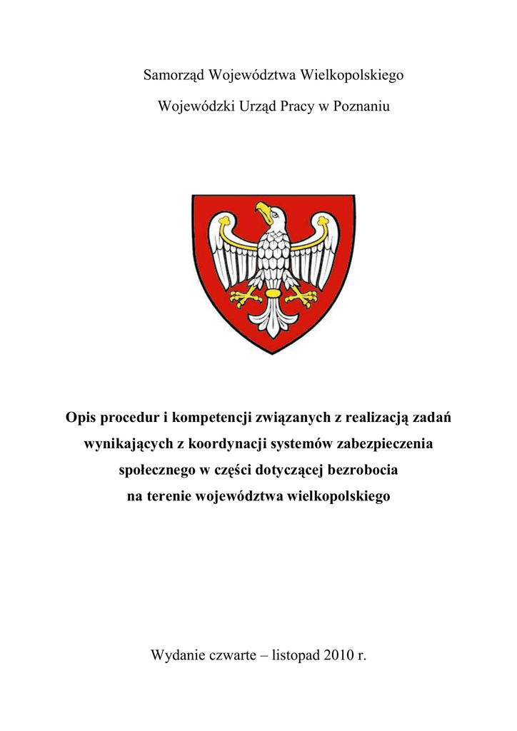 Samorząd Województwa Wielkopolskiego Wojewódzki Urząd Pracy w Poznaniu Opis procedur i kompetencji związanych z realizacją zadań wynikających z koordynacji systemów zabezpieczenia społecznego w części dotyczącej bezrobocia na terenie województwa wielkopolskiego Wydanie czwarte – listopad 2010 r. WSTĘP Stosownie do jednej z podstawowych zasad prawa Unii Europejskiej, czyli swobody przepływu pracowników, prawodawstwo unijne zapewnia osobom migrującym należytą ochronę w zakresie zabezpieczenia społecznego. Dzieje się tak po to, by uniknąć sytuacji, w której utrata uprawnień w kraju pochodzenia zniechęcałaby do podejmowania pracy za granicą. W ramach tej ochrony państwa Unii Europejskiej, Europejskiego Obszaru Gospodarczego oraz Szwajcaria wypracowały wspólnotową koordynację systemów zabezpieczenia społecznego, czyli całokształt środków i działań za pomocą, których każde państwo stara się zabezpieczyć obywateli w sferze socjalnej. Zadaniem tych działań jest wyeliminowanie skutków uczestniczenia obywateli przemieszczających się i podejmujących pracę zarobkową w ramach Wspólnoty, w różnych systemach zabezpieczenia społecznego w kilku Państwach Członkowskich. W maju 2004 roku Polska stała się formalnym członkiem Unii Europejskiej i tym samym zaczęła realizować zadania wynikające ze wspólnotowej koordynacji systemów zabezpieczenia społecznego. Zadania te w praktyce powierzono wojewódzkim i powiatowym urzędom pracy którym przydzielono odrębne kompetencje. Wojewódzki Urząd Pracy w Poznaniu wypracowując własne procedury postępowania w realizacji tych zadań, przede wszystkim miał na celu uproszczenie formalności, a w szczególności poprawę standardów usług oferowanych klientom urzędów pracy. Materiał ten został przygotowany do wykorzystania przez pracowników powiatowych urzędów pracy z terenu województwa wielkopolskiego realizujących zadania w zakresie koordynacji systemów zabezpieczenia społecznego. Celem jego jest usystematyzowanie wiedzy i wskazanie procedur związanych z ubieganiem się o dokumenty związane z zatrudnieniem / ubezpieczeniem / pracą na własny rachunek oraz ustaleniem świadczeń z tytułu bezrobocia na terenie województwa wielkopolskiego. W celu ułatwienia współpracy, w końcowej części materiału zamieszczone zostały dane teleadresowe pracowników Wojewódzkiego Urzędu Pracy w Poznaniu oraz Oddziałów Zamiejscowych WUP Poznań zajmujących się koordynacją systemów zabezpieczenia społecznego. 2 AKTY PRAWNE REGULUJĄCE ZABEZPIECZENIE SPOŁECZNE Koordynacja systemów zabezpieczenia społecznego w części dotyczącej ubezpieczeń na wypadek bezrobocia stanowi ważną część ustawodawstwa Unii Europejskiej dotyczącego wolnego przepływu pracowników. Podstawowe zasady koordynacji przepisów w części dotyczącej bezrobocia zostały sformułowane w następujących aktach prawnych Unii Europejskiej: 1. Rozporządzeniu (EWG) Nr 1408/71 z dnia 14 czerwca 1971 r. w sprawie stosowania systemów zabezpieczenia społecznego do pracowników, osób pracujących na własny rachunek i członków ich rodzin przemieszczających się w obrębie Wspólnoty (dotyczy Norwegii, Islandii, Lichtensteinu i Szwajcarii), 2. Rozporządzeniu (EWG) Nr 574/72 z dnia 21 marca 1972 r. w sprawie wykonania rozporządzenia Rady nr 1408/71/EWG sprawie stosowania systemów zabezpieczenia społecznego do pracowników, osób pracujących na własny rachunek i członków ich rodzin przemieszczających się w obrębie Wspólnoty (dotyczy Norwegii, Islandii, Lichtensteinu i Szwajcarii), Od 1 maja 2010 r. obowiązują nowe Rozporządzenia, w tym: 1. Rozporządzenie Parlamentu Europejskiego i Rady (WE) Nr 883/2004 z dnia 29 kwietnia 2004 r. w sprawie koordynacji systemów zabezpieczenia społecznego (Dz. Urz. UE L 2004 Nr 166) (dotyczy krajów UE), 2. Rozporządzenie Parlamentu Europejskiego i Rady nr 987/2009 z dnia 16 września 2009 r. dotyczące wykonywania rozporządzenia nr 883/2004 w sprawie koordynacji systemów zabezpieczenia społecznego (Dz. Urz. UE.L 2009 Nr 284) (dotyczy krajów UE). Zasady koordynacji świadczeń z tytułu bezrobocia ujmuje też ustawodawstwo polskie. Jest to ustawa z dnia 20 kwietnia 2004 r. o promocji zatrudnienia i instytucjach rynku pracy (tekst jednolity Dz. U. z 2008 r. Nr 69 poz. 415 z późn. zm.) wraz z przepisami wykonawczymi: - Rozporządzenie Ministra Pracy i Polityki Społecznej z dnia 14 września 2010 r. zmieniające rozporządzenie w sprawie szczegółowego trybu przyznawania zasiłku dla bezrobotnych, stypendium i dodatku aktywizacyjnego. 3 Wszelkie rozstrzygnięcia w ramach ww. przepisów podlegają polskim przepisom administracyjnym, w tym w szczególności: - w zakresie procedur rozpatrywania wniosków, podejmowania decyzji, terminów, odwołań, itp. – ustawie z dnia 14 czerwca 1960 r. kodeks postępowania administracyjnego (Dz. U. z 2000 r. Nr 98, poz. 1071 ze zm. ), - w zakresie sądowej kontroli wykonywania administracji publicznej – ustawie z dnia 25 lipca 2002 r. prawo o ustroju sądów administracyjnych (tekst jednolity Dz. U. Nr 98, poz. 1007) oraz ustawie z dnia 30 sierpnia 2002 r. prawo o postępowaniu przed sądami administracyjnymi (Dz. U. Nr 153, poz. 1270), - w zakresie ewidencjonowania i przechowywania dokumentów oraz innych czynności kancelaryjnych – rozporządzeniu Prezesa Rady Ministrów z dnia 18 grudnia 1998 r. w sprawie instrukcji kancelaryjnej dla organów samorządu województwa (Dz. U. Nr 160, poz. 1073 ze zm.). PODSTAWOWE DEFINICJE 1) właściwe władze oznaczają, w odniesieniu do każdego państwa członkowskiego, ministra, ministrów lub inne odpowiednie władze, którym podlegają na całym terytorium danego państwa lub jego części systemy zabezpieczenia społecznego, 2) instytucje łącznikowe oznaczają instytucje powołane przez właściwe władze, upoważnione do bezpośredniego komunikowania się między sobą, 