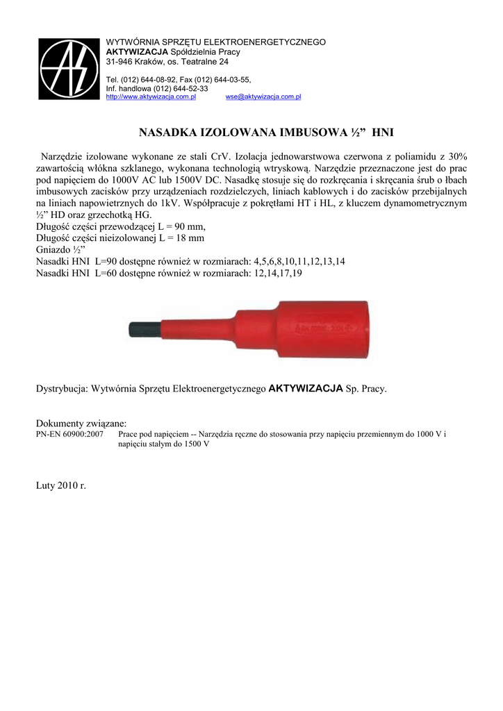 WYTWÓRNIA SPRZĘTU ELEKTROENERGETYCZNEGO AKTYWIZACJA Spółdzielnia Pracy 31-946 Kraków, os. Teatralne 24 Tel. (012) 644-08-92, Fax (012) 644-03-55, Inf. handlowa (012) 644-52-33 http://www.aktywizacja.com.pl [email protected] NASADKA IZOLOWANA IMBUSOWA ½” HNI Narzędzie izolowane wykonane ze stali CrV. Izolacja jednowarstwowa czerwona z poliamidu z 30% zawartością włókna szklanego, wykonana technologią wtryskową. Narzędzie przeznaczone jest do prac pod napięciem do 1000V AC lub 1500V DC. Nasadkę stosuje się do rozkręcania i skręcania śrub o łbach imbusowych zacisków przy urządzeniach rozdzielczych, liniach kablowych i do zacisków przebijalnych na liniach napowietrznych do 1kV. Współpracuje z pokrętłami HT i HL, z kluczem dynamometrycznym ½” HD oraz grzechotką HG. Długość części przewodzącej L = 90 mm, Długość części nieizolowanej L = 18 mm Gniazdo ½” Nasadki HNI L=90 dostępne równieŜ w rozmiarach: 4,5,6,8,10,11,12,13,14 Nasadki HNI L=60 dostępne równieŜ w rozmiarach: 12,14,17,19 Dystrybucja: Wytwórnia Sprzętu Elektroenergetycznego AKTYWIZACJA Sp. Pracy. Dokumenty związane: PN-EN 60900:2007 Prace pod napięciem -- Narzędzia ręczne do stosowania przy napięciu przemiennym do 1000 V i napięciu stałym do 1500 V Luty 2010 r. Wydanie V – waŜne od 08.2006r. 1